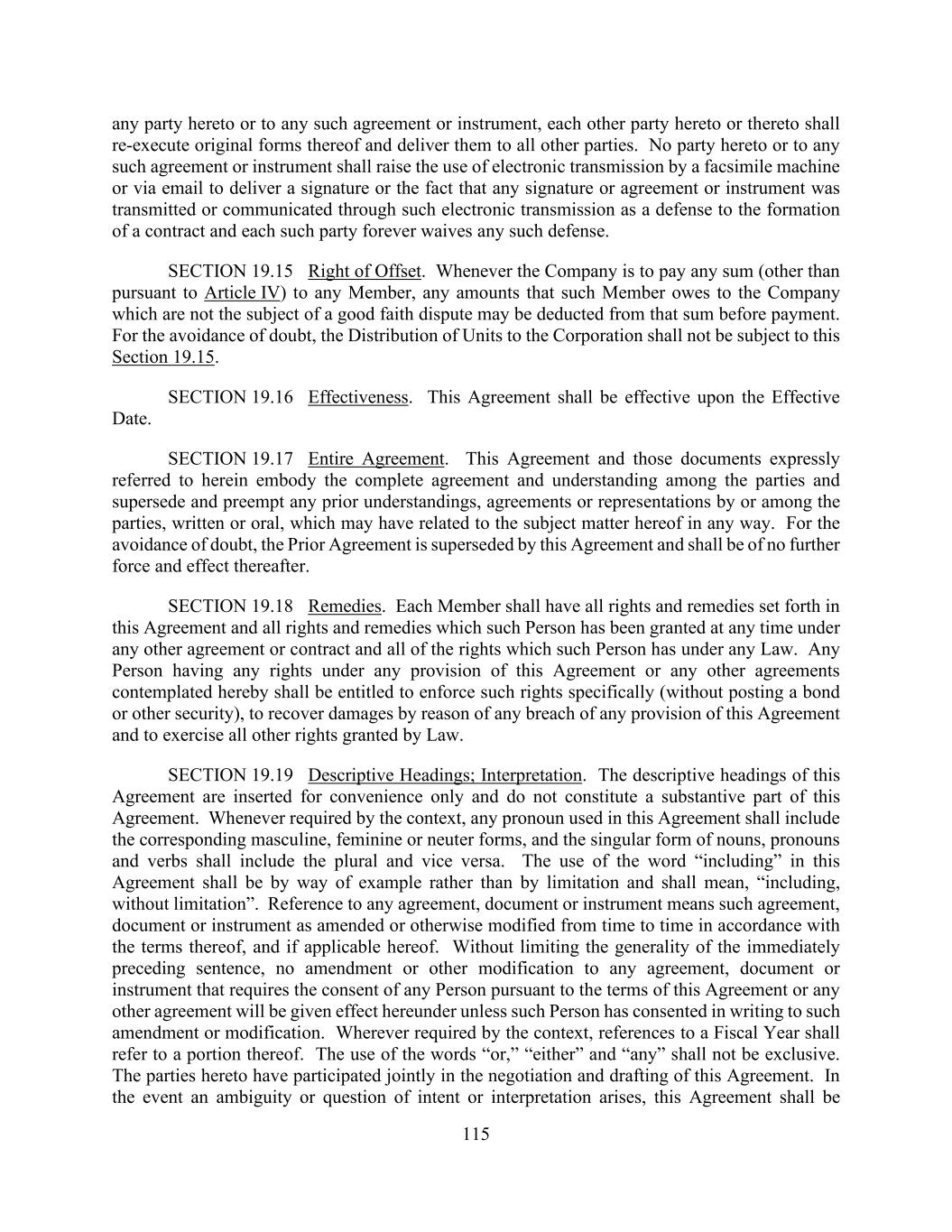 115 any party hereto or to any such agreement or instrument, each other party hereto or thereto shall re-execute original forms thereof and deliver them to all other parties. No party hereto or to any such agreement or instrument shall raise the use of electronic transmission by a facsimile machine or via email to deliver a signature or the fact that any signature or agreement or instrument was transmitted or communicated through such electronic transmission as a defense to the formation of a contract and each such party forever waives any such defense. SECTION 19.15 Right of Offset. Whenever the Company is to pay any sum (other than pursuant to Article IV) to any Member, any amounts that such Member owes to the Company which are not the subject of a good faith dispute may be deducted from that sum before payment. For the avoidance of doubt, the Distribution of Units to the Corporation shall not be subject to this Section 19.15. SECTION 19.16 Effectiveness. This Agreement shall be effective upon the Effective Date. SECTION 19.17 Entire Agreement. This Agreement and those documents expressly referred to herein embody the complete agreement and understanding among the parties and supersede and preempt any prior understandings, agreements or representations by or among the parties, written or oral, which may have related to the subject matter hereof in any way. For the avoidance of doubt, the Prior Agreement is superseded by this Agreement and shall be of no further force and effect thereafter. SECTION 19.18 Remedies. Each Member shall have all rights and remedies set forth in this Agreement and all rights and remedies which such Person has been granted at any time under any other agreement or contract and all of the rights which such Person has under any Law. Any Person having any rights under any provision of this Agreement or any other agreements contemplated hereby shall be entitled to enforce such rights specifically (without posting a bond or other security), to recover damages by reason of any breach of any provision of this Agreement and to exercise all other rights granted by Law. SECTION 19.19 Descriptive Headings; Interpretation. The descriptive headings of this Agreement are inserted for convenience only and do not constitute a substantive part of this Agreement. Whenever required by the context, any pronoun used in this Agreement shall include the corresponding masculine, feminine or neuter forms, and the singular form of nouns, pronouns and verbs shall include the plural and vice versa. The use of the word “including” in this Agreement shall be by way of example rather than by limitation and shall mean, “including, without limitation”. Reference to any agreement, document or instrument means such agreement, document or instrument as amended or otherwise modified from time to time in accordance with the terms thereof, and if applicable hereof. Without limiting the generality of the immediately preceding sentence, no amendment or other modification to any agreement, document or instrument that requires the consent of any Person pursuant to the terms of this Agreement or any other agreement will be given effect hereunder unless such Person has consented in writing to such amendment or modification. Wherever required by the context, references to a Fiscal Year shall refer to a portion thereof. The use of the words “or,” “either” and “any” shall not be exclusive. The parties hereto have participated jointly in the negotiation and drafting of this Agreement. In the event an ambiguity or question of intent or interpretation arises, this Agreement shall be