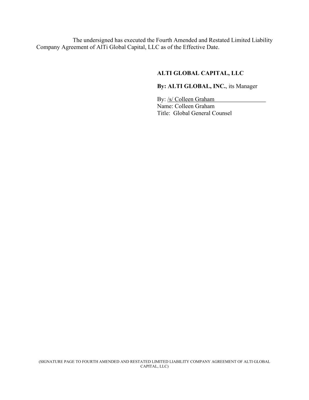 (SIGNATURE PAGE TO FOURTH AMENDED AND RESTATED LIMITED LIABILITY COMPANY AGREEMENT OF ALTI GLOBAL CAPITAL, LLC) The undersigned has executed the Fourth Amended and Restated Limited Liability Company Agreement of AlTi Global Capital, LLC as of the Effective Date. ALTI GLOBAL CAPITAL, LLC By: ALTI GLOBAL, INC., its Manager By: /s/ Colleen Graham Name: Colleen Graham Title: Global General Counsel