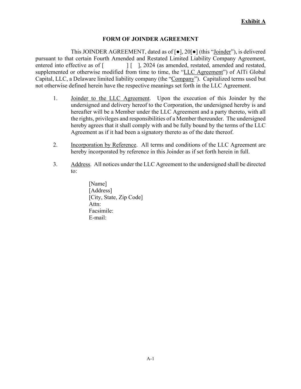 Exhibit A A-1 FORM OF JOINDER AGREEMENT This JOINDER AGREEMENT, dated as of [●], 20[●] (this “Joinder”), is delivered pursuant to that certain Fourth Amended and Restated Limited Liability Company Agreement, entered into effective as of [ ] [ ], 2024 (as amended, restated, amended and restated, supplemented or otherwise modified from time to time, the “LLC Agreement”) of AlTi Global Capital, LLC, a Delaware limited liability company (the “Company”). Capitalized terms used but not otherwise defined herein have the respective meanings set forth in the LLC Agreement. 1. Joinder to the LLC Agreement. Upon the execution of this Joinder by the undersigned and delivery hereof to the Corporation, the undersigned hereby is and hereafter will be a Member under the LLC Agreement and a party thereto, with all the rights, privileges and responsibilities of a Member thereunder. The undersigned hereby agrees that it shall comply with and be fully bound by the terms of the LLC Agreement as if it had been a signatory thereto as of the date thereof. 2. Incorporation by Reference. All terms and conditions of the LLC Agreement are hereby incorporated by reference in this Joinder as if set forth herein in full. 3. Address. All notices under the LLC Agreement to the undersigned shall be directed to: [Name] [Address] [City, State, Zip Code] Attn: Facsimile: E-mail: