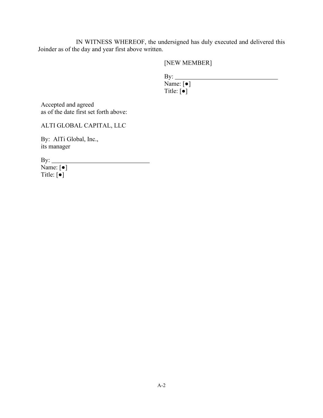 A-2 IN WITNESS WHEREOF, the undersigned has duly executed and delivered this Joinder as of the day and year first above written. [NEW MEMBER] By: Name: [●] Title: [●] Accepted and agreed as of the date first set forth above: ALTI GLOBAL CAPITAL, LLC By: AlTi Global, Inc., its manager By: Name: [●] Title: [●]