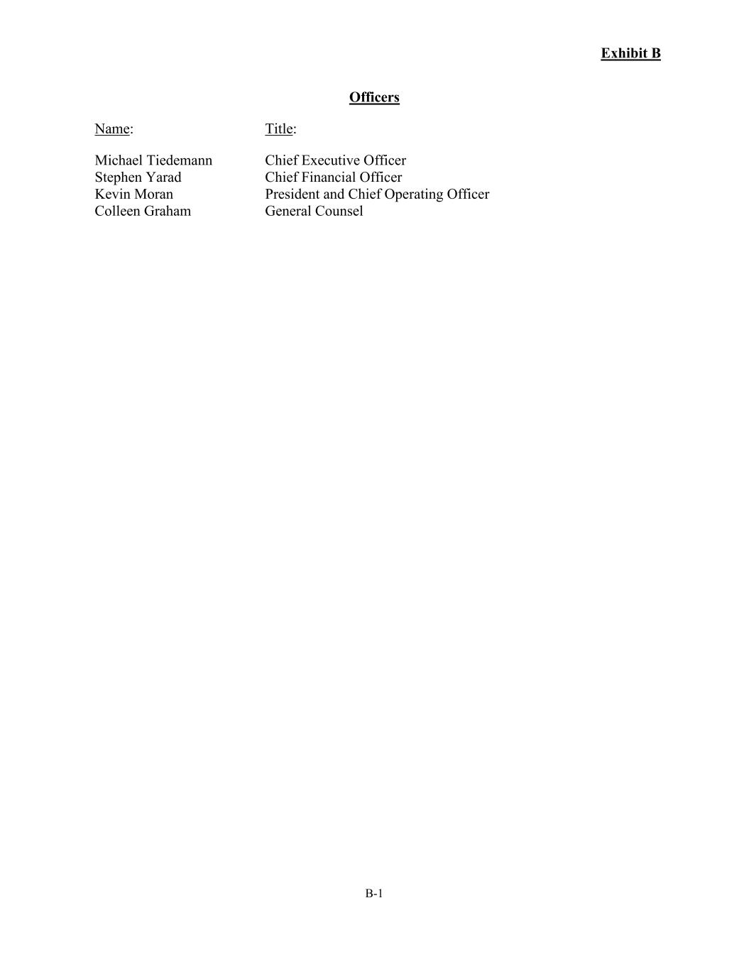 Exhibit B B-1 Officers Name: Title: Michael Tiedemann Chief Executive Officer Stephen Yarad Chief Financial Officer Kevin Moran Colleen Graham President and Chief Operating Officer General Counsel