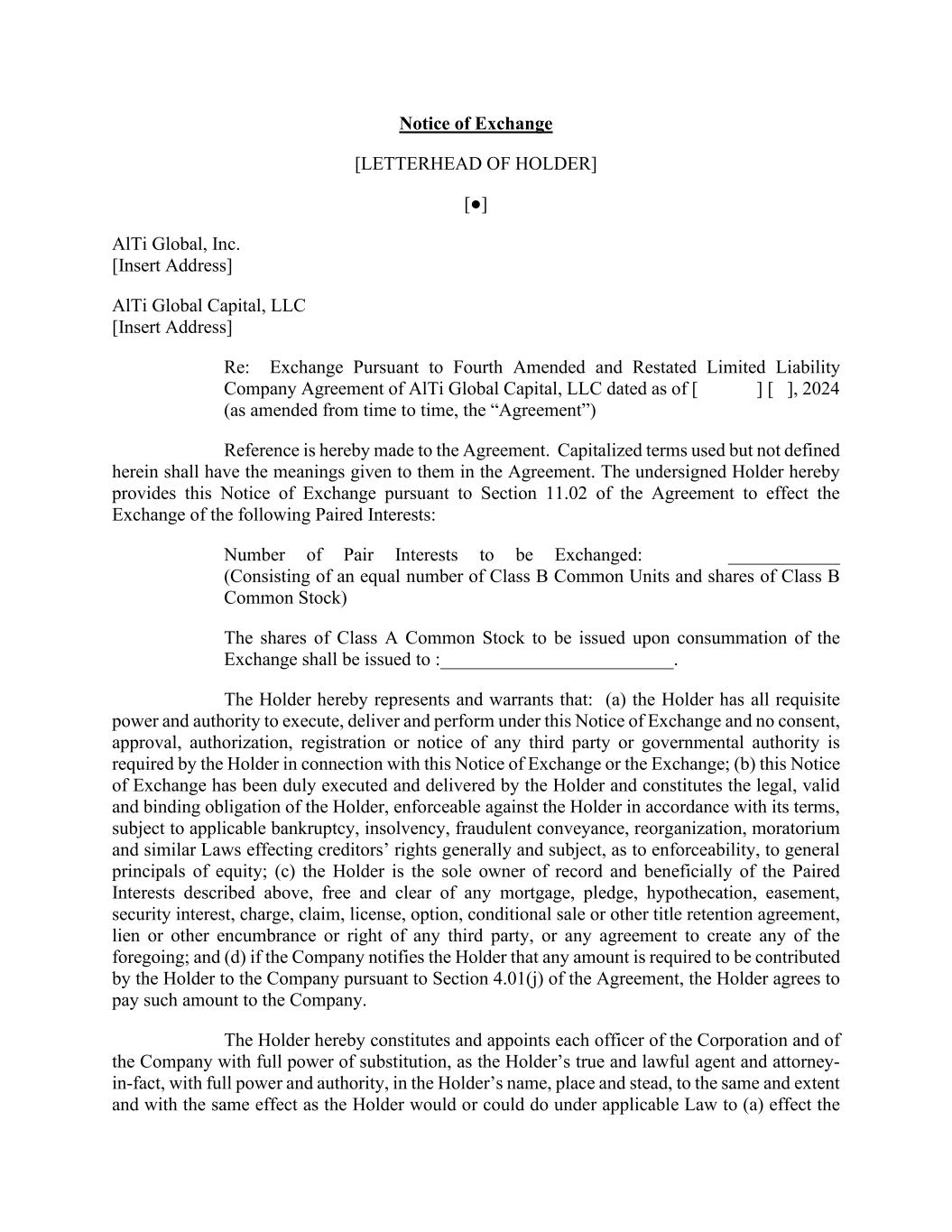 Notice of Exchange [LETTERHEAD OF HOLDER] [●] AlTi Global, Inc. [Insert Address] AlTi Global Capital, LLC [Insert Address] Re: Exchange Pursuant to Fourth Amended and Restated Limited Liability Company Agreement of AlTi Global Capital, LLC dated as of [ ] [ ], 2024 (as amended from time to time, the “Agreement”) Reference is hereby made to the Agreement. Capitalized terms used but not defined herein shall have the meanings given to them in the Agreement. The undersigned Holder hereby provides this Notice of Exchange pursuant to Section 11.02 of the Agreement to effect the Exchange of the following Paired Interests: Number of Pair Interests to be Exchanged: ____________ (Consisting of an equal number of Class B Common Units and shares of Class B Common Stock) The shares of Class A Common Stock to be issued upon consummation of the Exchange shall be issued to :_________________________. The Holder hereby represents and warrants that: (a) the Holder has all requisite power and authority to execute, deliver and perform under this Notice of Exchange and no consent, approval, authorization, registration or notice of any third party or governmental authority is required by the Holder in connection with this Notice of Exchange or the Exchange; (b) this Notice of Exchange has been duly executed and delivered by the Holder and constitutes the legal, valid and binding obligation of the Holder, enforceable against the Holder in accordance with its terms, subject to applicable bankruptcy, insolvency, fraudulent conveyance, reorganization, moratorium and similar Laws effecting creditors’ rights generally and subject, as to enforceability, to general principals of equity; (c) the Holder is the sole owner of record and beneficially of the Paired Interests described above, free and clear of any mortgage, pledge, hypothecation, easement, security interest, charge, claim, license, option, conditional sale or other title retention agreement, lien or other encumbrance or right of any third party, or any agreement to create any of the foregoing; and (d) if the Company notifies the Holder that any amount is required to be contributed by the Holder to the Company pursuant to Section 4.01(j) of the Agreement, the Holder agrees to pay such amount to the Company. The Holder hereby constitutes and appoints each officer of the Corporation and of the Company with full power of substitution, as the Holder’s true and lawful agent and attorney- in-fact, with full power and authority, in the Holder’s name, place and stead, to the same and extent and with the same effect as the Holder would or could do under applicable Law to (a) effect the
