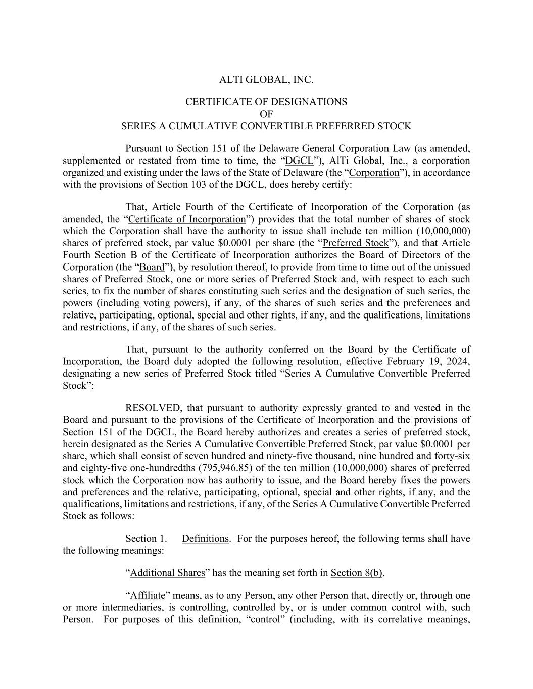 ALTI GLOBAL, INC. CERTIFICATE OF DESIGNATIONS OF SERIES A CUMULATIVE CONVERTIBLE PREFERRED STOCK Pursuant to Section 151 of the Delaware General Corporation Law (as amended, supplemented or restated from time to time, the “DGCL”), AlTi Global, Inc., a corporation organized and existing under the laws of the State of Delaware (the “Corporation”), in accordance with the provisions of Section 103 of the DGCL, does hereby certify: That, Article Fourth of the Certificate of Incorporation of the Corporation (as amended, the “Certificate of Incorporation”) provides that the total number of shares of stock which the Corporation shall have the authority to issue shall include ten million (10,000,000) shares of preferred stock, par value $0.0001 per share (the “Preferred Stock”), and that Article Fourth Section B of the Certificate of Incorporation authorizes the Board of Directors of the Corporation (the “Board”), by resolution thereof, to provide from time to time out of the unissued shares of Preferred Stock, one or more series of Preferred Stock and, with respect to each such series, to fix the number of shares constituting such series and the designation of such series, the powers (including voting powers), if any, of the shares of such series and the preferences and relative, participating, optional, special and other rights, if any, and the qualifications, limitations and restrictions, if any, of the shares of such series. That, pursuant to the authority conferred on the Board by the Certificate of Incorporation, the Board duly adopted the following resolution, effective February 19, 2024, designating a new series of Preferred Stock titled “Series A Cumulative Convertible Preferred Stock”: RESOLVED, that pursuant to authority expressly granted to and vested in the Board and pursuant to the provisions of the Certificate of Incorporation and the provisions of Section 151 of the DGCL, the Board hereby authorizes and creates a series of preferred stock, herein designated as the Series A Cumulative Convertible Preferred Stock, par value $0.0001 per share, which shall consist of seven hundred and ninety-five thousand, nine hundred and forty-six and eighty-five one-hundredths (795,946.85) of the ten million (10,000,000) shares of preferred stock which the Corporation now has authority to issue, and the Board hereby fixes the powers and preferences and the relative, participating, optional, special and other rights, if any, and the qualifications, limitations and restrictions, if any, of the Series A Cumulative Convertible Preferred Stock as follows: Section 1. Definitions. For the purposes hereof, the following terms shall have the following meanings: “Additional Shares” has the meaning set forth in Section 8(b). “Affiliate” means, as to any Person, any other Person that, directly or, through one or more intermediaries, is controlling, controlled by, or is under common control with, such Person. For purposes of this definition, “control” (including, with its correlative meanings,