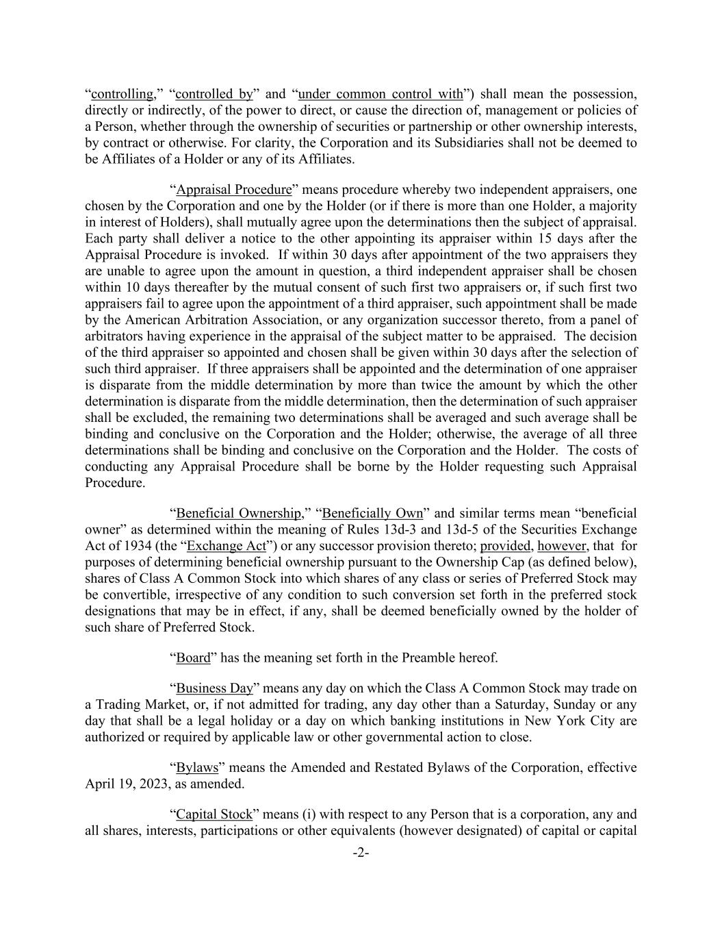 -2- “controlling,” “controlled by” and “under common control with”) shall mean the possession, directly or indirectly, of the power to direct, or cause the direction of, management or policies of a Person, whether through the ownership of securities or partnership or other ownership interests, by contract or otherwise. For clarity, the Corporation and its Subsidiaries shall not be deemed to be Affiliates of a Holder or any of its Affiliates. “Appraisal Procedure” means procedure whereby two independent appraisers, one chosen by the Corporation and one by the Holder (or if there is more than one Holder, a majority in interest of Holders), shall mutually agree upon the determinations then the subject of appraisal. Each party shall deliver a notice to the other appointing its appraiser within 15 days after the Appraisal Procedure is invoked. If within 30 days after appointment of the two appraisers they are unable to agree upon the amount in question, a third independent appraiser shall be chosen within 10 days thereafter by the mutual consent of such first two appraisers or, if such first two appraisers fail to agree upon the appointment of a third appraiser, such appointment shall be made by the American Arbitration Association, or any organization successor thereto, from a panel of arbitrators having experience in the appraisal of the subject matter to be appraised. The decision of the third appraiser so appointed and chosen shall be given within 30 days after the selection of such third appraiser. If three appraisers shall be appointed and the determination of one appraiser is disparate from the middle determination by more than twice the amount by which the other determination is disparate from the middle determination, then the determination of such appraiser shall be excluded, the remaining two determinations shall be averaged and such average shall be binding and conclusive on the Corporation and the Holder; otherwise, the average of all three determinations shall be binding and conclusive on the Corporation and the Holder. The costs of conducting any Appraisal Procedure shall be borne by the Holder requesting such Appraisal Procedure. “Beneficial Ownership,” “Beneficially Own” and similar terms mean “beneficial owner” as determined within the meaning of Rules 13d-3 and 13d-5 of the Securities Exchange Act of 1934 (the “Exchange Act”) or any successor provision thereto; provided, however, that for purposes of determining beneficial ownership pursuant to the Ownership Cap (as defined below), shares of Class A Common Stock into which shares of any class or series of Preferred Stock may be convertible, irrespective of any condition to such conversion set forth in the preferred stock designations that may be in effect, if any, shall be deemed beneficially owned by the holder of such share of Preferred Stock. “Board” has the meaning set forth in the Preamble hereof. “Business Day” means any day on which the Class A Common Stock may trade on a Trading Market, or, if not admitted for trading, any day other than a Saturday, Sunday or any day that shall be a legal holiday or a day on which banking institutions in New York City are authorized or required by applicable law or other governmental action to close. “Bylaws” means the Amended and Restated Bylaws of the Corporation, effective April 19, 2023, as amended. “Capital Stock” means (i) with respect to any Person that is a corporation, any and all shares, interests, participations or other equivalents (however designated) of capital or capital