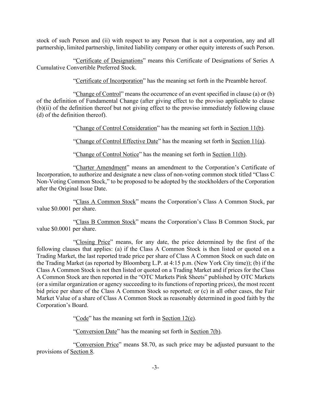 -3- stock of such Person and (ii) with respect to any Person that is not a corporation, any and all partnership, limited partnership, limited liability company or other equity interests of such Person. “Certificate of Designations” means this Certificate of Designations of Series A Cumulative Convertible Preferred Stock. “Certificate of Incorporation” has the meaning set forth in the Preamble hereof. “Change of Control” means the occurrence of an event specified in clause (a) or (b) of the definition of Fundamental Change (after giving effect to the proviso applicable to clause (b)(ii) of the definition thereof but not giving effect to the proviso immediately following clause (d) of the definition thereof). “Change of Control Consideration” has the meaning set forth in Section 11(b). “Change of Control Effective Date” has the meaning set forth in Section 11(a). “Change of Control Notice” has the meaning set forth in Section 11(b). “Charter Amendment” means an amendment to the Corporation’s Certificate of Incorporation, to authorize and designate a new class of non-voting common stock titled “Class C Non-Voting Common Stock,” to be proposed to be adopted by the stockholders of the Corporation after the Original Issue Date. “Class A Common Stock” means the Corporation’s Class A Common Stock, par value $0.0001 per share. “Class B Common Stock” means the Corporation’s Class B Common Stock, par value $0.0001 per share. “Closing Price” means, for any date, the price determined by the first of the following clauses that applies: (a) if the Class A Common Stock is then listed or quoted on a Trading Market, the last reported trade price per share of Class A Common Stock on such date on the Trading Market (as reported by Bloomberg L.P. at 4:15 p.m. (New York City time)); (b) if the Class A Common Stock is not then listed or quoted on a Trading Market and if prices for the Class A Common Stock are then reported in the “OTC Markets Pink Sheets” published by OTC Markets (or a similar organization or agency succeeding to its functions of reporting prices), the most recent bid price per share of the Class A Common Stock so reported; or (c) in all other cases, the Fair Market Value of a share of Class A Common Stock as reasonably determined in good faith by the Corporation’s Board. “Code” has the meaning set forth in Section 12(e). “Conversion Date” has the meaning set forth in Section 7(b). “Conversion Price” means $8.70, as such price may be adjusted pursuant to the provisions of Section 8.