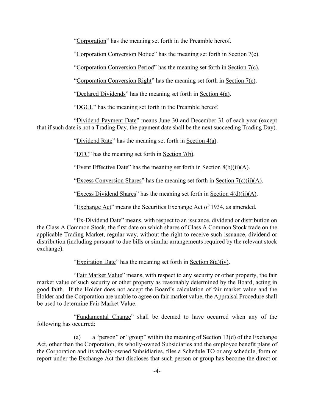-4- “Corporation” has the meaning set forth in the Preamble hereof. “Corporation Conversion Notice” has the meaning set forth in Section 7(c). “Corporation Conversion Period” has the meaning set forth in Section 7(c). “Corporation Conversion Right” has the meaning set forth in Section 7(c). “Declared Dividends” has the meaning set forth in Section 4(a). “DGCL” has the meaning set forth in the Preamble hereof. “Dividend Payment Date” means June 30 and December 31 of each year (except that if such date is not a Trading Day, the payment date shall be the next succeeding Trading Day). “Dividend Rate” has the meaning set forth in Section 4(a). “DTC” has the meaning set forth in Section 7(b). “Event Effective Date” has the meaning set forth in Section 8(b)(ii)(A). “Excess Conversion Shares” has the meaning set forth in Section 7(c)(ii)(A). “Excess Dividend Shares” has the meaning set forth in Section 4(d)(ii)(A). “Exchange Act” means the Securities Exchange Act of 1934, as amended. “Ex-Dividend Date” means, with respect to an issuance, dividend or distribution on the Class A Common Stock, the first date on which shares of Class A Common Stock trade on the applicable Trading Market, regular way, without the right to receive such issuance, dividend or distribution (including pursuant to due bills or similar arrangements required by the relevant stock exchange). “Expiration Date” has the meaning set forth in Section 8(a)(iv). “Fair Market Value” means, with respect to any security or other property, the fair market value of such security or other property as reasonably determined by the Board, acting in good faith. If the Holder does not accept the Board’s calculation of fair market value and the Holder and the Corporation are unable to agree on fair market value, the Appraisal Procedure shall be used to determine Fair Market Value. “Fundamental Change” shall be deemed to have occurred when any of the following has occurred: (a) a “person” or “group” within the meaning of Section 13(d) of the Exchange Act, other than the Corporation, its wholly-owned Subsidiaries and the employee benefit plans of the Corporation and its wholly-owned Subsidiaries, files a Schedule TO or any schedule, form or report under the Exchange Act that discloses that such person or group has become the direct or