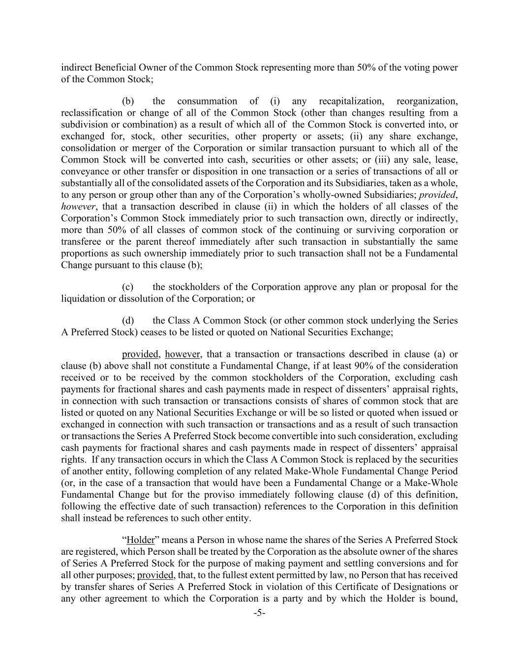 -5- indirect Beneficial Owner of the Common Stock representing more than 50% of the voting power of the Common Stock; (b) the consummation of (i) any recapitalization, reorganization, reclassification or change of all of the Common Stock (other than changes resulting from a subdivision or combination) as a result of which all of the Common Stock is converted into, or exchanged for, stock, other securities, other property or assets; (ii) any share exchange, consolidation or merger of the Corporation or similar transaction pursuant to which all of the Common Stock will be converted into cash, securities or other assets; or (iii) any sale, lease, conveyance or other transfer or disposition in one transaction or a series of transactions of all or substantially all of the consolidated assets of the Corporation and its Subsidiaries, taken as a whole, to any person or group other than any of the Corporation’s wholly-owned Subsidiaries; provided, however, that a transaction described in clause (ii) in which the holders of all classes of the Corporation’s Common Stock immediately prior to such transaction own, directly or indirectly, more than 50% of all classes of common stock of the continuing or surviving corporation or transferee or the parent thereof immediately after such transaction in substantially the same proportions as such ownership immediately prior to such transaction shall not be a Fundamental Change pursuant to this clause (b); (c) the stockholders of the Corporation approve any plan or proposal for the liquidation or dissolution of the Corporation; or (d) the Class A Common Stock (or other common stock underlying the Series A Preferred Stock) ceases to be listed or quoted on National Securities Exchange; provided, however, that a transaction or transactions described in clause (a) or clause (b) above shall not constitute a Fundamental Change, if at least 90% of the consideration received or to be received by the common stockholders of the Corporation, excluding cash payments for fractional shares and cash payments made in respect of dissenters’ appraisal rights, in connection with such transaction or transactions consists of shares of common stock that are listed or quoted on any National Securities Exchange or will be so listed or quoted when issued or exchanged in connection with such transaction or transactions and as a result of such transaction or transactions the Series A Preferred Stock become convertible into such consideration, excluding cash payments for fractional shares and cash payments made in respect of dissenters’ appraisal rights. If any transaction occurs in which the Class A Common Stock is replaced by the securities of another entity, following completion of any related Make-Whole Fundamental Change Period (or, in the case of a transaction that would have been a Fundamental Change or a Make-Whole Fundamental Change but for the proviso immediately following clause (d) of this definition, following the effective date of such transaction) references to the Corporation in this definition shall instead be references to such other entity. “Holder” means a Person in whose name the shares of the Series A Preferred Stock are registered, which Person shall be treated by the Corporation as the absolute owner of the shares of Series A Preferred Stock for the purpose of making payment and settling conversions and for all other purposes; provided, that, to the fullest extent permitted by law, no Person that has received by transfer shares of Series A Preferred Stock in violation of this Certificate of Designations or any other agreement to which the Corporation is a party and by which the Holder is bound,