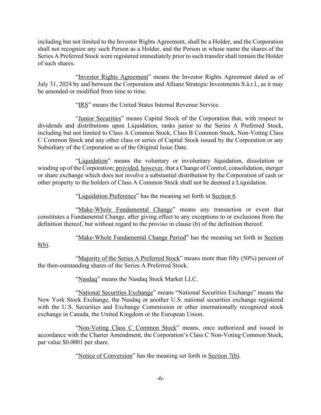 -6- including but not limited to the Investor Rights Agreement, shall be a Holder, and the Corporation shall not recognize any such Person as a Holder, and the Person in whose name the shares of the Series A Preferred Stock were registered immediately prior to such transfer shall remain the Holder of such shares. “Investor Rights Agreement” means the Investor Rights Agreement dated as of July 31, 2024 by and between the Corporation and Allianz Strategic Investments S.à.r.l., as it may be amended or modified from time to time. “IRS” means the United States Internal Revenue Service. “Junior Securities” means Capital Stock of the Corporation that, with respect to dividends and distributions upon Liquidation, ranks junior to the Series A Preferred Stock, including but not limited to Class A Common Stock, Class B Common Stock, Non-Voting Class C Common Stock and any other class or series of Capital Stock issued by the Corporation or any Subsidiary of the Corporation as of the Original Issue Date. “Liquidation” means the voluntary or involuntary liquidation, dissolution or winding up of the Corporation; provided, however, that a Change of Control, consolidation, merger or share exchange which does not involve a substantial distribution by the Corporation of cash or other property to the holders of Class A Common Stock shall not be deemed a Liquidation. “Liquidation Preference” has the meaning set forth in Section 6. “Make-Whole Fundamental Change” means any transaction or event that constitutes a Fundamental Change, after giving effect to any exceptions to or exclusions from the definition thereof, but without regard to the proviso in clause (b) of the definition thereof. “Make-Whole Fundamental Change Period” has the meaning set forth in Section 8(b). “Majority of the Series A Preferred Stock” means more than fifty (50%) percent of the then-outstanding shares of the Series A Preferred Stock. “Nasdaq” means the Nasdaq Stock Market LLC. “National Securities Exchange” means “National Securities Exchange” means the New York Stock Exchange, the Nasdaq or another U.S. national securities exchange registered with the U.S. Securities and Exchange Commission or other internationally recognized stock exchange in Canada, the United Kingdom or the European Union. “Non-Voting Class C Common Stock” means, once authorized and issued in accordance with the Charter Amendment, the Corporation’s Class C Non-Voting Common Stock, par value $0.0001 per share. “Notice of Conversion” has the meaning set forth in Section 7(b).
