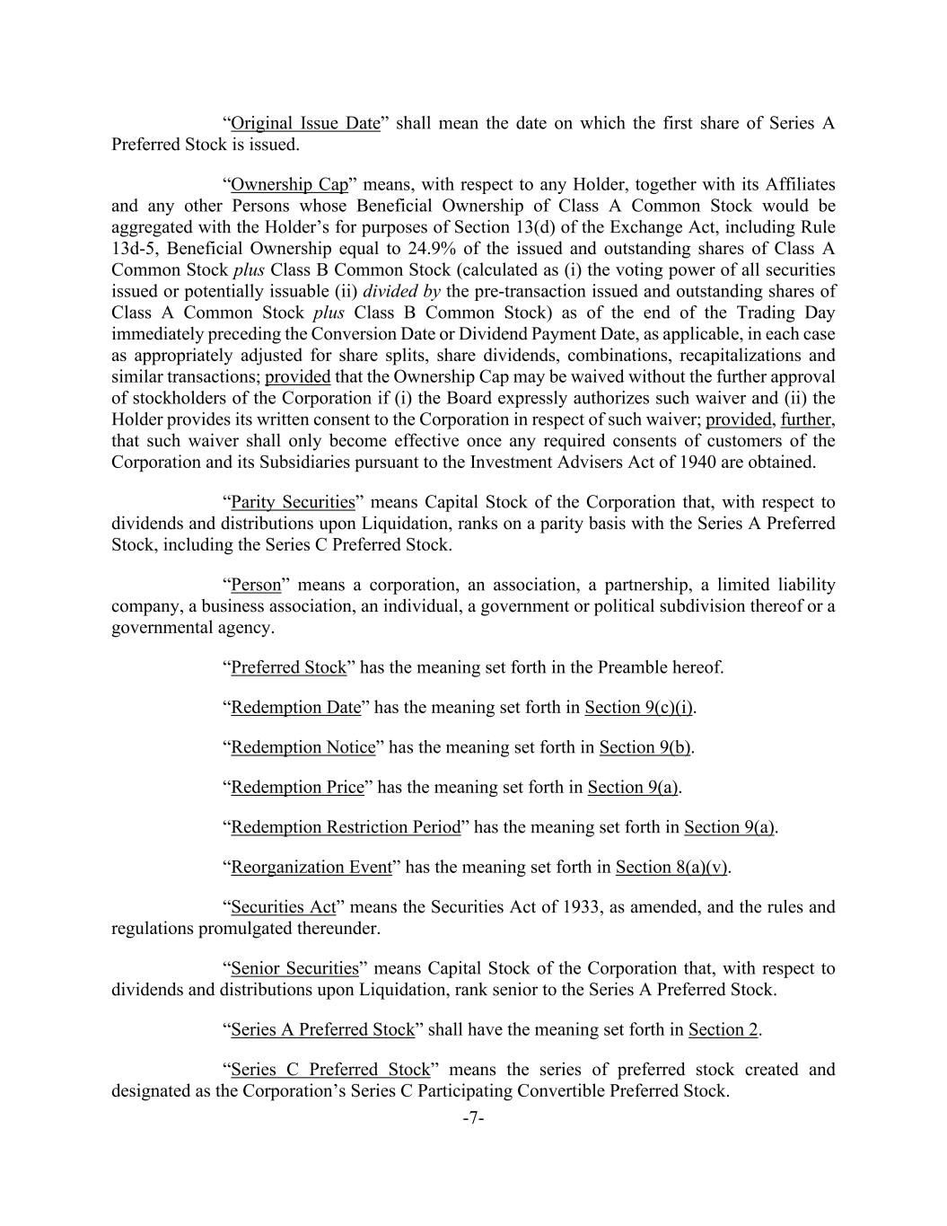 -7- “Original Issue Date” shall mean the date on which the first share of Series A Preferred Stock is issued. “Ownership Cap” means, with respect to any Holder, together with its Affiliates and any other Persons whose Beneficial Ownership of Class A Common Stock would be aggregated with the Holder’s for purposes of Section 13(d) of the Exchange Act, including Rule 13d-5, Beneficial Ownership equal to 24.9% of the issued and outstanding shares of Class A Common Stock plus Class B Common Stock (calculated as (i) the voting power of all securities issued or potentially issuable (ii) divided by the pre-transaction issued and outstanding shares of Class A Common Stock plus Class B Common Stock) as of the end of the Trading Day immediately preceding the Conversion Date or Dividend Payment Date, as applicable, in each case as appropriately adjusted for share splits, share dividends, combinations, recapitalizations and similar transactions; provided that the Ownership Cap may be waived without the further approval of stockholders of the Corporation if (i) the Board expressly authorizes such waiver and (ii) the Holder provides its written consent to the Corporation in respect of such waiver; provided, further, that such waiver shall only become effective once any required consents of customers of the Corporation and its Subsidiaries pursuant to the Investment Advisers Act of 1940 are obtained. “Parity Securities” means Capital Stock of the Corporation that, with respect to dividends and distributions upon Liquidation, ranks on a parity basis with the Series A Preferred Stock, including the Series C Preferred Stock. “Person” means a corporation, an association, a partnership, a limited liability company, a business association, an individual, a government or political subdivision thereof or a governmental agency. “Preferred Stock” has the meaning set forth in the Preamble hereof. “Redemption Date” has the meaning set forth in Section 9(c)(i). “Redemption Notice” has the meaning set forth in Section 9(b). “Redemption Price” has the meaning set forth in Section 9(a). “Redemption Restriction Period” has the meaning set forth in Section 9(a). “Reorganization Event” has the meaning set forth in Section 8(a)(v). “Securities Act” means the Securities Act of 1933, as amended, and the rules and regulations promulgated thereunder. “Senior Securities” means Capital Stock of the Corporation that, with respect to dividends and distributions upon Liquidation, rank senior to the Series A Preferred Stock. “Series A Preferred Stock” shall have the meaning set forth in Section 2. “Series C Preferred Stock” means the series of preferred stock created and designated as the Corporation’s Series C Participating Convertible Preferred Stock.