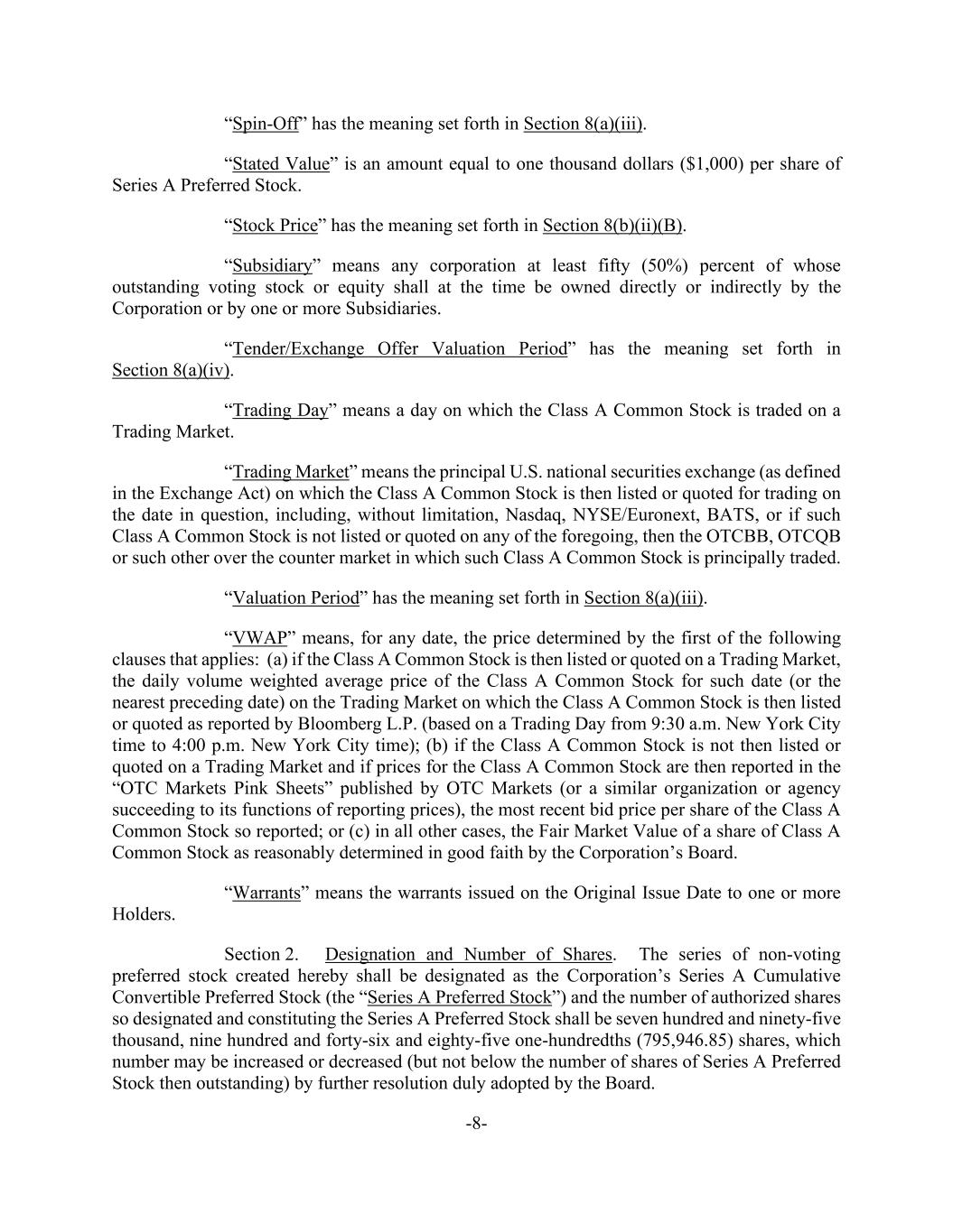 -8- “Spin-Off” has the meaning set forth in Section 8(a)(iii). “Stated Value” is an amount equal to one thousand dollars ($1,000) per share of Series A Preferred Stock. “Stock Price” has the meaning set forth in Section 8(b)(ii)(B). “Subsidiary” means any corporation at least fifty (50%) percent of whose outstanding voting stock or equity shall at the time be owned directly or indirectly by the Corporation or by one or more Subsidiaries. “Tender/Exchange Offer Valuation Period” has the meaning set forth in Section 8(a)(iv). “Trading Day” means a day on which the Class A Common Stock is traded on a Trading Market. “Trading Market” means the principal U.S. national securities exchange (as defined in the Exchange Act) on which the Class A Common Stock is then listed or quoted for trading on the date in question, including, without limitation, Nasdaq, NYSE/Euronext, BATS, or if such Class A Common Stock is not listed or quoted on any of the foregoing, then the OTCBB, OTCQB or such other over the counter market in which such Class A Common Stock is principally traded. “Valuation Period” has the meaning set forth in Section 8(a)(iii). “VWAP” means, for any date, the price determined by the first of the following clauses that applies: (a) if the Class A Common Stock is then listed or quoted on a Trading Market, the daily volume weighted average price of the Class A Common Stock for such date (or the nearest preceding date) on the Trading Market on which the Class A Common Stock is then listed or quoted as reported by Bloomberg L.P. (based on a Trading Day from 9:30 a.m. New York City time to 4:00 p.m. New York City time); (b) if the Class A Common Stock is not then listed or quoted on a Trading Market and if prices for the Class A Common Stock are then reported in the “OTC Markets Pink Sheets” published by OTC Markets (or a similar organization or agency succeeding to its functions of reporting prices), the most recent bid price per share of the Class A Common Stock so reported; or (c) in all other cases, the Fair Market Value of a share of Class A Common Stock as reasonably determined in good faith by the Corporation’s Board. “Warrants” means the warrants issued on the Original Issue Date to one or more Holders. Section 2. Designation and Number of Shares. The series of non-voting preferred stock created hereby shall be designated as the Corporation’s Series A Cumulative Convertible Preferred Stock (the “Series A Preferred Stock”) and the number of authorized shares so designated and constituting the Series A Preferred Stock shall be seven hundred and ninety-five thousand, nine hundred and forty-six and eighty-five one-hundredths (795,946.85) shares, which number may be increased or decreased (but not below the number of shares of Series A Preferred Stock then outstanding) by further resolution duly adopted by the Board.