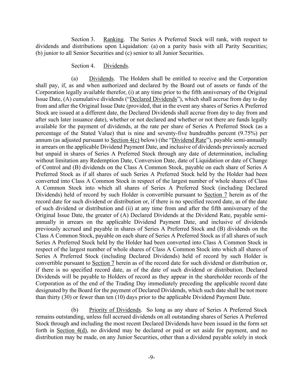 -9- Section 3. Ranking. The Series A Preferred Stock will rank, with respect to dividends and distributions upon Liquidation: (a) on a parity basis with all Parity Securities; (b) junior to all Senior Securities and (c) senior to all Junior Securities. Section 4. Dividends. (a) Dividends. The Holders shall be entitled to receive and the Corporation shall pay, if, as and when authorized and declared by the Board out of assets or funds of the Corporation legally available therefor, (i) at any time prior to the fifth anniversary of the Original Issue Date, (A) cumulative dividends (“Declared Dividends”), which shall accrue from day to day from and after the Original Issue Date (provided, that in the event any shares of Series A Preferred Stock are issued at a different date, the Declared Dividends shall accrue from day to day from and after such later issuance date), whether or not declared and whether or not there are funds legally available for the payment of dividends, at the rate per share of Series A Preferred Stock (as a percentage of the Stated Value) that is nine and seventy-five hundredths percent (9.75%) per annum (as adjusted pursuant to Section 4(c) below) (the “Dividend Rate”), payable semi-annually in arrears on the applicable Dividend Payment Date, and inclusive of dividends previously accrued but unpaid in shares of Series A Preferred Stock through any date of determination, including without limitation any Redemption Date, Conversion Date, date of Liquidation or date of Change of Control and (B) dividends on the Class A Common Stock, payable on each share of Series A Preferred Stock as if all shares of such Series A Preferred Stock held by the Holder had been converted into Class A Common Stock in respect of the largest number of whole shares of Class A Common Stock into which all shares of Series A Preferred Stock (including Declared Dividends) held of record by such Holder is convertible pursuant to Section 7 herein as of the record date for such dividend or distribution or, if there is no specified record date, as of the date of such dividend or distribution and (ii) at any time from and after the fifth anniversary of the Original Issue Date, the greater of (A) Declared Dividends at the Dividend Rate, payable semi- annually in arrears on the applicable Dividend Payment Date, and inclusive of dividends previously accrued and payable in shares of Series A Preferred Stock and (B) dividends on the Class A Common Stock, payable on each share of Series A Preferred Stock as if all shares of such Series A Preferred Stock held by the Holder had been converted into Class A Common Stock in respect of the largest number of whole shares of Class A Common Stock into which all shares of Series A Preferred Stock (including Declared Dividends) held of record by such Holder is convertible pursuant to Section 7 herein as of the record date for such dividend or distribution or, if there is no specified record date, as of the date of such dividend or distribution. Declared Dividends will be payable to Holders of record as they appear in the shareholder records of the Corporation as of the end of the Trading Day immediately preceding the applicable record date designated by the Board for the payment of Declared Dividends, which such date shall be not more than thirty (30) or fewer than ten (10) days prior to the applicable Dividend Payment Date. (b) Priority of Dividends. So long as any share of Series A Preferred Stock remains outstanding, unless full accrued dividends on all outstanding shares of Series A Preferred Stock through and including the most recent Declared Dividends have been issued in the form set forth in Section 4(d), no dividend may be declared or paid or set aside for payment, and no distribution may be made, on any Junior Securities, other than a dividend payable solely in stock
