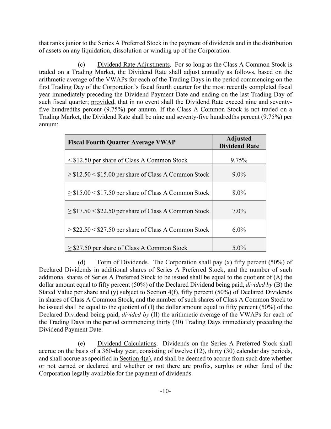 -10- that ranks junior to the Series A Preferred Stock in the payment of dividends and in the distribution of assets on any liquidation, dissolution or winding up of the Corporation. (c) Dividend Rate Adjustments. For so long as the Class A Common Stock is traded on a Trading Market, the Dividend Rate shall adjust annually as follows, based on the arithmetic average of the VWAPs for each of the Trading Days in the period commencing on the first Trading Day of the Corporation’s fiscal fourth quarter for the most recently completed fiscal year immediately preceding the Dividend Payment Date and ending on the last Trading Day of such fiscal quarter; provided, that in no event shall the Dividend Rate exceed nine and seventy- five hundredths percent (9.75%) per annum. If the Class A Common Stock is not traded on a Trading Market, the Dividend Rate shall be nine and seventy-five hundredths percent (9.75%) per annum: Fiscal Fourth Quarter Average VWAP Adjusted Dividend Rate < $12.50 per share of Class A Common Stock 9.75% ≥ $12.50 < $15.00 per share of Class A Common Stock 9.0% ≥ $15.00 < $17.50 per share of Class A Common Stock 8.0% ≥ $17.50 < $22.50 per share of Class A Common Stock 7.0% ≥ $22.50 < $27.50 per share of Class A Common Stock 6.0% ≥ $27.50 per share of Class A Common Stock 5.0% (d) Form of Dividends. The Corporation shall pay (x) fifty percent (50%) of Declared Dividends in additional shares of Series A Preferred Stock, and the number of such additional shares of Series A Preferred Stock to be issued shall be equal to the quotient of (A) the dollar amount equal to fifty percent (50%) of the Declared Dividend being paid, divided by (B) the Stated Value per share and (y) subject to Section 4(f), fifty percent (50%) of Declared Dividends in shares of Class A Common Stock, and the number of such shares of Class A Common Stock to be issued shall be equal to the quotient of (I) the dollar amount equal to fifty percent (50%) of the Declared Dividend being paid, divided by (II) the arithmetic average of the VWAPs for each of the Trading Days in the period commencing thirty (30) Trading Days immediately preceding the Dividend Payment Date. (e) Dividend Calculations. Dividends on the Series A Preferred Stock shall accrue on the basis of a 360-day year, consisting of twelve (12), thirty (30) calendar day periods, and shall accrue as specified in Section 4(a), and shall be deemed to accrue from such date whether or not earned or declared and whether or not there are profits, surplus or other fund of the Corporation legally available for the payment of dividends.