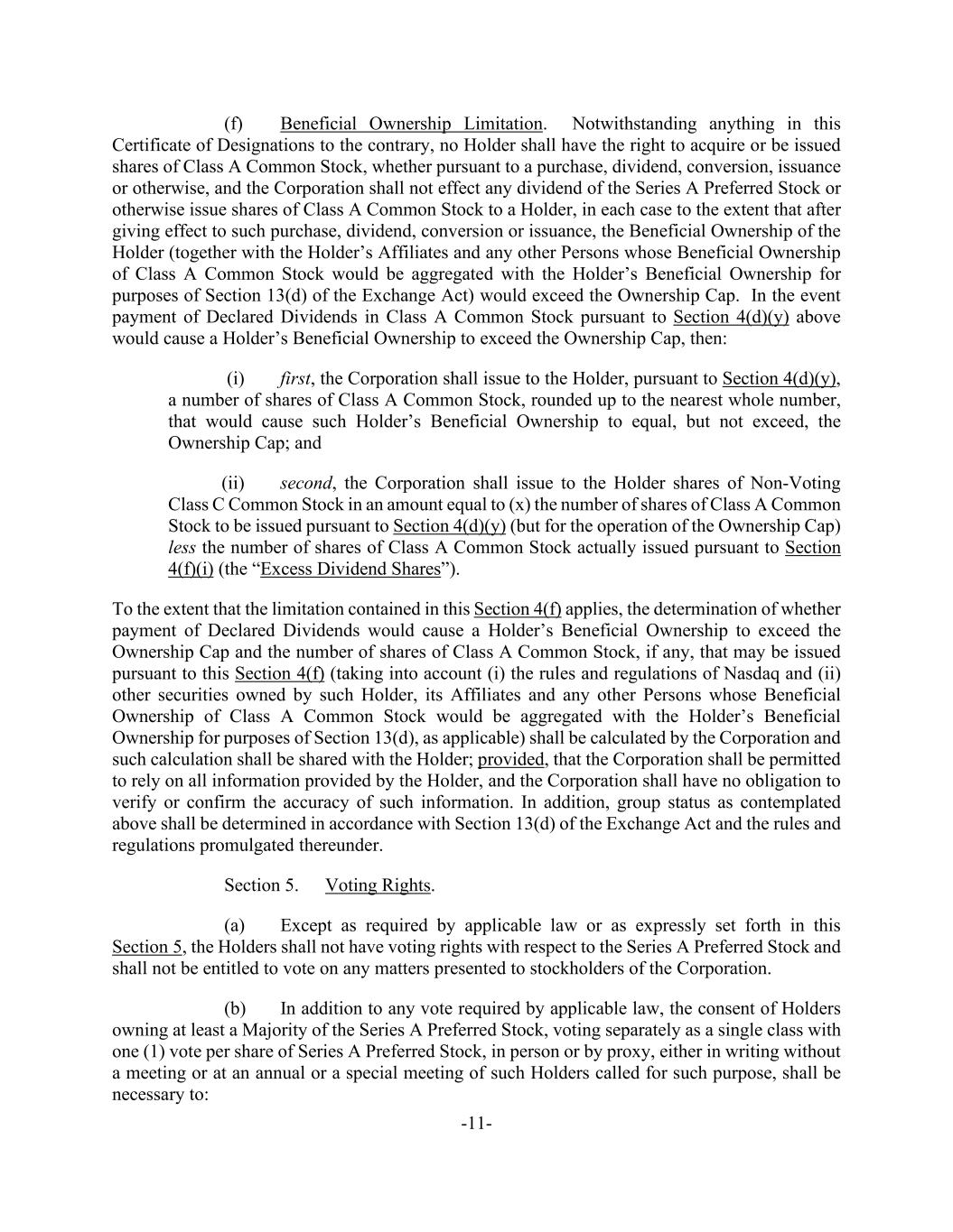 -11- (f) Beneficial Ownership Limitation. Notwithstanding anything in this Certificate of Designations to the contrary, no Holder shall have the right to acquire or be issued shares of Class A Common Stock, whether pursuant to a purchase, dividend, conversion, issuance or otherwise, and the Corporation shall not effect any dividend of the Series A Preferred Stock or otherwise issue shares of Class A Common Stock to a Holder, in each case to the extent that after giving effect to such purchase, dividend, conversion or issuance, the Beneficial Ownership of the Holder (together with the Holder’s Affiliates and any other Persons whose Beneficial Ownership of Class A Common Stock would be aggregated with the Holder’s Beneficial Ownership for purposes of Section 13(d) of the Exchange Act) would exceed the Ownership Cap. In the event payment of Declared Dividends in Class A Common Stock pursuant to Section 4(d)(y) above would cause a Holder’s Beneficial Ownership to exceed the Ownership Cap, then: (i) first, the Corporation shall issue to the Holder, pursuant to Section 4(d)(y), a number of shares of Class A Common Stock, rounded up to the nearest whole number, that would cause such Holder’s Beneficial Ownership to equal, but not exceed, the Ownership Cap; and (ii) second, the Corporation shall issue to the Holder shares of Non-Voting Class C Common Stock in an amount equal to (x) the number of shares of Class A Common Stock to be issued pursuant to Section 4(d)(y) (but for the operation of the Ownership Cap) less the number of shares of Class A Common Stock actually issued pursuant to Section 4(f)(i) (the “Excess Dividend Shares”). To the extent that the limitation contained in this Section 4(f) applies, the determination of whether payment of Declared Dividends would cause a Holder’s Beneficial Ownership to exceed the Ownership Cap and the number of shares of Class A Common Stock, if any, that may be issued pursuant to this Section 4(f) (taking into account (i) the rules and regulations of Nasdaq and (ii) other securities owned by such Holder, its Affiliates and any other Persons whose Beneficial Ownership of Class A Common Stock would be aggregated with the Holder’s Beneficial Ownership for purposes of Section 13(d), as applicable) shall be calculated by the Corporation and such calculation shall be shared with the Holder; provided, that the Corporation shall be permitted to rely on all information provided by the Holder, and the Corporation shall have no obligation to verify or confirm the accuracy of such information. In addition, group status as contemplated above shall be determined in accordance with Section 13(d) of the Exchange Act and the rules and regulations promulgated thereunder. Section 5. Voting Rights. (a) Except as required by applicable law or as expressly set forth in this Section 5, the Holders shall not have voting rights with respect to the Series A Preferred Stock and shall not be entitled to vote on any matters presented to stockholders of the Corporation. (b) In addition to any vote required by applicable law, the consent of Holders owning at least a Majority of the Series A Preferred Stock, voting separately as a single class with one (1) vote per share of Series A Preferred Stock, in person or by proxy, either in writing without a meeting or at an annual or a special meeting of such Holders called for such purpose, shall be necessary to: