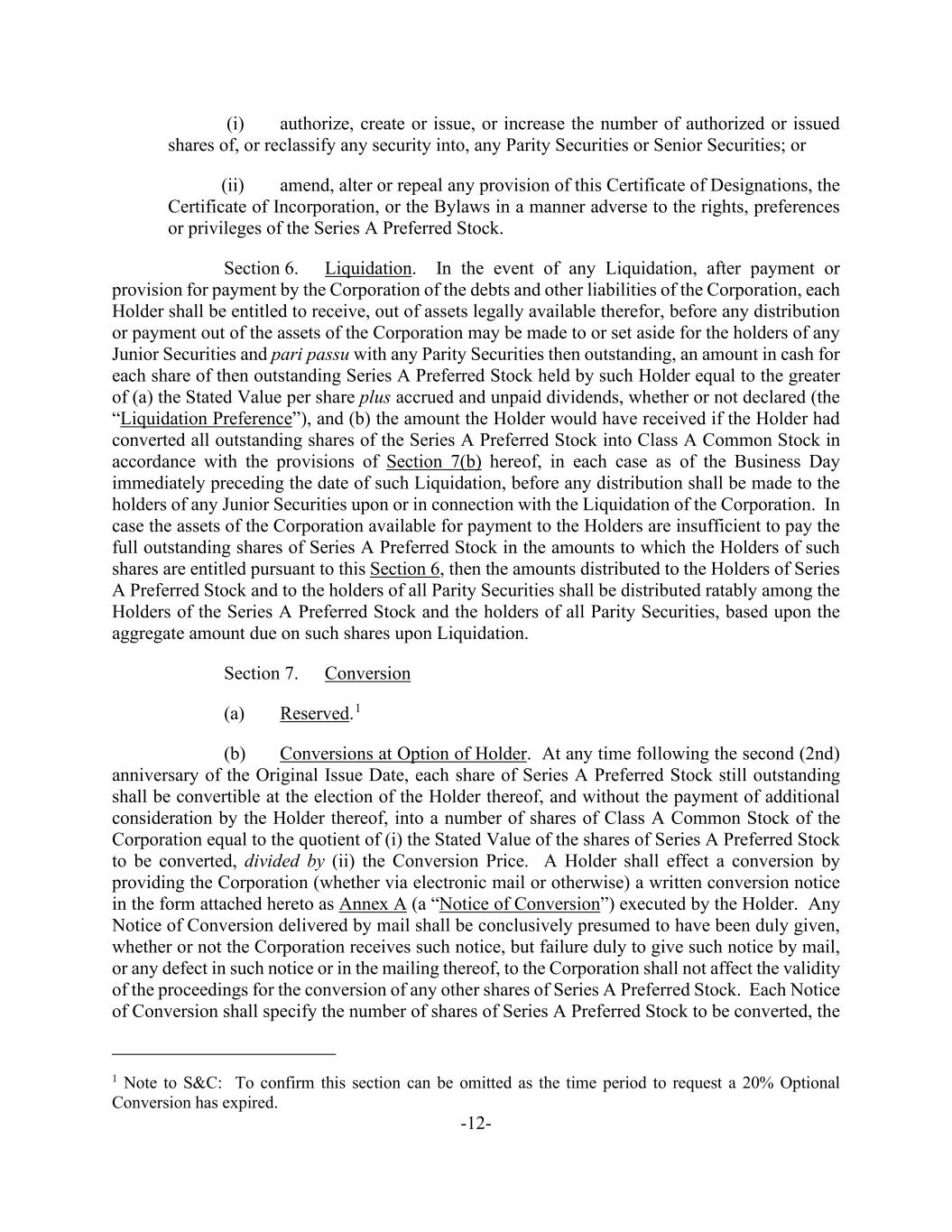 -12- (i) authorize, create or issue, or increase the number of authorized or issued shares of, or reclassify any security into, any Parity Securities or Senior Securities; or (ii) amend, alter or repeal any provision of this Certificate of Designations, the Certificate of Incorporation, or the Bylaws in a manner adverse to the rights, preferences or privileges of the Series A Preferred Stock. Section 6. Liquidation. In the event of any Liquidation, after payment or provision for payment by the Corporation of the debts and other liabilities of the Corporation, each Holder shall be entitled to receive, out of assets legally available therefor, before any distribution or payment out of the assets of the Corporation may be made to or set aside for the holders of any Junior Securities and pari passu with any Parity Securities then outstanding, an amount in cash for each share of then outstanding Series A Preferred Stock held by such Holder equal to the greater of (a) the Stated Value per share plus accrued and unpaid dividends, whether or not declared (the “Liquidation Preference”), and (b) the amount the Holder would have received if the Holder had converted all outstanding shares of the Series A Preferred Stock into Class A Common Stock in accordance with the provisions of Section 7(b) hereof, in each case as of the Business Day immediately preceding the date of such Liquidation, before any distribution shall be made to the holders of any Junior Securities upon or in connection with the Liquidation of the Corporation. In case the assets of the Corporation available for payment to the Holders are insufficient to pay the full outstanding shares of Series A Preferred Stock in the amounts to which the Holders of such shares are entitled pursuant to this Section 6, then the amounts distributed to the Holders of Series A Preferred Stock and to the holders of all Parity Securities shall be distributed ratably among the Holders of the Series A Preferred Stock and the holders of all Parity Securities, based upon the aggregate amount due on such shares upon Liquidation. Section 7. Conversion (a) Reserved.1 (b) Conversions at Option of Holder. At any time following the second (2nd) anniversary of the Original Issue Date, each share of Series A Preferred Stock still outstanding shall be convertible at the election of the Holder thereof, and without the payment of additional consideration by the Holder thereof, into a number of shares of Class A Common Stock of the Corporation equal to the quotient of (i) the Stated Value of the shares of Series A Preferred Stock to be converted, divided by (ii) the Conversion Price. A Holder shall effect a conversion by providing the Corporation (whether via electronic mail or otherwise) a written conversion notice in the form attached hereto as Annex A (a “Notice of Conversion”) executed by the Holder. Any Notice of Conversion delivered by mail shall be conclusively presumed to have been duly given, whether or not the Corporation receives such notice, but failure duly to give such notice by mail, or any defect in such notice or in the mailing thereof, to the Corporation shall not affect the validity of the proceedings for the conversion of any other shares of Series A Preferred Stock. Each Notice of Conversion shall specify the number of shares of Series A Preferred Stock to be converted, the 1 Note to S&C: To confirm this section can be omitted as the time period to request a 20% Optional Conversion has expired.