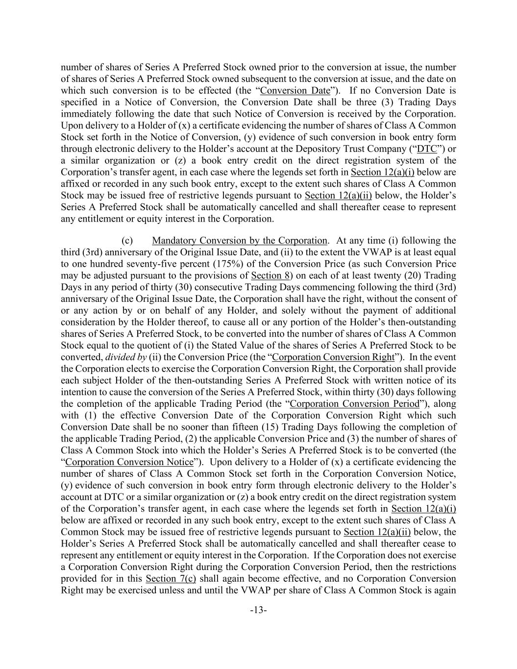 -13- number of shares of Series A Preferred Stock owned prior to the conversion at issue, the number of shares of Series A Preferred Stock owned subsequent to the conversion at issue, and the date on which such conversion is to be effected (the “Conversion Date”). If no Conversion Date is specified in a Notice of Conversion, the Conversion Date shall be three (3) Trading Days immediately following the date that such Notice of Conversion is received by the Corporation. Upon delivery to a Holder of (x) a certificate evidencing the number of shares of Class A Common Stock set forth in the Notice of Conversion, (y) evidence of such conversion in book entry form through electronic delivery to the Holder’s account at the Depository Trust Company (“DTC”) or a similar organization or (z) a book entry credit on the direct registration system of the Corporation’s transfer agent, in each case where the legends set forth in Section 12(a)(i) below are affixed or recorded in any such book entry, except to the extent such shares of Class A Common Stock may be issued free of restrictive legends pursuant to Section 12(a)(ii) below, the Holder’s Series A Preferred Stock shall be automatically cancelled and shall thereafter cease to represent any entitlement or equity interest in the Corporation. (c) Mandatory Conversion by the Corporation. At any time (i) following the third (3rd) anniversary of the Original Issue Date, and (ii) to the extent the VWAP is at least equal to one hundred seventy-five percent (175%) of the Conversion Price (as such Conversion Price may be adjusted pursuant to the provisions of Section 8) on each of at least twenty (20) Trading Days in any period of thirty (30) consecutive Trading Days commencing following the third (3rd) anniversary of the Original Issue Date, the Corporation shall have the right, without the consent of or any action by or on behalf of any Holder, and solely without the payment of additional consideration by the Holder thereof, to cause all or any portion of the Holder’s then-outstanding shares of Series A Preferred Stock, to be converted into the number of shares of Class A Common Stock equal to the quotient of (i) the Stated Value of the shares of Series A Preferred Stock to be converted, divided by (ii) the Conversion Price (the “Corporation Conversion Right”). In the event the Corporation elects to exercise the Corporation Conversion Right, the Corporation shall provide each subject Holder of the then-outstanding Series A Preferred Stock with written notice of its intention to cause the conversion of the Series A Preferred Stock, within thirty (30) days following the completion of the applicable Trading Period (the “Corporation Conversion Period”), along with (1) the effective Conversion Date of the Corporation Conversion Right which such Conversion Date shall be no sooner than fifteen (15) Trading Days following the completion of the applicable Trading Period, (2) the applicable Conversion Price and (3) the number of shares of Class A Common Stock into which the Holder’s Series A Preferred Stock is to be converted (the “Corporation Conversion Notice”). Upon delivery to a Holder of (x) a certificate evidencing the number of shares of Class A Common Stock set forth in the Corporation Conversion Notice, (y) evidence of such conversion in book entry form through electronic delivery to the Holder’s account at DTC or a similar organization or (z) a book entry credit on the direct registration system of the Corporation’s transfer agent, in each case where the legends set forth in Section 12(a)(i) below are affixed or recorded in any such book entry, except to the extent such shares of Class A Common Stock may be issued free of restrictive legends pursuant to Section 12(a)(ii) below, the Holder’s Series A Preferred Stock shall be automatically cancelled and shall thereafter cease to represent any entitlement or equity interest in the Corporation. If the Corporation does not exercise a Corporation Conversion Right during the Corporation Conversion Period, then the restrictions provided for in this Section 7(c) shall again become effective, and no Corporation Conversion Right may be exercised unless and until the VWAP per share of Class A Common Stock is again