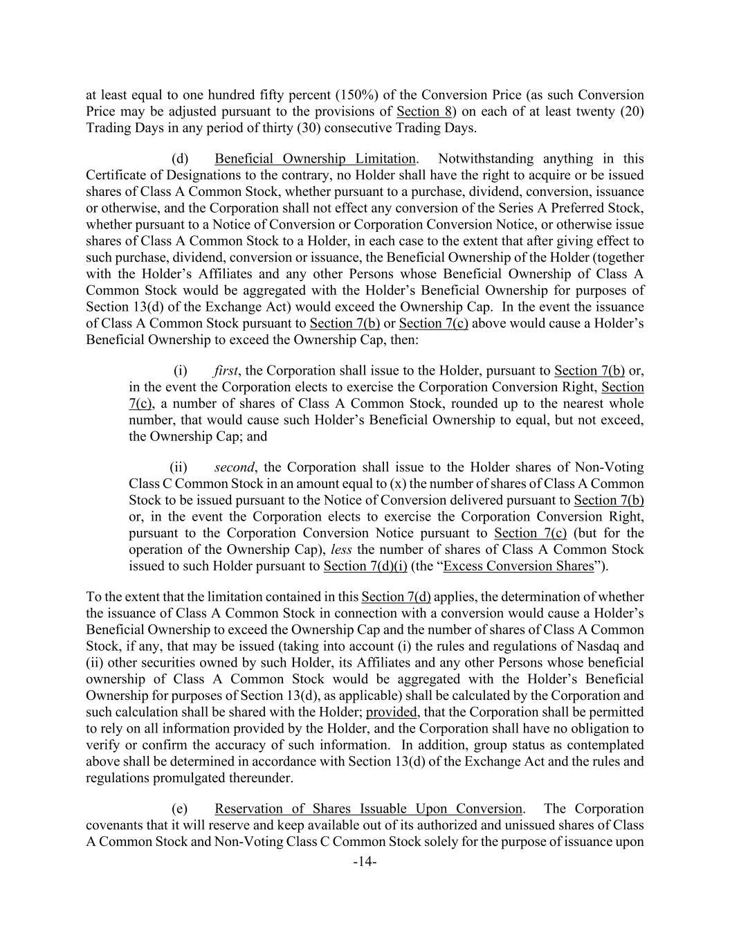 -14- at least equal to one hundred fifty percent (150%) of the Conversion Price (as such Conversion Price may be adjusted pursuant to the provisions of Section 8) on each of at least twenty (20) Trading Days in any period of thirty (30) consecutive Trading Days. (d) Beneficial Ownership Limitation. Notwithstanding anything in this Certificate of Designations to the contrary, no Holder shall have the right to acquire or be issued shares of Class A Common Stock, whether pursuant to a purchase, dividend, conversion, issuance or otherwise, and the Corporation shall not effect any conversion of the Series A Preferred Stock, whether pursuant to a Notice of Conversion or Corporation Conversion Notice, or otherwise issue shares of Class A Common Stock to a Holder, in each case to the extent that after giving effect to such purchase, dividend, conversion or issuance, the Beneficial Ownership of the Holder (together with the Holder’s Affiliates and any other Persons whose Beneficial Ownership of Class A Common Stock would be aggregated with the Holder’s Beneficial Ownership for purposes of Section 13(d) of the Exchange Act) would exceed the Ownership Cap. In the event the issuance of Class A Common Stock pursuant to Section 7(b) or Section 7(c) above would cause a Holder’s Beneficial Ownership to exceed the Ownership Cap, then: (i) first, the Corporation shall issue to the Holder, pursuant to Section 7(b) or, in the event the Corporation elects to exercise the Corporation Conversion Right, Section 7(c), a number of shares of Class A Common Stock, rounded up to the nearest whole number, that would cause such Holder’s Beneficial Ownership to equal, but not exceed, the Ownership Cap; and (ii) second, the Corporation shall issue to the Holder shares of Non-Voting Class C Common Stock in an amount equal to (x) the number of shares of Class A Common Stock to be issued pursuant to the Notice of Conversion delivered pursuant to Section 7(b) or, in the event the Corporation elects to exercise the Corporation Conversion Right, pursuant to the Corporation Conversion Notice pursuant to Section 7(c) (but for the operation of the Ownership Cap), less the number of shares of Class A Common Stock issued to such Holder pursuant to Section 7(d)(i) (the “Excess Conversion Shares”). To the extent that the limitation contained in this Section 7(d) applies, the determination of whether the issuance of Class A Common Stock in connection with a conversion would cause a Holder’s Beneficial Ownership to exceed the Ownership Cap and the number of shares of Class A Common Stock, if any, that may be issued (taking into account (i) the rules and regulations of Nasdaq and (ii) other securities owned by such Holder, its Affiliates and any other Persons whose beneficial ownership of Class A Common Stock would be aggregated with the Holder’s Beneficial Ownership for purposes of Section 13(d), as applicable) shall be calculated by the Corporation and such calculation shall be shared with the Holder; provided, that the Corporation shall be permitted to rely on all information provided by the Holder, and the Corporation shall have no obligation to verify or confirm the accuracy of such information. In addition, group status as contemplated above shall be determined in accordance with Section 13(d) of the Exchange Act and the rules and regulations promulgated thereunder. (e) Reservation of Shares Issuable Upon Conversion. The Corporation covenants that it will reserve and keep available out of its authorized and unissued shares of Class A Common Stock and Non-Voting Class C Common Stock solely for the purpose of issuance upon