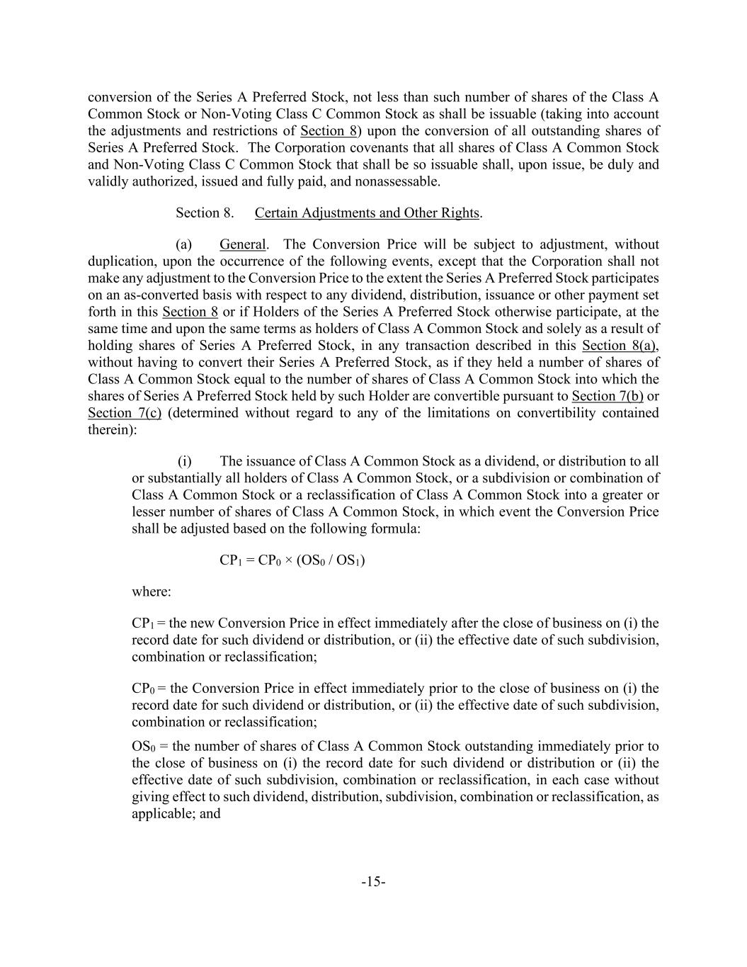 -15- conversion of the Series A Preferred Stock, not less than such number of shares of the Class A Common Stock or Non-Voting Class C Common Stock as shall be issuable (taking into account the adjustments and restrictions of Section 8) upon the conversion of all outstanding shares of Series A Preferred Stock. The Corporation covenants that all shares of Class A Common Stock and Non-Voting Class C Common Stock that shall be so issuable shall, upon issue, be duly and validly authorized, issued and fully paid, and nonassessable. Section 8. Certain Adjustments and Other Rights. (a) General. The Conversion Price will be subject to adjustment, without duplication, upon the occurrence of the following events, except that the Corporation shall not make any adjustment to the Conversion Price to the extent the Series A Preferred Stock participates on an as-converted basis with respect to any dividend, distribution, issuance or other payment set forth in this Section 8 or if Holders of the Series A Preferred Stock otherwise participate, at the same time and upon the same terms as holders of Class A Common Stock and solely as a result of holding shares of Series A Preferred Stock, in any transaction described in this Section 8(a), without having to convert their Series A Preferred Stock, as if they held a number of shares of Class A Common Stock equal to the number of shares of Class A Common Stock into which the shares of Series A Preferred Stock held by such Holder are convertible pursuant to Section 7(b) or Section 7(c) (determined without regard to any of the limitations on convertibility contained therein): (i) The issuance of Class A Common Stock as a dividend, or distribution to all or substantially all holders of Class A Common Stock, or a subdivision or combination of Class A Common Stock or a reclassification of Class A Common Stock into a greater or lesser number of shares of Class A Common Stock, in which event the Conversion Price shall be adjusted based on the following formula: CP1 = CP0 × (OS0 / OS1) where: CP1 = the new Conversion Price in effect immediately after the close of business on (i) the record date for such dividend or distribution, or (ii) the effective date of such subdivision, combination or reclassification; CP0 = the Conversion Price in effect immediately prior to the close of business on (i) the record date for such dividend or distribution, or (ii) the effective date of such subdivision, combination or reclassification; OS0 = the number of shares of Class A Common Stock outstanding immediately prior to the close of business on (i) the record date for such dividend or distribution or (ii) the effective date of such subdivision, combination or reclassification, in each case without giving effect to such dividend, distribution, subdivision, combination or reclassification, as applicable; and