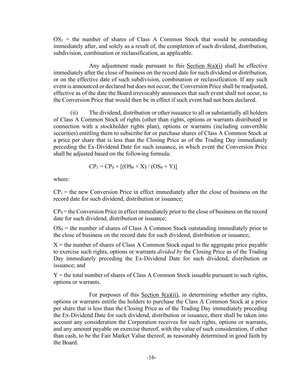 -16- OS1 = the number of shares of Class A Common Stock that would be outstanding immediately after, and solely as a result of, the completion of such dividend, distribution, subdivision, combination or reclassification, as applicable. Any adjustment made pursuant to this Section 8(a)(i) shall be effective immediately after the close of business on the record date for such dividend or distribution, or on the effective date of such subdivision, combination or reclassification. If any such event is announced or declared but does not occur, the Conversion Price shall be readjusted, effective as of the date the Board irrevocably announces that such event shall not occur, to the Conversion Price that would then be in effect if such event had not been declared. (ii) The dividend, distribution or other issuance to all or substantially all holders of Class A Common Stock of rights (other than rights, options or warrants distributed in connection with a stockholder rights plan), options or warrants (including convertible securities) entitling them to subscribe for or purchase shares of Class A Common Stock at a price per share that is less than the Closing Price as of the Trading Day immediately preceding the Ex-Dividend Date for such issuance, in which event the Conversion Price shall be adjusted based on the following formula: CP1 = CP0 × [(OS0 + X) / (OS0 + Y)] where: CP1 = the new Conversion Price in effect immediately after the close of business on the record date for such dividend, distribution or issuance; CP0 = the Conversion Price in effect immediately prior to the close of business on the record date for such dividend, distribution or issuance; OS0 = the number of shares of Class A Common Stock outstanding immediately prior to the close of business on the record date for such dividend, distribution or issuance; X = the number of shares of Class A Common Stock equal to the aggregate price payable to exercise such rights, options or warrants divided by the Closing Price as of the Trading Day immediately preceding the Ex-Dividend Date for such dividend, distribution or issuance; and Y = the total number of shares of Class A Common Stock issuable pursuant to such rights, options or warrants. For purposes of this Section 8(a)(ii), in determining whether any rights, options or warrants entitle the holders to purchase the Class A Common Stock at a price per share that is less than the Closing Price as of the Trading Day immediately preceding the Ex-Dividend Date for such dividend, distribution or issuance, there shall be taken into account any consideration the Corporation receives for such rights, options or warrants, and any amount payable on exercise thereof, with the value of such consideration, if other than cash, to be the Fair Market Value thereof, as reasonably determined in good faith by the Board.