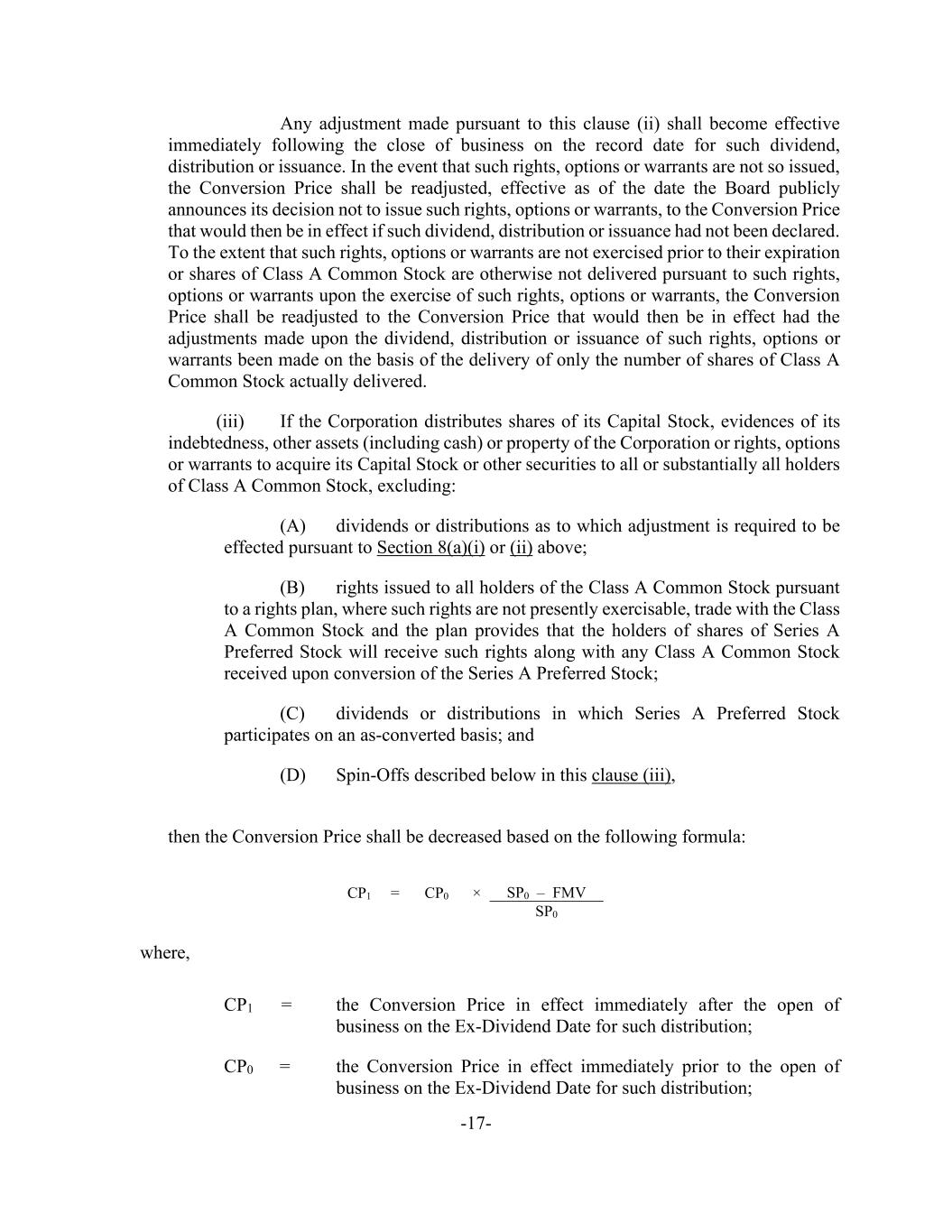 -17- Any adjustment made pursuant to this clause (ii) shall become effective immediately following the close of business on the record date for such dividend, distribution or issuance. In the event that such rights, options or warrants are not so issued, the Conversion Price shall be readjusted, effective as of the date the Board publicly announces its decision not to issue such rights, options or warrants, to the Conversion Price that would then be in effect if such dividend, distribution or issuance had not been declared. To the extent that such rights, options or warrants are not exercised prior to their expiration or shares of Class A Common Stock are otherwise not delivered pursuant to such rights, options or warrants upon the exercise of such rights, options or warrants, the Conversion Price shall be readjusted to the Conversion Price that would then be in effect had the adjustments made upon the dividend, distribution or issuance of such rights, options or warrants been made on the basis of the delivery of only the number of shares of Class A Common Stock actually delivered. (iii) If the Corporation distributes shares of its Capital Stock, evidences of its indebtedness, other assets (including cash) or property of the Corporation or rights, options or warrants to acquire its Capital Stock or other securities to all or substantially all holders of Class A Common Stock, excluding: (A) dividends or distributions as to which adjustment is required to be effected pursuant to Section 8(a)(i) or (ii) above; (B) rights issued to all holders of the Class A Common Stock pursuant to a rights plan, where such rights are not presently exercisable, trade with the Class A Common Stock and the plan provides that the holders of shares of Series A Preferred Stock will receive such rights along with any Class A Common Stock received upon conversion of the Series A Preferred Stock; (C) dividends or distributions in which Series A Preferred Stock participates on an as-converted basis; and (D) Spin-Offs described below in this clause (iii), then the Conversion Price shall be decreased based on the following formula: CP1 = CP0 × SP0 – FMV SP0 where, CP1 = the Conversion Price in effect immediately after the open of business on the Ex-Dividend Date for such distribution; CP0 = the Conversion Price in effect immediately prior to the open of business on the Ex-Dividend Date for such distribution;