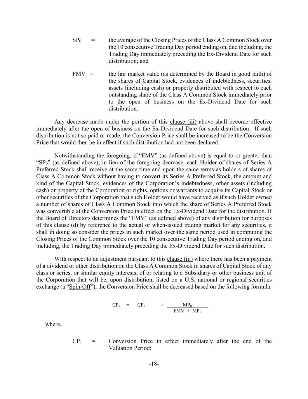 -18- SP0 = the average of the Closing Prices of the Class A Common Stock over the 10 consecutive Trading Day period ending on, and including, the Trading Day immediately preceding the Ex-Dividend Date for such distribution; and FMV = the fair market value (as determined by the Board in good faith) of the shares of Capital Stock, evidences of indebtedness, securities, assets (including cash) or property distributed with respect to each outstanding share of the Class A Common Stock immediately prior to the open of business on the Ex-Dividend Date for such distribution. Any decrease made under the portion of this clause (iii) above shall become effective immediately after the open of business on the Ex-Dividend Date for such distribution. If such distribution is not so paid or made, the Conversion Price shall be increased to be the Conversion Price that would then be in effect if such distribution had not been declared. Notwithstanding the foregoing, if “FMV” (as defined above) is equal to or greater than “SP0” (as defined above), in lieu of the foregoing decrease, each Holder of shares of Series A Preferred Stock shall receive at the same time and upon the same terms as holders of shares of Class A Common Stock without having to convert its Series A Preferred Stock, the amount and kind of the Capital Stock, evidences of the Corporation’s indebtedness, other assets (including cash) or property of the Corporation or rights, options or warrants to acquire its Capital Stock or other securities of the Corporation that such Holder would have received as if such Holder owned a number of shares of Class A Common Stock into which the share of Series A Preferred Stock was convertible at the Conversion Price in effect on the Ex-Dividend Date for the distribution. If the Board of Directors determines the “FMV” (as defined above) of any distribution for purposes of this clause (d) by reference to the actual or when-issued trading market for any securities, it shall in doing so consider the prices in such market over the same period used in computing the Closing Prices of the Common Stock over the 10 consecutive Trading Day period ending on, and including, the Trading Day immediately preceding the Ex-Dividend Date for such distribution. With respect to an adjustment pursuant to this clause (iii) where there has been a payment of a dividend or other distribution on the Class A Common Stock in shares of Capital Stock of any class or series, or similar equity interests, of or relating to a Subsidiary or other business unit of the Corporation that will be, upon distribution, listed on a U.S. national or regional securities exchange (a “Spin-Off”), the Conversion Price shall be decreased based on the following formula: CP1 = CP0 × MP0 FMV + MP0 where, CP1 = Conversion Price in effect immediately after the end of the Valuation Period;