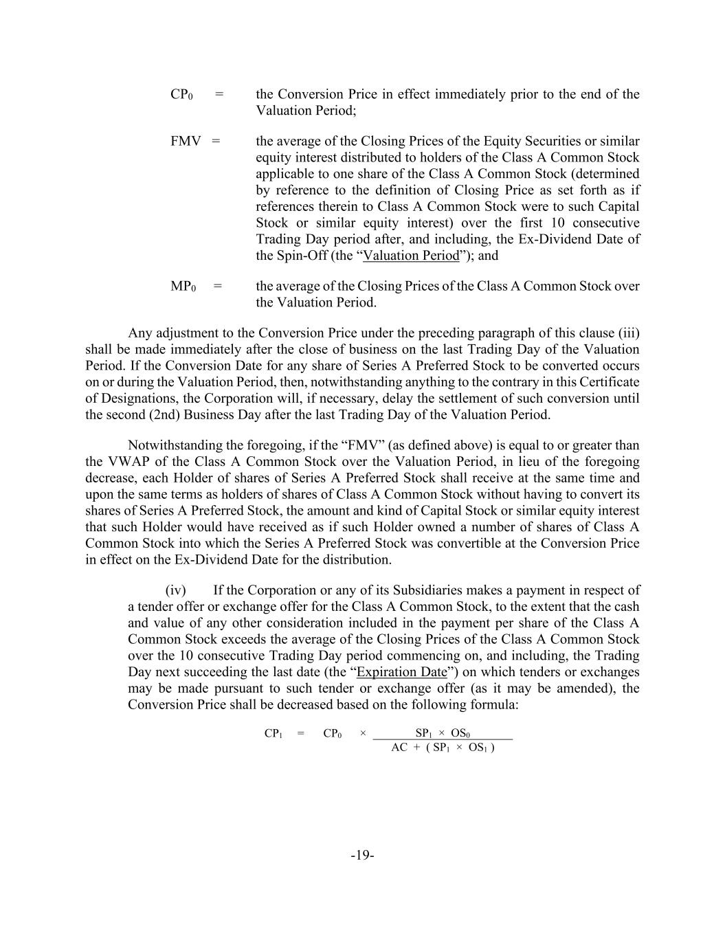 -19- CP0 = the Conversion Price in effect immediately prior to the end of the Valuation Period; FMV = the average of the Closing Prices of the Equity Securities or similar equity interest distributed to holders of the Class A Common Stock applicable to one share of the Class A Common Stock (determined by reference to the definition of Closing Price as set forth as if references therein to Class A Common Stock were to such Capital Stock or similar equity interest) over the first 10 consecutive Trading Day period after, and including, the Ex-Dividend Date of the Spin-Off (the “Valuation Period”); and MP0 = the average of the Closing Prices of the Class A Common Stock over the Valuation Period. Any adjustment to the Conversion Price under the preceding paragraph of this clause (iii) shall be made immediately after the close of business on the last Trading Day of the Valuation Period. If the Conversion Date for any share of Series A Preferred Stock to be converted occurs on or during the Valuation Period, then, notwithstanding anything to the contrary in this Certificate of Designations, the Corporation will, if necessary, delay the settlement of such conversion until the second (2nd) Business Day after the last Trading Day of the Valuation Period. Notwithstanding the foregoing, if the “FMV” (as defined above) is equal to or greater than the VWAP of the Class A Common Stock over the Valuation Period, in lieu of the foregoing decrease, each Holder of shares of Series A Preferred Stock shall receive at the same time and upon the same terms as holders of shares of Class A Common Stock without having to convert its shares of Series A Preferred Stock, the amount and kind of Capital Stock or similar equity interest that such Holder would have received as if such Holder owned a number of shares of Class A Common Stock into which the Series A Preferred Stock was convertible at the Conversion Price in effect on the Ex-Dividend Date for the distribution. (iv) If the Corporation or any of its Subsidiaries makes a payment in respect of a tender offer or exchange offer for the Class A Common Stock, to the extent that the cash and value of any other consideration included in the payment per share of the Class A Common Stock exceeds the average of the Closing Prices of the Class A Common Stock over the 10 consecutive Trading Day period commencing on, and including, the Trading Day next succeeding the last date (the “Expiration Date”) on which tenders or exchanges may be made pursuant to such tender or exchange offer (as it may be amended), the Conversion Price shall be decreased based on the following formula: CP1 = CP0 × SP1 × OS0 AC + ( SP1 × OS1 )