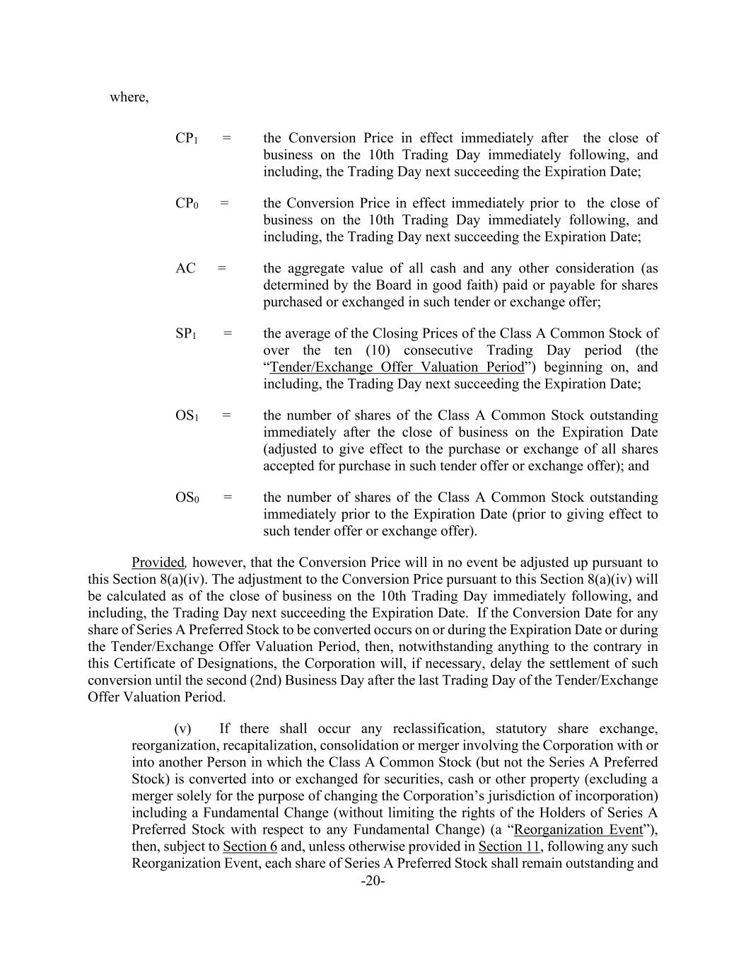 -20- where, CP1 = the Conversion Price in effect immediately after the close of business on the 10th Trading Day immediately following, and including, the Trading Day next succeeding the Expiration Date; CP0 = the Conversion Price in effect immediately prior to the close of business on the 10th Trading Day immediately following, and including, the Trading Day next succeeding the Expiration Date; AC = the aggregate value of all cash and any other consideration (as determined by the Board in good faith) paid or payable for shares purchased or exchanged in such tender or exchange offer; SP1 = the average of the Closing Prices of the Class A Common Stock of over the ten (10) consecutive Trading Day period (the “Tender/Exchange Offer Valuation Period”) beginning on, and including, the Trading Day next succeeding the Expiration Date; OS1 = the number of shares of the Class A Common Stock outstanding immediately after the close of business on the Expiration Date (adjusted to give effect to the purchase or exchange of all shares accepted for purchase in such tender offer or exchange offer); and OS0 = the number of shares of the Class A Common Stock outstanding immediately prior to the Expiration Date (prior to giving effect to such tender offer or exchange offer). Provided, however, that the Conversion Price will in no event be adjusted up pursuant to this Section 8(a)(iv). The adjustment to the Conversion Price pursuant to this Section 8(a)(iv) will be calculated as of the close of business on the 10th Trading Day immediately following, and including, the Trading Day next succeeding the Expiration Date. If the Conversion Date for any share of Series A Preferred Stock to be converted occurs on or during the Expiration Date or during the Tender/Exchange Offer Valuation Period, then, notwithstanding anything to the contrary in this Certificate of Designations, the Corporation will, if necessary, delay the settlement of such conversion until the second (2nd) Business Day after the last Trading Day of the Tender/Exchange Offer Valuation Period. (v) If there shall occur any reclassification, statutory share exchange, reorganization, recapitalization, consolidation or merger involving the Corporation with or into another Person in which the Class A Common Stock (but not the Series A Preferred Stock) is converted into or exchanged for securities, cash or other property (excluding a merger solely for the purpose of changing the Corporation’s jurisdiction of incorporation) including a Fundamental Change (without limiting the rights of the Holders of Series A Preferred Stock with respect to any Fundamental Change) (a “Reorganization Event”), then, subject to Section 6 and, unless otherwise provided in Section 11, following any such Reorganization Event, each share of Series A Preferred Stock shall remain outstanding and