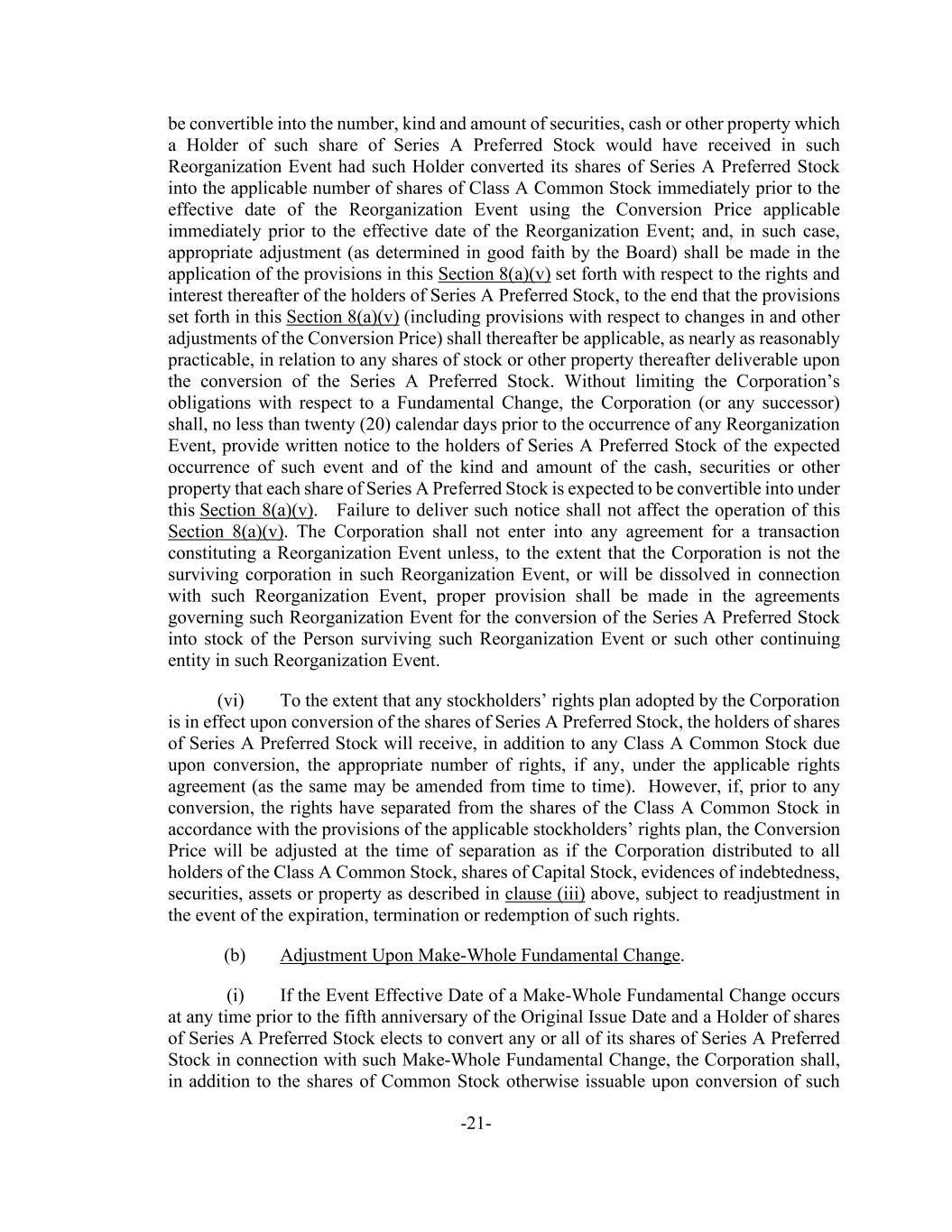 -21- be convertible into the number, kind and amount of securities, cash or other property which a Holder of such share of Series A Preferred Stock would have received in such Reorganization Event had such Holder converted its shares of Series A Preferred Stock into the applicable number of shares of Class A Common Stock immediately prior to the effective date of the Reorganization Event using the Conversion Price applicable immediately prior to the effective date of the Reorganization Event; and, in such case, appropriate adjustment (as determined in good faith by the Board) shall be made in the application of the provisions in this Section 8(a)(v) set forth with respect to the rights and interest thereafter of the holders of Series A Preferred Stock, to the end that the provisions set forth in this Section 8(a)(v) (including provisions with respect to changes in and other adjustments of the Conversion Price) shall thereafter be applicable, as nearly as reasonably practicable, in relation to any shares of stock or other property thereafter deliverable upon the conversion of the Series A Preferred Stock. Without limiting the Corporation’s obligations with respect to a Fundamental Change, the Corporation (or any successor) shall, no less than twenty (20) calendar days prior to the occurrence of any Reorganization Event, provide written notice to the holders of Series A Preferred Stock of the expected occurrence of such event and of the kind and amount of the cash, securities or other property that each share of Series A Preferred Stock is expected to be convertible into under this Section 8(a)(v). Failure to deliver such notice shall not affect the operation of this Section 8(a)(v). The Corporation shall not enter into any agreement for a transaction constituting a Reorganization Event unless, to the extent that the Corporation is not the surviving corporation in such Reorganization Event, or will be dissolved in connection with such Reorganization Event, proper provision shall be made in the agreements governing such Reorganization Event for the conversion of the Series A Preferred Stock into stock of the Person surviving such Reorganization Event or such other continuing entity in such Reorganization Event. (vi) To the extent that any stockholders’ rights plan adopted by the Corporation is in effect upon conversion of the shares of Series A Preferred Stock, the holders of shares of Series A Preferred Stock will receive, in addition to any Class A Common Stock due upon conversion, the appropriate number of rights, if any, under the applicable rights agreement (as the same may be amended from time to time). However, if, prior to any conversion, the rights have separated from the shares of the Class A Common Stock in accordance with the provisions of the applicable stockholders’ rights plan, the Conversion Price will be adjusted at the time of separation as if the Corporation distributed to all holders of the Class A Common Stock, shares of Capital Stock, evidences of indebtedness, securities, assets or property as described in clause (iii) above, subject to readjustment in the event of the expiration, termination or redemption of such rights. (b) Adjustment Upon Make-Whole Fundamental Change. (i) If the Event Effective Date of a Make-Whole Fundamental Change occurs at any time prior to the fifth anniversary of the Original Issue Date and a Holder of shares of Series A Preferred Stock elects to convert any or all of its shares of Series A Preferred Stock in connection with such Make-Whole Fundamental Change, the Corporation shall, in addition to the shares of Common Stock otherwise issuable upon conversion of such
