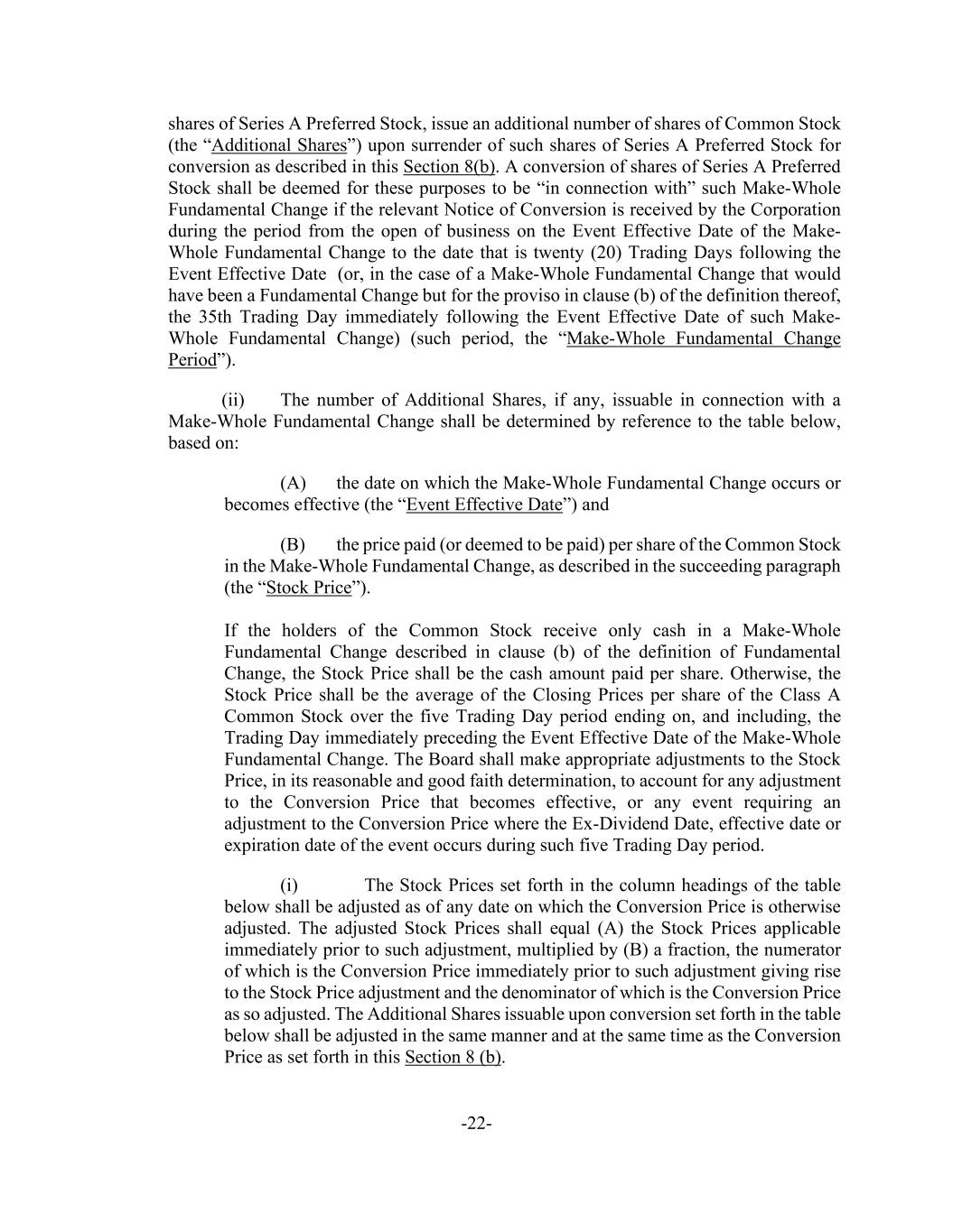 -22- shares of Series A Preferred Stock, issue an additional number of shares of Common Stock (the “Additional Shares”) upon surrender of such shares of Series A Preferred Stock for conversion as described in this Section 8(b). A conversion of shares of Series A Preferred Stock shall be deemed for these purposes to be “in connection with” such Make-Whole Fundamental Change if the relevant Notice of Conversion is received by the Corporation during the period from the open of business on the Event Effective Date of the Make- Whole Fundamental Change to the date that is twenty (20) Trading Days following the Event Effective Date (or, in the case of a Make-Whole Fundamental Change that would have been a Fundamental Change but for the proviso in clause (b) of the definition thereof, the 35th Trading Day immediately following the Event Effective Date of such Make- Whole Fundamental Change) (such period, the “Make-Whole Fundamental Change Period”). (ii) The number of Additional Shares, if any, issuable in connection with a Make-Whole Fundamental Change shall be determined by reference to the table below, based on: (A) the date on which the Make-Whole Fundamental Change occurs or becomes effective (the “Event Effective Date”) and (B) the price paid (or deemed to be paid) per share of the Common Stock in the Make-Whole Fundamental Change, as described in the succeeding paragraph (the “Stock Price”). If the holders of the Common Stock receive only cash in a Make-Whole Fundamental Change described in clause (b) of the definition of Fundamental Change, the Stock Price shall be the cash amount paid per share. Otherwise, the Stock Price shall be the average of the Closing Prices per share of the Class A Common Stock over the five Trading Day period ending on, and including, the Trading Day immediately preceding the Event Effective Date of the Make-Whole Fundamental Change. The Board shall make appropriate adjustments to the Stock Price, in its reasonable and good faith determination, to account for any adjustment to the Conversion Price that becomes effective, or any event requiring an adjustment to the Conversion Price where the Ex-Dividend Date, effective date or expiration date of the event occurs during such five Trading Day period. (i) The Stock Prices set forth in the column headings of the table below shall be adjusted as of any date on which the Conversion Price is otherwise adjusted. The adjusted Stock Prices shall equal (A) the Stock Prices applicable immediately prior to such adjustment, multiplied by (B) a fraction, the numerator of which is the Conversion Price immediately prior to such adjustment giving rise to the Stock Price adjustment and the denominator of which is the Conversion Price as so adjusted. The Additional Shares issuable upon conversion set forth in the table below shall be adjusted in the same manner and at the same time as the Conversion Price as set forth in this Section 8 (b).