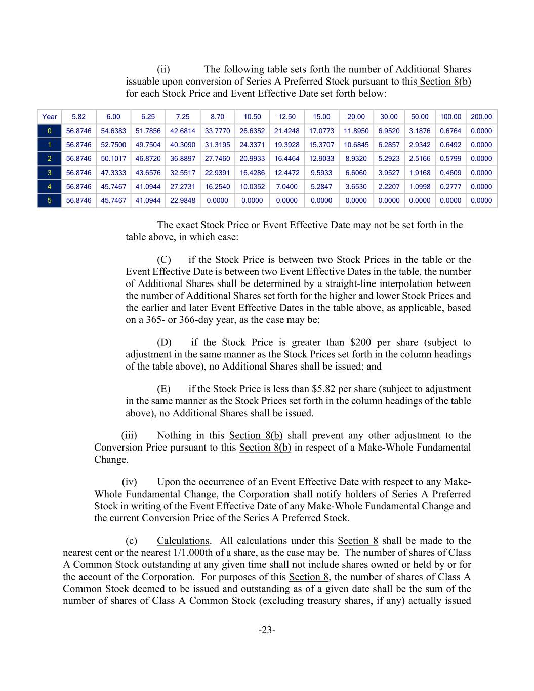 -23- (ii) The following table sets forth the number of Additional Shares issuable upon conversion of Series A Preferred Stock pursuant to this Section 8(b) for each Stock Price and Event Effective Date set forth below: Year 5.82 6.00 6.25 7.25 8.70 10.50 12.50 15.00 20.00 30.00 50.00 100.00 200.00 0 56.8746 54.6383 51.7856 42.6814 33.7770 26.6352 21.4248 17.0773 11.8950 6.9520 3.1876 0.6764 0.0000 1 56.8746 52.7500 49.7504 40.3090 31.3195 24.3371 19.3928 15.3707 10.6845 6.2857 2.9342 0.6492 0.0000 2 56.8746 50.1017 46.8720 36.8897 27.7460 20.9933 16.4464 12.9033 8.9320 5.2923 2.5166 0.5799 0.0000 3 56.8746 47.3333 43.6576 32.5517 22.9391 16.4286 12.4472 9.5933 6.6060 3.9527 1.9168 0.4609 0.0000 4 56.8746 45.7467 41.0944 27.2731 16.2540 10.0352 7.0400 5.2847 3.6530 2.2207 1.0998 0.2777 0.0000 5 56.8746 45.7467 41.0944 22.9848 0.0000 0.0000 0.0000 0.0000 0.0000 0.0000 0.0000 0.0000 0.0000 The exact Stock Price or Event Effective Date may not be set forth in the table above, in which case: (C) if the Stock Price is between two Stock Prices in the table or the Event Effective Date is between two Event Effective Dates in the table, the number of Additional Shares shall be determined by a straight-line interpolation between the number of Additional Shares set forth for the higher and lower Stock Prices and the earlier and later Event Effective Dates in the table above, as applicable, based on a 365- or 366-day year, as the case may be; (D) if the Stock Price is greater than $200 per share (subject to adjustment in the same manner as the Stock Prices set forth in the column headings of the table above), no Additional Shares shall be issued; and (E) if the Stock Price is less than $5.82 per share (subject to adjustment in the same manner as the Stock Prices set forth in the column headings of the table above), no Additional Shares shall be issued. (iii) Nothing in this Section 8(b) shall prevent any other adjustment to the Conversion Price pursuant to this Section 8(b) in respect of a Make-Whole Fundamental Change. (iv) Upon the occurrence of an Event Effective Date with respect to any Make- Whole Fundamental Change, the Corporation shall notify holders of Series A Preferred Stock in writing of the Event Effective Date of any Make-Whole Fundamental Change and the current Conversion Price of the Series A Preferred Stock. (c) Calculations. All calculations under this Section 8 shall be made to the nearest cent or the nearest 1/1,000th of a share, as the case may be. The number of shares of Class A Common Stock outstanding at any given time shall not include shares owned or held by or for the account of the Corporation. For purposes of this Section 8, the number of shares of Class A Common Stock deemed to be issued and outstanding as of a given date shall be the sum of the number of shares of Class A Common Stock (excluding treasury shares, if any) actually issued