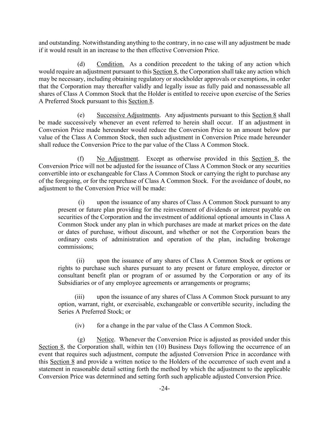 -24- and outstanding. Notwithstanding anything to the contrary, in no case will any adjustment be made if it would result in an increase to the then effective Conversion Price. (d) Condition. As a condition precedent to the taking of any action which would require an adjustment pursuant to this Section 8, the Corporation shall take any action which may be necessary, including obtaining regulatory or stockholder approvals or exemptions, in order that the Corporation may thereafter validly and legally issue as fully paid and nonassessable all shares of Class A Common Stock that the Holder is entitled to receive upon exercise of the Series A Preferred Stock pursuant to this Section 8. (e) Successive Adjustments. Any adjustments pursuant to this Section 8 shall be made successively whenever an event referred to herein shall occur. If an adjustment in Conversion Price made hereunder would reduce the Conversion Price to an amount below par value of the Class A Common Stock, then such adjustment in Conversion Price made hereunder shall reduce the Conversion Price to the par value of the Class A Common Stock. (f) No Adjustment. Except as otherwise provided in this Section 8, the Conversion Price will not be adjusted for the issuance of Class A Common Stock or any securities convertible into or exchangeable for Class A Common Stock or carrying the right to purchase any of the foregoing, or for the repurchase of Class A Common Stock. For the avoidance of doubt, no adjustment to the Conversion Price will be made: (i) upon the issuance of any shares of Class A Common Stock pursuant to any present or future plan providing for the reinvestment of dividends or interest payable on securities of the Corporation and the investment of additional optional amounts in Class A Common Stock under any plan in which purchases are made at market prices on the date or dates of purchase, without discount, and whether or not the Corporation bears the ordinary costs of administration and operation of the plan, including brokerage commissions; (ii) upon the issuance of any shares of Class A Common Stock or options or rights to purchase such shares pursuant to any present or future employee, director or consultant benefit plan or program of or assumed by the Corporation or any of its Subsidiaries or of any employee agreements or arrangements or programs; (iii) upon the issuance of any shares of Class A Common Stock pursuant to any option, warrant, right, or exercisable, exchangeable or convertible security, including the Series A Preferred Stock; or (iv) for a change in the par value of the Class A Common Stock. (g) Notice. Whenever the Conversion Price is adjusted as provided under this Section 8, the Corporation shall, within ten (10) Business Days following the occurrence of an event that requires such adjustment, compute the adjusted Conversion Price in accordance with this Section 8 and provide a written notice to the Holders of the occurrence of such event and a statement in reasonable detail setting forth the method by which the adjustment to the applicable Conversion Price was determined and setting forth such applicable adjusted Conversion Price.