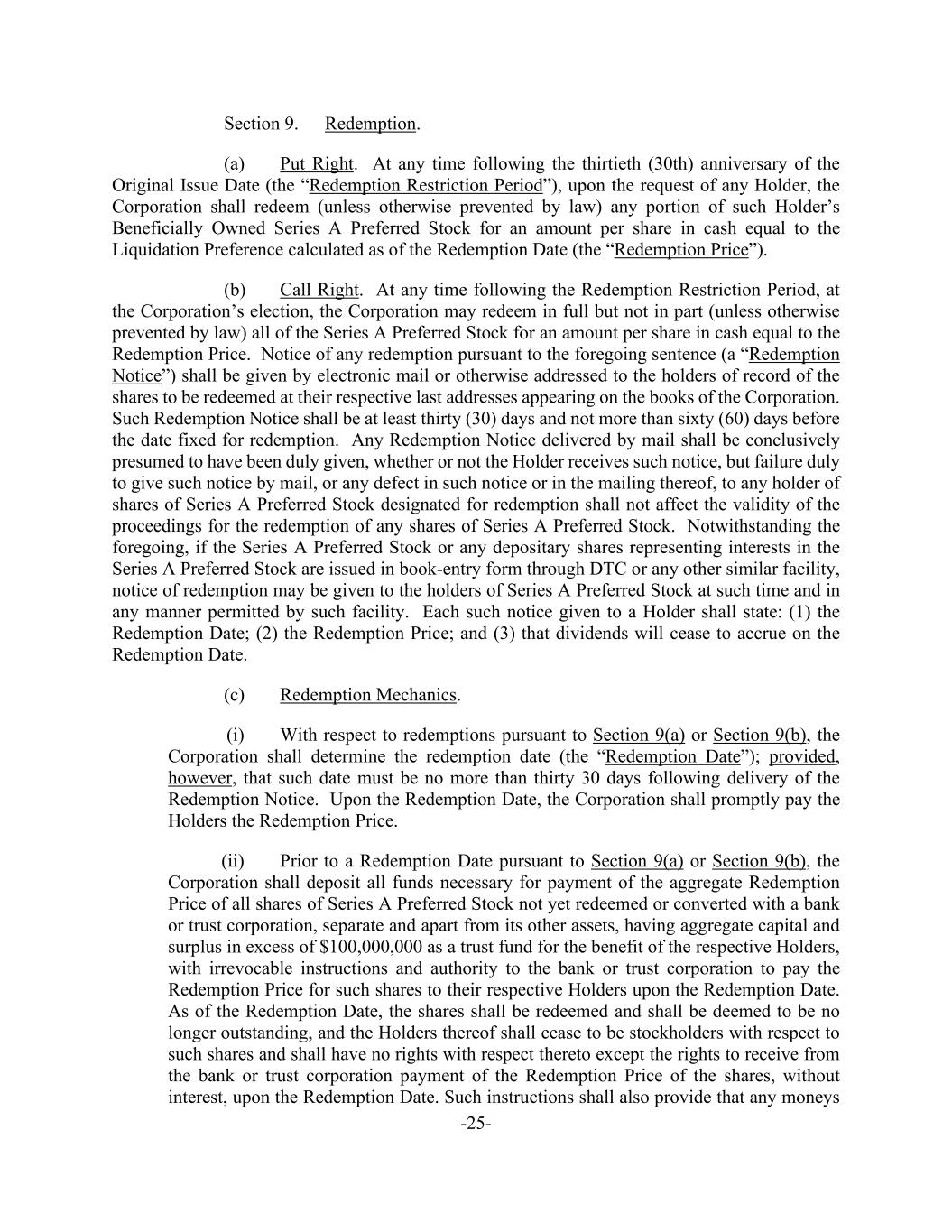 -25- Section 9. Redemption. (a) Put Right. At any time following the thirtieth (30th) anniversary of the Original Issue Date (the “Redemption Restriction Period”), upon the request of any Holder, the Corporation shall redeem (unless otherwise prevented by law) any portion of such Holder’s Beneficially Owned Series A Preferred Stock for an amount per share in cash equal to the Liquidation Preference calculated as of the Redemption Date (the “Redemption Price”). (b) Call Right. At any time following the Redemption Restriction Period, at the Corporation’s election, the Corporation may redeem in full but not in part (unless otherwise prevented by law) all of the Series A Preferred Stock for an amount per share in cash equal to the Redemption Price. Notice of any redemption pursuant to the foregoing sentence (a “Redemption Notice”) shall be given by electronic mail or otherwise addressed to the holders of record of the shares to be redeemed at their respective last addresses appearing on the books of the Corporation. Such Redemption Notice shall be at least thirty (30) days and not more than sixty (60) days before the date fixed for redemption. Any Redemption Notice delivered by mail shall be conclusively presumed to have been duly given, whether or not the Holder receives such notice, but failure duly to give such notice by mail, or any defect in such notice or in the mailing thereof, to any holder of shares of Series A Preferred Stock designated for redemption shall not affect the validity of the proceedings for the redemption of any shares of Series A Preferred Stock. Notwithstanding the foregoing, if the Series A Preferred Stock or any depositary shares representing interests in the Series A Preferred Stock are issued in book-entry form through DTC or any other similar facility, notice of redemption may be given to the holders of Series A Preferred Stock at such time and in any manner permitted by such facility. Each such notice given to a Holder shall state: (1) the Redemption Date; (2) the Redemption Price; and (3) that dividends will cease to accrue on the Redemption Date. (c) Redemption Mechanics. (i) With respect to redemptions pursuant to Section 9(a) or Section 9(b), the Corporation shall determine the redemption date (the “Redemption Date”); provided, however, that such date must be no more than thirty 30 days following delivery of the Redemption Notice. Upon the Redemption Date, the Corporation shall promptly pay the Holders the Redemption Price. (ii) Prior to a Redemption Date pursuant to Section 9(a) or Section 9(b), the Corporation shall deposit all funds necessary for payment of the aggregate Redemption Price of all shares of Series A Preferred Stock not yet redeemed or converted with a bank or trust corporation, separate and apart from its other assets, having aggregate capital and surplus in excess of $100,000,000 as a trust fund for the benefit of the respective Holders, with irrevocable instructions and authority to the bank or trust corporation to pay the Redemption Price for such shares to their respective Holders upon the Redemption Date. As of the Redemption Date, the shares shall be redeemed and shall be deemed to be no longer outstanding, and the Holders thereof shall cease to be stockholders with respect to such shares and shall have no rights with respect thereto except the rights to receive from the bank or trust corporation payment of the Redemption Price of the shares, without interest, upon the Redemption Date. Such instructions shall also provide that any moneys
