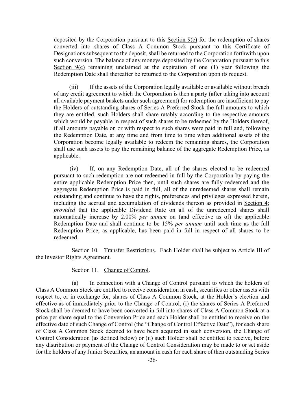-26- deposited by the Corporation pursuant to this Section 9(c) for the redemption of shares converted into shares of Class A Common Stock pursuant to this Certificate of Designations subsequent to the deposit, shall be returned to the Corporation forthwith upon such conversion. The balance of any moneys deposited by the Corporation pursuant to this Section 9(c) remaining unclaimed at the expiration of one (1) year following the Redemption Date shall thereafter be returned to the Corporation upon its request. (iii) If the assets of the Corporation legally available or available without breach of any credit agreement to which the Corporation is then a party (after taking into account all available payment baskets under such agreement) for redemption are insufficient to pay the Holders of outstanding shares of Series A Preferred Stock the full amounts to which they are entitled, such Holders shall share ratably according to the respective amounts which would be payable in respect of such shares to be redeemed by the Holders thereof, if all amounts payable on or with respect to such shares were paid in full and, following the Redemption Date, at any time and from time to time when additional assets of the Corporation become legally available to redeem the remaining shares, the Corporation shall use such assets to pay the remaining balance of the aggregate Redemption Price, as applicable. (iv) If, on any Redemption Date, all of the shares elected to be redeemed pursuant to such redemption are not redeemed in full by the Corporation by paying the entire applicable Redemption Price then, until such shares are fully redeemed and the aggregate Redemption Price is paid in full, all of the unredeemed shares shall remain outstanding and continue to have the rights, preferences and privileges expressed herein, including the accrual and accumulation of dividends thereon as provided in Section 4; provided that the applicable Dividend Rate on all of the unredeemed shares shall automatically increase by 2.00% per annum on (and effective as of) the applicable Redemption Date and shall continue to be 15% per annum until such time as the full Redemption Price, as applicable, has been paid in full in respect of all shares to be redeemed. Section 10. Transfer Restrictions. Each Holder shall be subject to Article III of the Investor Rights Agreement. Section 11. Change of Control. (a) In connection with a Change of Control pursuant to which the holders of Class A Common Stock are entitled to receive consideration in cash, securities or other assets with respect to, or in exchange for, shares of Class A Common Stock, at the Holder’s election and effective as of immediately prior to the Change of Control, (i) the shares of Series A Preferred Stock shall be deemed to have been converted in full into shares of Class A Common Stock at a price per share equal to the Conversion Price and each Holder shall be entitled to receive on the effective date of such Change of Control (the “Change of Control Effective Date”), for each share of Class A Common Stock deemed to have been acquired in such conversion, the Change of Control Consideration (as defined below) or (ii) such Holder shall be entitled to receive, before any distribution or payment of the Change of Control Consideration may be made to or set aside for the holders of any Junior Securities, an amount in cash for each share of then outstanding Series
