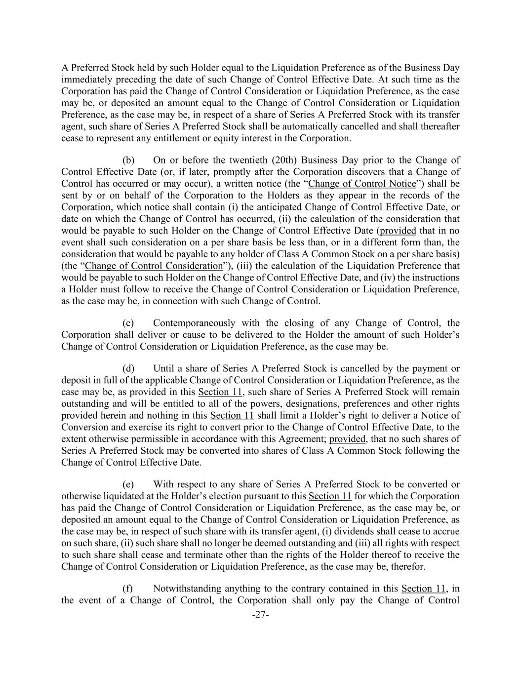 -27- A Preferred Stock held by such Holder equal to the Liquidation Preference as of the Business Day immediately preceding the date of such Change of Control Effective Date. At such time as the Corporation has paid the Change of Control Consideration or Liquidation Preference, as the case may be, or deposited an amount equal to the Change of Control Consideration or Liquidation Preference, as the case may be, in respect of a share of Series A Preferred Stock with its transfer agent, such share of Series A Preferred Stock shall be automatically cancelled and shall thereafter cease to represent any entitlement or equity interest in the Corporation. (b) On or before the twentieth (20th) Business Day prior to the Change of Control Effective Date (or, if later, promptly after the Corporation discovers that a Change of Control has occurred or may occur), a written notice (the “Change of Control Notice”) shall be sent by or on behalf of the Corporation to the Holders as they appear in the records of the Corporation, which notice shall contain (i) the anticipated Change of Control Effective Date, or date on which the Change of Control has occurred, (ii) the calculation of the consideration that would be payable to such Holder on the Change of Control Effective Date (provided that in no event shall such consideration on a per share basis be less than, or in a different form than, the consideration that would be payable to any holder of Class A Common Stock on a per share basis) (the “Change of Control Consideration”), (iii) the calculation of the Liquidation Preference that would be payable to such Holder on the Change of Control Effective Date, and (iv) the instructions a Holder must follow to receive the Change of Control Consideration or Liquidation Preference, as the case may be, in connection with such Change of Control. (c) Contemporaneously with the closing of any Change of Control, the Corporation shall deliver or cause to be delivered to the Holder the amount of such Holder’s Change of Control Consideration or Liquidation Preference, as the case may be. (d) Until a share of Series A Preferred Stock is cancelled by the payment or deposit in full of the applicable Change of Control Consideration or Liquidation Preference, as the case may be, as provided in this Section 11, such share of Series A Preferred Stock will remain outstanding and will be entitled to all of the powers, designations, preferences and other rights provided herein and nothing in this Section 11 shall limit a Holder’s right to deliver a Notice of Conversion and exercise its right to convert prior to the Change of Control Effective Date, to the extent otherwise permissible in accordance with this Agreement; provided, that no such shares of Series A Preferred Stock may be converted into shares of Class A Common Stock following the Change of Control Effective Date. (e) With respect to any share of Series A Preferred Stock to be converted or otherwise liquidated at the Holder’s election pursuant to this Section 11 for which the Corporation has paid the Change of Control Consideration or Liquidation Preference, as the case may be, or deposited an amount equal to the Change of Control Consideration or Liquidation Preference, as the case may be, in respect of such share with its transfer agent, (i) dividends shall cease to accrue on such share, (ii) such share shall no longer be deemed outstanding and (iii) all rights with respect to such share shall cease and terminate other than the rights of the Holder thereof to receive the Change of Control Consideration or Liquidation Preference, as the case may be, therefor. (f) Notwithstanding anything to the contrary contained in this Section 11, in the event of a Change of Control, the Corporation shall only pay the Change of Control