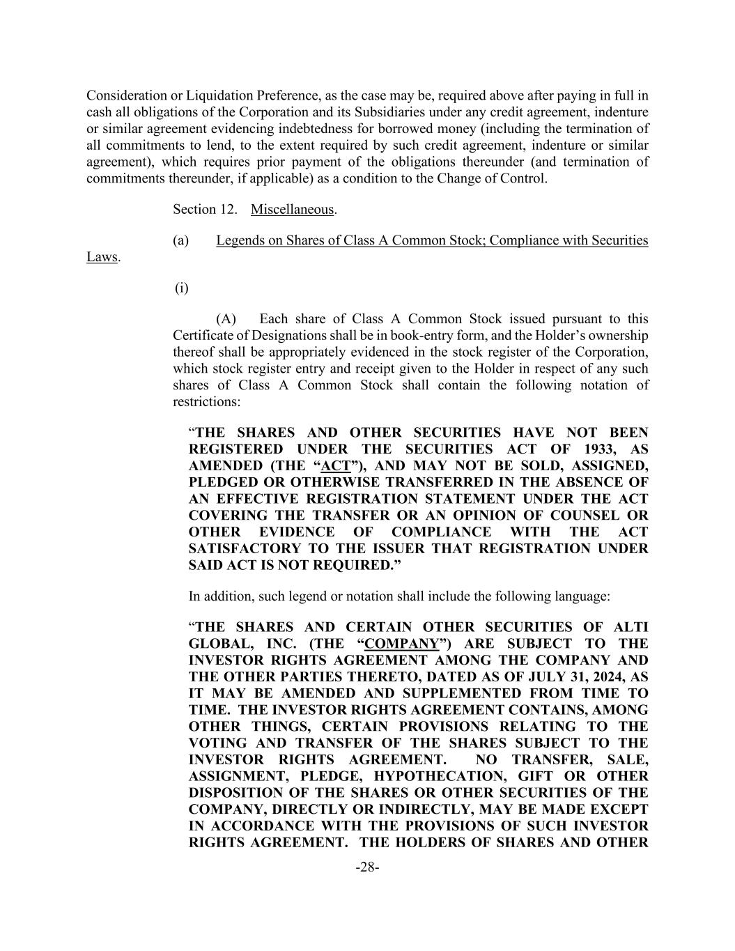 -28- Consideration or Liquidation Preference, as the case may be, required above after paying in full in cash all obligations of the Corporation and its Subsidiaries under any credit agreement, indenture or similar agreement evidencing indebtedness for borrowed money (including the termination of all commitments to lend, to the extent required by such credit agreement, indenture or similar agreement), which requires prior payment of the obligations thereunder (and termination of commitments thereunder, if applicable) as a condition to the Change of Control. Section 12. Miscellaneous. (a) Legends on Shares of Class A Common Stock; Compliance with Securities Laws. (i) (A) Each share of Class A Common Stock issued pursuant to this Certificate of Designations shall be in book-entry form, and the Holder’s ownership thereof shall be appropriately evidenced in the stock register of the Corporation, which stock register entry and receipt given to the Holder in respect of any such shares of Class A Common Stock shall contain the following notation of restrictions: “THE SHARES AND OTHER SECURITIES HAVE NOT BEEN REGISTERED UNDER THE SECURITIES ACT OF 1933, AS AMENDED (THE “ACT”), AND MAY NOT BE SOLD, ASSIGNED, PLEDGED OR OTHERWISE TRANSFERRED IN THE ABSENCE OF AN EFFECTIVE REGISTRATION STATEMENT UNDER THE ACT COVERING THE TRANSFER OR AN OPINION OF COUNSEL OR OTHER EVIDENCE OF COMPLIANCE WITH THE ACT SATISFACTORY TO THE ISSUER THAT REGISTRATION UNDER SAID ACT IS NOT REQUIRED.” In addition, such legend or notation shall include the following language: “THE SHARES AND CERTAIN OTHER SECURITIES OF ALTI GLOBAL, INC. (THE “COMPANY”) ARE SUBJECT TO THE INVESTOR RIGHTS AGREEMENT AMONG THE COMPANY AND THE OTHER PARTIES THERETO, DATED AS OF JULY 31, 2024, AS IT MAY BE AMENDED AND SUPPLEMENTED FROM TIME TO TIME. THE INVESTOR RIGHTS AGREEMENT CONTAINS, AMONG OTHER THINGS, CERTAIN PROVISIONS RELATING TO THE VOTING AND TRANSFER OF THE SHARES SUBJECT TO THE INVESTOR RIGHTS AGREEMENT. NO TRANSFER, SALE, ASSIGNMENT, PLEDGE, HYPOTHECATION, GIFT OR OTHER DISPOSITION OF THE SHARES OR OTHER SECURITIES OF THE COMPANY, DIRECTLY OR INDIRECTLY, MAY BE MADE EXCEPT IN ACCORDANCE WITH THE PROVISIONS OF SUCH INVESTOR RIGHTS AGREEMENT. THE HOLDERS OF SHARES AND OTHER