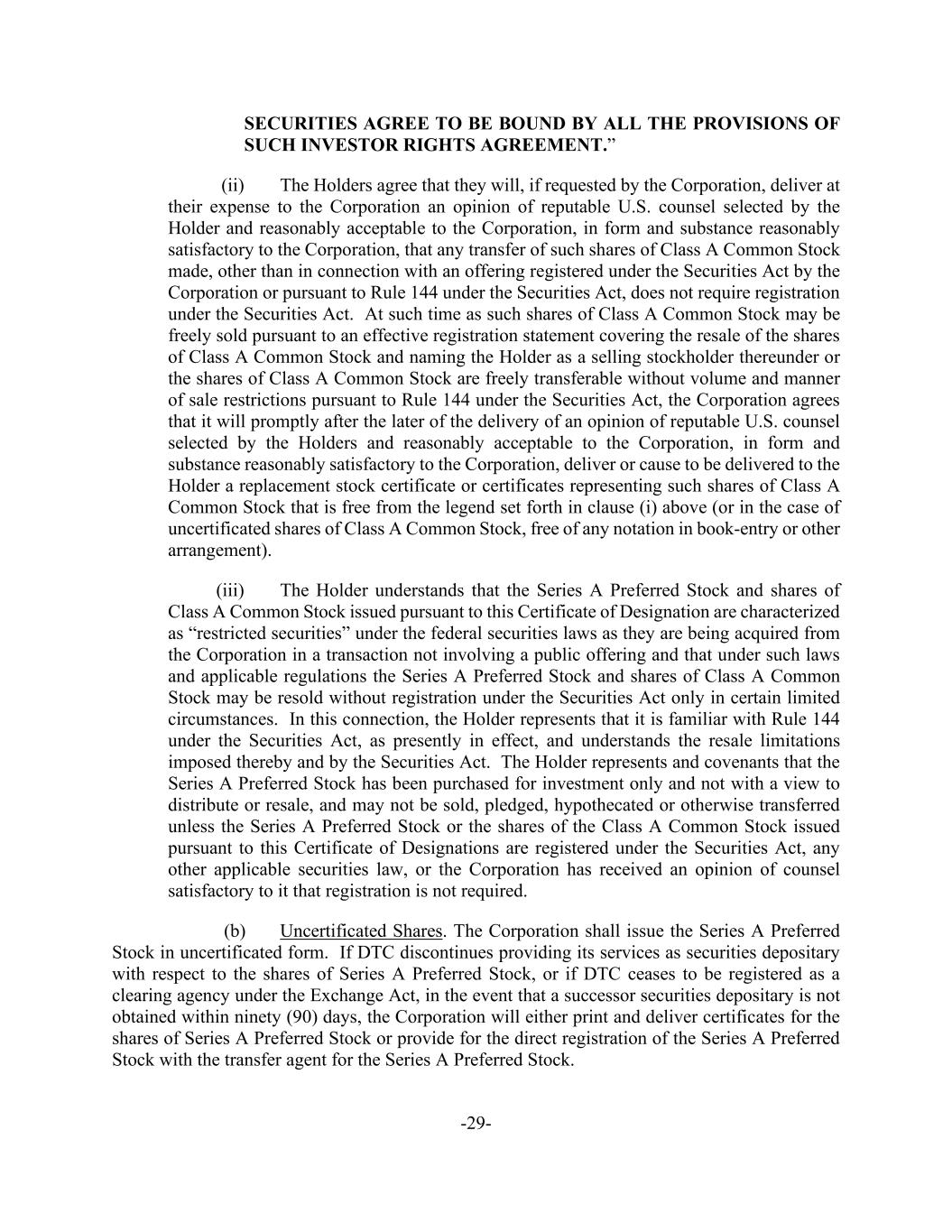 -29- SECURITIES AGREE TO BE BOUND BY ALL THE PROVISIONS OF SUCH INVESTOR RIGHTS AGREEMENT.” (ii) The Holders agree that they will, if requested by the Corporation, deliver at their expense to the Corporation an opinion of reputable U.S. counsel selected by the Holder and reasonably acceptable to the Corporation, in form and substance reasonably satisfactory to the Corporation, that any transfer of such shares of Class A Common Stock made, other than in connection with an offering registered under the Securities Act by the Corporation or pursuant to Rule 144 under the Securities Act, does not require registration under the Securities Act. At such time as such shares of Class A Common Stock may be freely sold pursuant to an effective registration statement covering the resale of the shares of Class A Common Stock and naming the Holder as a selling stockholder thereunder or the shares of Class A Common Stock are freely transferable without volume and manner of sale restrictions pursuant to Rule 144 under the Securities Act, the Corporation agrees that it will promptly after the later of the delivery of an opinion of reputable U.S. counsel selected by the Holders and reasonably acceptable to the Corporation, in form and substance reasonably satisfactory to the Corporation, deliver or cause to be delivered to the Holder a replacement stock certificate or certificates representing such shares of Class A Common Stock that is free from the legend set forth in clause (i) above (or in the case of uncertificated shares of Class A Common Stock, free of any notation in book-entry or other arrangement). (iii) The Holder understands that the Series A Preferred Stock and shares of Class A Common Stock issued pursuant to this Certificate of Designation are characterized as “restricted securities” under the federal securities laws as they are being acquired from the Corporation in a transaction not involving a public offering and that under such laws and applicable regulations the Series A Preferred Stock and shares of Class A Common Stock may be resold without registration under the Securities Act only in certain limited circumstances. In this connection, the Holder represents that it is familiar with Rule 144 under the Securities Act, as presently in effect, and understands the resale limitations imposed thereby and by the Securities Act. The Holder represents and covenants that the Series A Preferred Stock has been purchased for investment only and not with a view to distribute or resale, and may not be sold, pledged, hypothecated or otherwise transferred unless the Series A Preferred Stock or the shares of the Class A Common Stock issued pursuant to this Certificate of Designations are registered under the Securities Act, any other applicable securities law, or the Corporation has received an opinion of counsel satisfactory to it that registration is not required. (b) Uncertificated Shares. The Corporation shall issue the Series A Preferred Stock in uncertificated form. If DTC discontinues providing its services as securities depositary with respect to the shares of Series A Preferred Stock, or if DTC ceases to be registered as a clearing agency under the Exchange Act, in the event that a successor securities depositary is not obtained within ninety (90) days, the Corporation will either print and deliver certificates for the shares of Series A Preferred Stock or provide for the direct registration of the Series A Preferred Stock with the transfer agent for the Series A Preferred Stock.