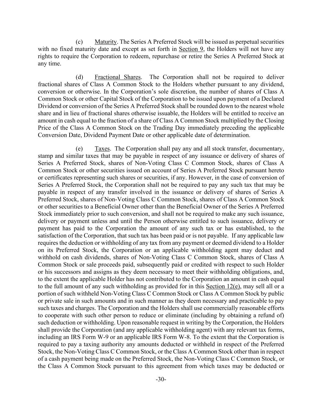 -30- (c) Maturity. The Series A Preferred Stock will be issued as perpetual securities with no fixed maturity date and except as set forth in Section 9, the Holders will not have any rights to require the Corporation to redeem, repurchase or retire the Series A Preferred Stock at any time. (d) Fractional Shares. The Corporation shall not be required to deliver fractional shares of Class A Common Stock to the Holders whether pursuant to any dividend, conversion or otherwise. In the Corporation’s sole discretion, the number of shares of Class A Common Stock or other Capital Stock of the Corporation to be issued upon payment of a Declared Dividend or conversion of the Series A Preferred Stock shall be rounded down to the nearest whole share and in lieu of fractional shares otherwise issuable, the Holders will be entitled to receive an amount in cash equal to the fraction of a share of Class A Common Stock multiplied by the Closing Price of the Class A Common Stock on the Trading Day immediately preceding the applicable Conversion Date, Dividend Payment Date or other applicable date of determination. (e) Taxes. The Corporation shall pay any and all stock transfer, documentary, stamp and similar taxes that may be payable in respect of any issuance or delivery of shares of Series A Preferred Stock, shares of Non-Voting Class C Common Stock, shares of Class A Common Stock or other securities issued on account of Series A Preferred Stock pursuant hereto or certificates representing such shares or securities, if any. However, in the case of conversion of Series A Preferred Stock, the Corporation shall not be required to pay any such tax that may be payable in respect of any transfer involved in the issuance or delivery of shares of Series A Preferred Stock, shares of Non-Voting Class C Common Stock, shares of Class A Common Stock or other securities to a Beneficial Owner other than the Beneficial Owner of the Series A Preferred Stock immediately prior to such conversion, and shall not be required to make any such issuance, delivery or payment unless and until the Person otherwise entitled to such issuance, delivery or payment has paid to the Corporation the amount of any such tax or has established, to the satisfaction of the Corporation, that such tax has been paid or is not payable. If any applicable law requires the deduction or withholding of any tax from any payment or deemed dividend to a Holder on its Preferred Stock, the Corporation or an applicable withholding agent may deduct and withhold on cash dividends, shares of Non-Voting Class C Common Stock, shares of Class A Common Stock or sale proceeds paid, subsequently paid or credited with respect to such Holder or his successors and assigns as they deem necessary to meet their withholding obligations, and, to the extent the applicable Holder has not contributed to the Corporation an amount in cash equal to the full amount of any such withholding as provided for in this Section 12(e), may sell all or a portion of such withheld Non-Voting Class C Common Stock or Class A Common Stock by public or private sale in such amounts and in such manner as they deem necessary and practicable to pay such taxes and charges. The Corporation and the Holders shall use commercially reasonable efforts to cooperate with such other person to reduce or eliminate (including by obtaining a refund of) such deduction or withholding. Upon reasonable request in writing by the Corporation, the Holders shall provide the Corporation (and any applicable withholding agent) with any relevant tax forms, including an IRS Form W-9 or an applicable IRS Form W-8. To the extent that the Corporation is required to pay a taxing authority any amounts deducted or withheld in respect of the Preferred Stock, the Non-Voting Class C Common Stock, or the Class A Common Stock other than in respect of a cash payment being made on the Preferred Stock, the Non-Voting Class C Common Stock, or the Class A Common Stock pursuant to this agreement from which taxes may be deducted or
