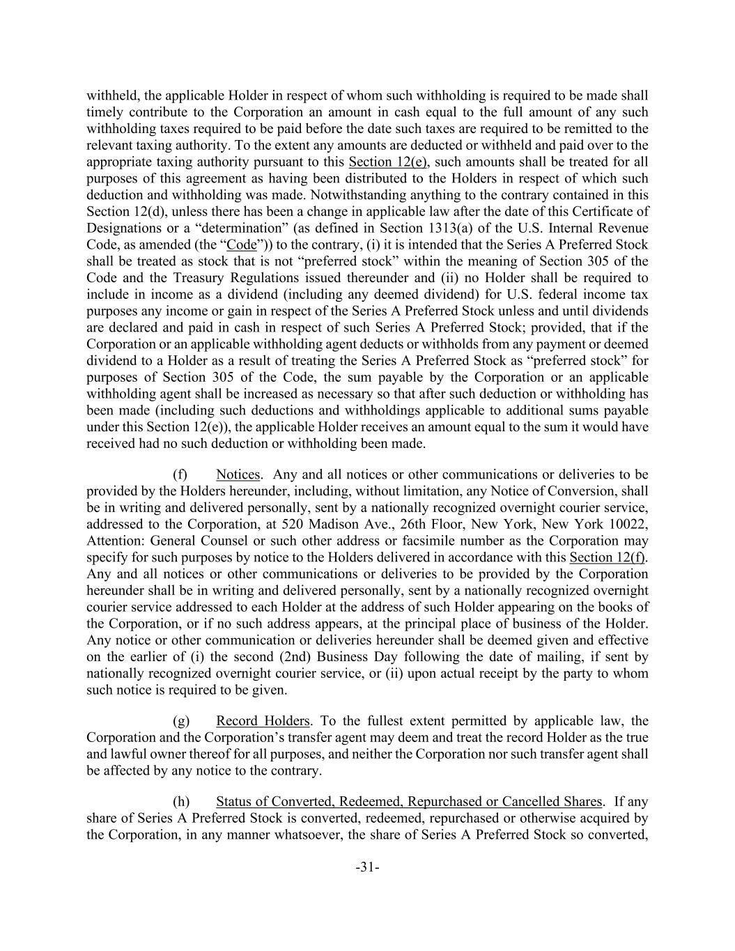 -31- withheld, the applicable Holder in respect of whom such withholding is required to be made shall timely contribute to the Corporation an amount in cash equal to the full amount of any such withholding taxes required to be paid before the date such taxes are required to be remitted to the relevant taxing authority. To the extent any amounts are deducted or withheld and paid over to the appropriate taxing authority pursuant to this Section 12(e), such amounts shall be treated for all purposes of this agreement as having been distributed to the Holders in respect of which such deduction and withholding was made. Notwithstanding anything to the contrary contained in this Section 12(d), unless there has been a change in applicable law after the date of this Certificate of Designations or a “determination” (as defined in Section 1313(a) of the U.S. Internal Revenue Code, as amended (the “Code”)) to the contrary, (i) it is intended that the Series A Preferred Stock shall be treated as stock that is not “preferred stock” within the meaning of Section 305 of the Code and the Treasury Regulations issued thereunder and (ii) no Holder shall be required to include in income as a dividend (including any deemed dividend) for U.S. federal income tax purposes any income or gain in respect of the Series A Preferred Stock unless and until dividends are declared and paid in cash in respect of such Series A Preferred Stock; provided, that if the Corporation or an applicable withholding agent deducts or withholds from any payment or deemed dividend to a Holder as a result of treating the Series A Preferred Stock as “preferred stock” for purposes of Section 305 of the Code, the sum payable by the Corporation or an applicable withholding agent shall be increased as necessary so that after such deduction or withholding has been made (including such deductions and withholdings applicable to additional sums payable under this Section 12(e)), the applicable Holder receives an amount equal to the sum it would have received had no such deduction or withholding been made. (f) Notices. Any and all notices or other communications or deliveries to be provided by the Holders hereunder, including, without limitation, any Notice of Conversion, shall be in writing and delivered personally, sent by a nationally recognized overnight courier service, addressed to the Corporation, at 520 Madison Ave., 26th Floor, New York, New York 10022, Attention: General Counsel or such other address or facsimile number as the Corporation may specify for such purposes by notice to the Holders delivered in accordance with this Section 12(f). Any and all notices or other communications or deliveries to be provided by the Corporation hereunder shall be in writing and delivered personally, sent by a nationally recognized overnight courier service addressed to each Holder at the address of such Holder appearing on the books of the Corporation, or if no such address appears, at the principal place of business of the Holder. Any notice or other communication or deliveries hereunder shall be deemed given and effective on the earlier of (i) the second (2nd) Business Day following the date of mailing, if sent by nationally recognized overnight courier service, or (ii) upon actual receipt by the party to whom such notice is required to be given. (g) Record Holders. To the fullest extent permitted by applicable law, the Corporation and the Corporation’s transfer agent may deem and treat the record Holder as the true and lawful owner thereof for all purposes, and neither the Corporation nor such transfer agent shall be affected by any notice to the contrary. (h) Status of Converted, Redeemed, Repurchased or Cancelled Shares. If any share of Series A Preferred Stock is converted, redeemed, repurchased or otherwise acquired by the Corporation, in any manner whatsoever, the share of Series A Preferred Stock so converted,
