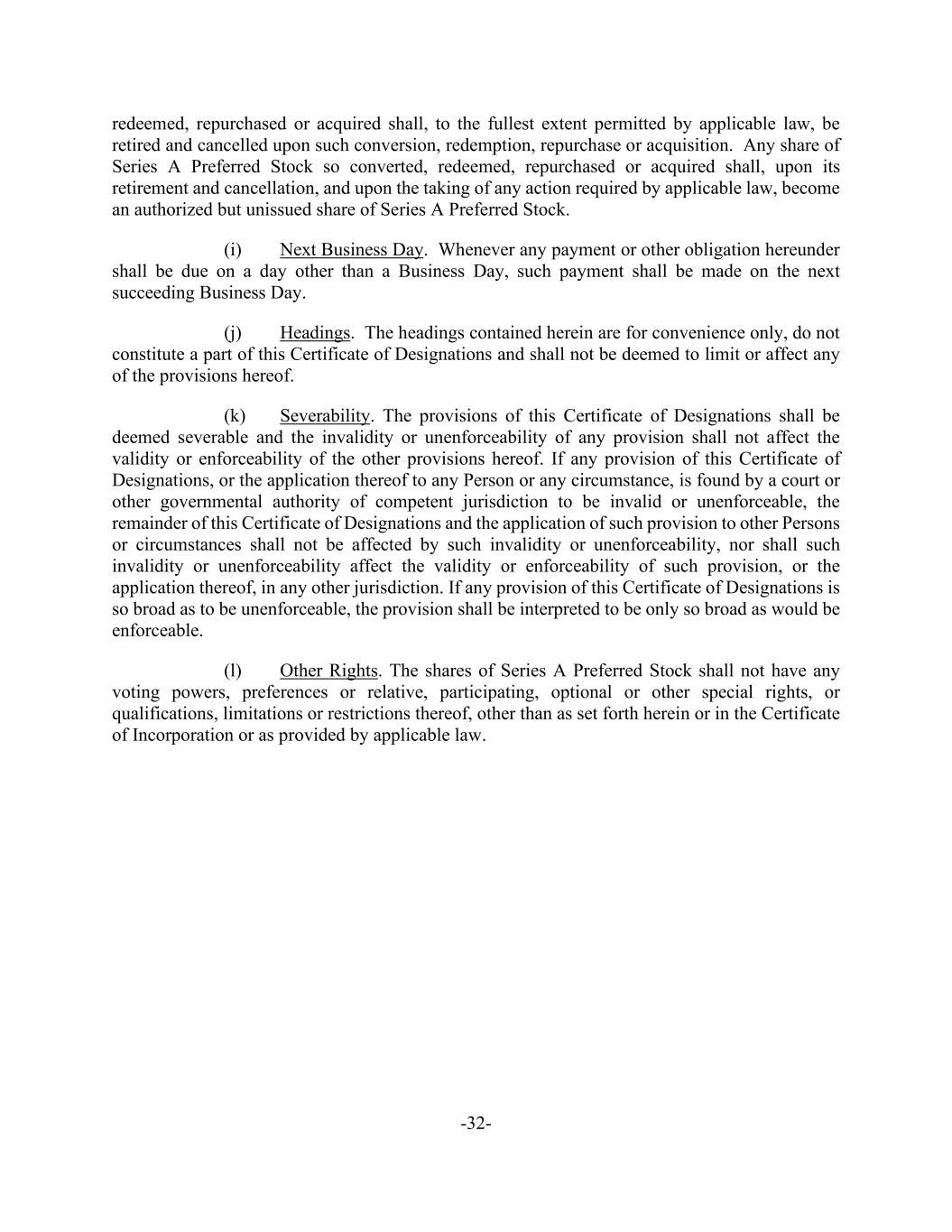 -32- redeemed, repurchased or acquired shall, to the fullest extent permitted by applicable law, be retired and cancelled upon such conversion, redemption, repurchase or acquisition. Any share of Series A Preferred Stock so converted, redeemed, repurchased or acquired shall, upon its retirement and cancellation, and upon the taking of any action required by applicable law, become an authorized but unissued share of Series A Preferred Stock. (i) Next Business Day. Whenever any payment or other obligation hereunder shall be due on a day other than a Business Day, such payment shall be made on the next succeeding Business Day. (j) Headings. The headings contained herein are for convenience only, do not constitute a part of this Certificate of Designations and shall not be deemed to limit or affect any of the provisions hereof. (k) Severability. The provisions of this Certificate of Designations shall be deemed severable and the invalidity or unenforceability of any provision shall not affect the validity or enforceability of the other provisions hereof. If any provision of this Certificate of Designations, or the application thereof to any Person or any circumstance, is found by a court or other governmental authority of competent jurisdiction to be invalid or unenforceable, the remainder of this Certificate of Designations and the application of such provision to other Persons or circumstances shall not be affected by such invalidity or unenforceability, nor shall such invalidity or unenforceability affect the validity or enforceability of such provision, or the application thereof, in any other jurisdiction. If any provision of this Certificate of Designations is so broad as to be unenforceable, the provision shall be interpreted to be only so broad as would be enforceable. (l) Other Rights. The shares of Series A Preferred Stock shall not have any voting powers, preferences or relative, participating, optional or other special rights, or qualifications, limitations or restrictions thereof, other than as set forth herein or in the Certificate of Incorporation or as provided by applicable law.
