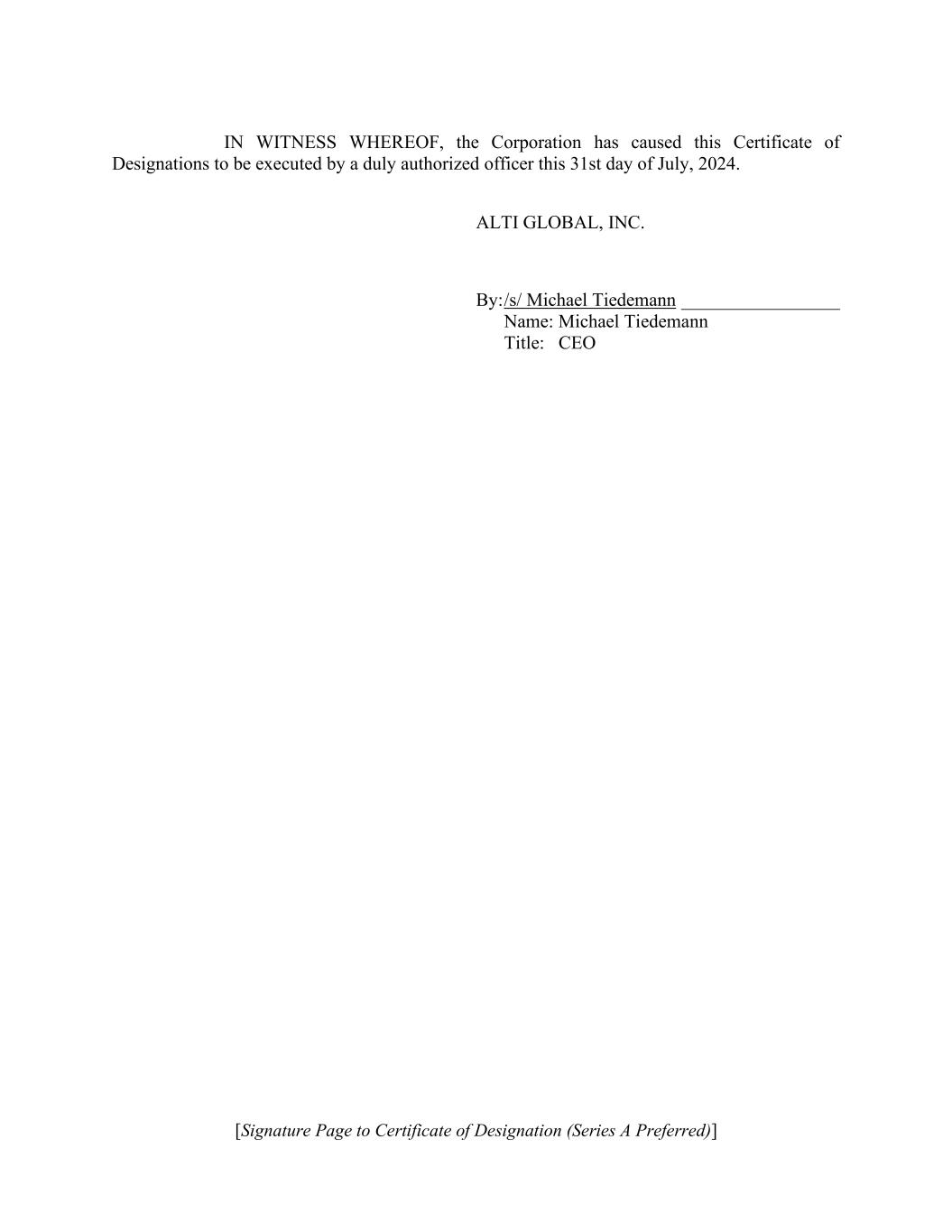 [Signature Page to Certificate of Designation (Series A Preferred)] IN WITNESS WHEREOF, the Corporation has caused this Certificate of Designations to be executed by a duly authorized officer this 31st day of July, 2024. ALTI GLOBAL, INC. By: /s/ Michael Tiedemann _________________ Name: Michael Tiedemann Title: CEO