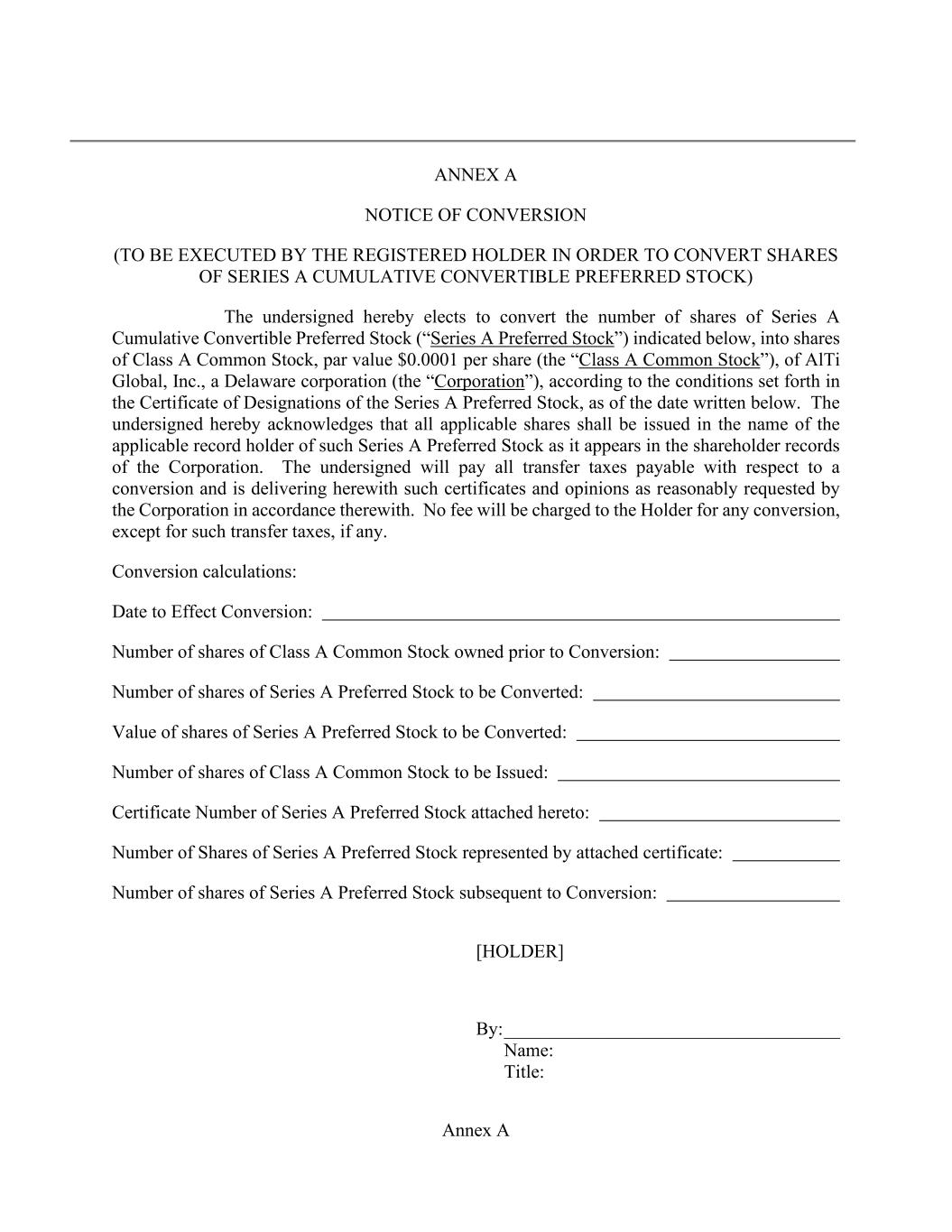 Annex A ANNEX A NOTICE OF CONVERSION (TO BE EXECUTED BY THE REGISTERED HOLDER IN ORDER TO CONVERT SHARES OF SERIES A CUMULATIVE CONVERTIBLE PREFERRED STOCK) The undersigned hereby elects to convert the number of shares of Series A Cumulative Convertible Preferred Stock (“Series A Preferred Stock”) indicated below, into shares of Class A Common Stock, par value $0.0001 per share (the “Class A Common Stock”), of AlTi Global, Inc., a Delaware corporation (the “Corporation”), according to the conditions set forth in the Certificate of Designations of the Series A Preferred Stock, as of the date written below. The undersigned hereby acknowledges that all applicable shares shall be issued in the name of the applicable record holder of such Series A Preferred Stock as it appears in the shareholder records of the Corporation. The undersigned will pay all transfer taxes payable with respect to a conversion and is delivering herewith such certificates and opinions as reasonably requested by the Corporation in accordance therewith. No fee will be charged to the Holder for any conversion, except for such transfer taxes, if any. Conversion calculations: Date to Effect Conversion: Number of shares of Class A Common Stock owned prior to Conversion: Number of shares of Series A Preferred Stock to be Converted: Value of shares of Series A Preferred Stock to be Converted: Number of shares of Class A Common Stock to be Issued: Certificate Number of Series A Preferred Stock attached hereto: Number of Shares of Series A Preferred Stock represented by attached certificate: Number of shares of Series A Preferred Stock subsequent to Conversion: [HOLDER] By: ____________________________________ Name: Title: