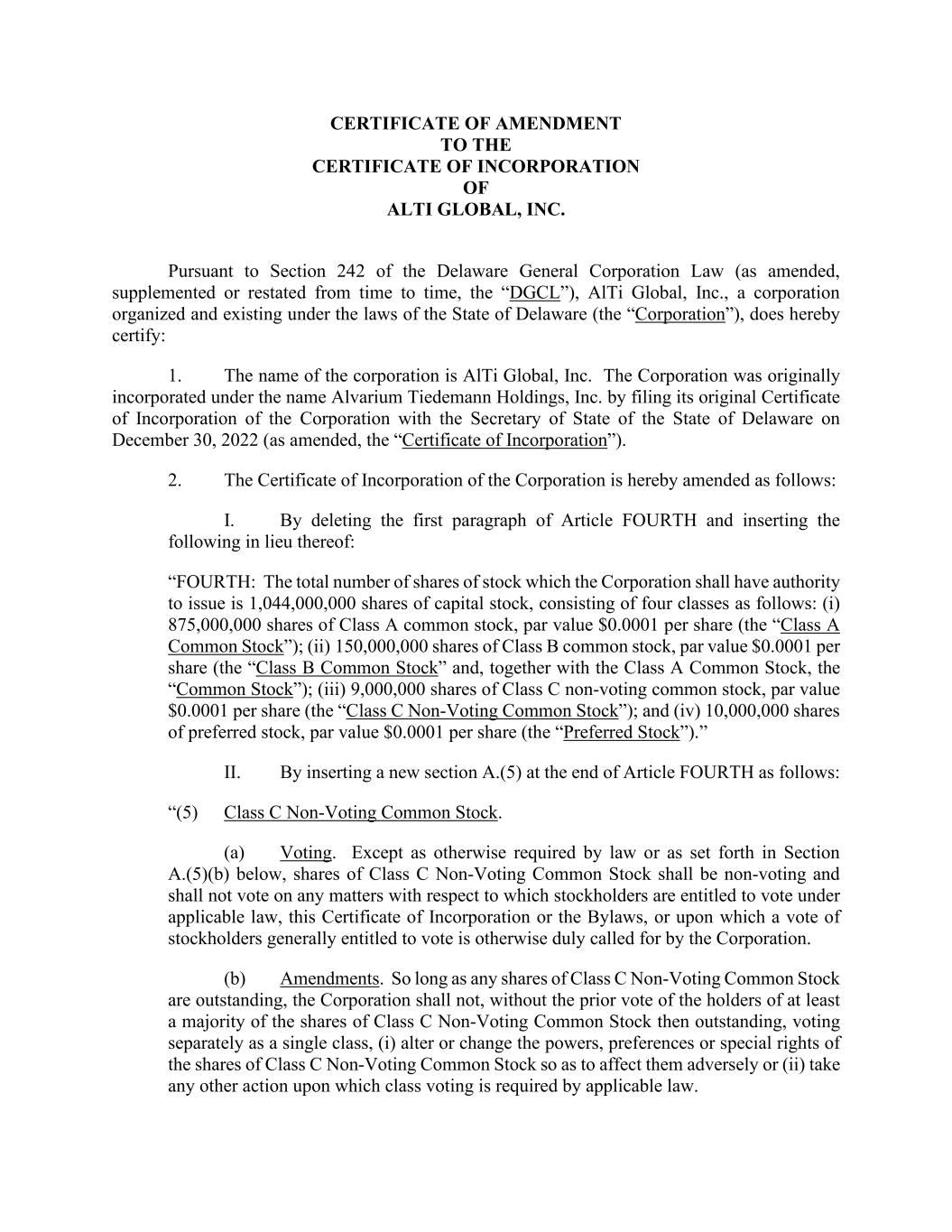 CERTIFICATE OF AMENDMENT TO THE CERTIFICATE OF INCORPORATION OF ALTI GLOBAL, INC. Pursuant to Section 242 of the Delaware General Corporation Law (as amended, supplemented or restated from time to time, the “DGCL”), AlTi Global, Inc., a corporation organized and existing under the laws of the State of Delaware (the “Corporation”), does hereby certify: 1. The name of the corporation is AlTi Global, Inc. The Corporation was originally incorporated under the name Alvarium Tiedemann Holdings, Inc. by filing its original Certificate of Incorporation of the Corporation with the Secretary of State of the State of Delaware on December 30, 2022 (as amended, the “Certificate of Incorporation”). 2. The Certificate of Incorporation of the Corporation is hereby amended as follows: I. By deleting the first paragraph of Article FOURTH and inserting the following in lieu thereof: “FOURTH: The total number of shares of stock which the Corporation shall have authority to issue is 1,044,000,000 shares of capital stock, consisting of four classes as follows: (i) 875,000,000 shares of Class A common stock, par value $0.0001 per share (the “Class A Common Stock”); (ii) 150,000,000 shares of Class B common stock, par value $0.0001 per share (the “Class B Common Stock” and, together with the Class A Common Stock, the “Common Stock”); (iii) 9,000,000 shares of Class C non-voting common stock, par value $0.0001 per share (the “Class C Non-Voting Common Stock”); and (iv) 10,000,000 shares of preferred stock, par value $0.0001 per share (the “Preferred Stock”).” II. By inserting a new section A.(5) at the end of Article FOURTH as follows: “(5) Class C Non-Voting Common Stock. (a) Voting. Except as otherwise required by law or as set forth in Section A.(5)(b) below, shares of Class C Non-Voting Common Stock shall be non-voting and shall not vote on any matters with respect to which stockholders are entitled to vote under applicable law, this Certificate of Incorporation or the Bylaws, or upon which a vote of stockholders generally entitled to vote is otherwise duly called for by the Corporation. (b) Amendments. So long as any shares of Class C Non-Voting Common Stock are outstanding, the Corporation shall not, without the prior vote of the holders of at least a majority of the shares of Class C Non-Voting Common Stock then outstanding, voting separately as a single class, (i) alter or change the powers, preferences or special rights of the shares of Class C Non-Voting Common Stock so as to affect them adversely or (ii) take any other action upon which class voting is required by applicable law.
