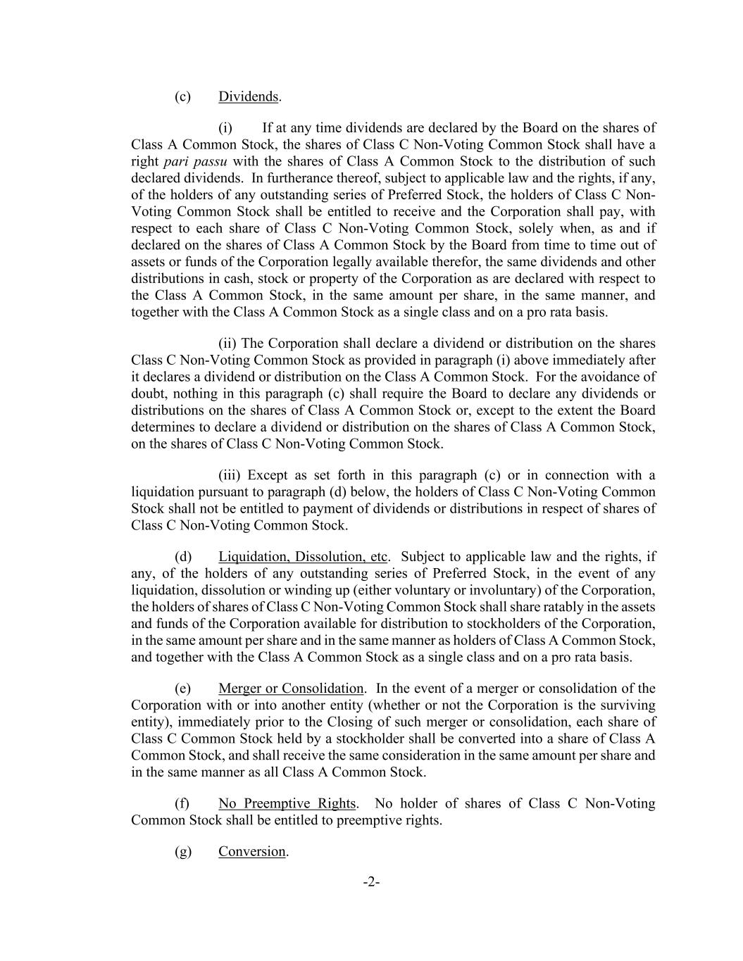 -2- (c) Dividends. (i) If at any time dividends are declared by the Board on the shares of Class A Common Stock, the shares of Class C Non-Voting Common Stock shall have a right pari passu with the shares of Class A Common Stock to the distribution of such declared dividends. In furtherance thereof, subject to applicable law and the rights, if any, of the holders of any outstanding series of Preferred Stock, the holders of Class C Non- Voting Common Stock shall be entitled to receive and the Corporation shall pay, with respect to each share of Class C Non-Voting Common Stock, solely when, as and if declared on the shares of Class A Common Stock by the Board from time to time out of assets or funds of the Corporation legally available therefor, the same dividends and other distributions in cash, stock or property of the Corporation as are declared with respect to the Class A Common Stock, in the same amount per share, in the same manner, and together with the Class A Common Stock as a single class and on a pro rata basis. (ii) The Corporation shall declare a dividend or distribution on the shares Class C Non-Voting Common Stock as provided in paragraph (i) above immediately after it declares a dividend or distribution on the Class A Common Stock. For the avoidance of doubt, nothing in this paragraph (c) shall require the Board to declare any dividends or distributions on the shares of Class A Common Stock or, except to the extent the Board determines to declare a dividend or distribution on the shares of Class A Common Stock, on the shares of Class C Non-Voting Common Stock. (iii) Except as set forth in this paragraph (c) or in connection with a liquidation pursuant to paragraph (d) below, the holders of Class C Non-Voting Common Stock shall not be entitled to payment of dividends or distributions in respect of shares of Class C Non-Voting Common Stock. (d) Liquidation, Dissolution, etc. Subject to applicable law and the rights, if any, of the holders of any outstanding series of Preferred Stock, in the event of any liquidation, dissolution or winding up (either voluntary or involuntary) of the Corporation, the holders of shares of Class C Non-Voting Common Stock shall share ratably in the assets and funds of the Corporation available for distribution to stockholders of the Corporation, in the same amount per share and in the same manner as holders of Class A Common Stock, and together with the Class A Common Stock as a single class and on a pro rata basis. (e) Merger or Consolidation. In the event of a merger or consolidation of the Corporation with or into another entity (whether or not the Corporation is the surviving entity), immediately prior to the Closing of such merger or consolidation, each share of Class C Common Stock held by a stockholder shall be converted into a share of Class A Common Stock, and shall receive the same consideration in the same amount per share and in the same manner as all Class A Common Stock. (f) No Preemptive Rights. No holder of shares of Class C Non-Voting Common Stock shall be entitled to preemptive rights. (g) Conversion.