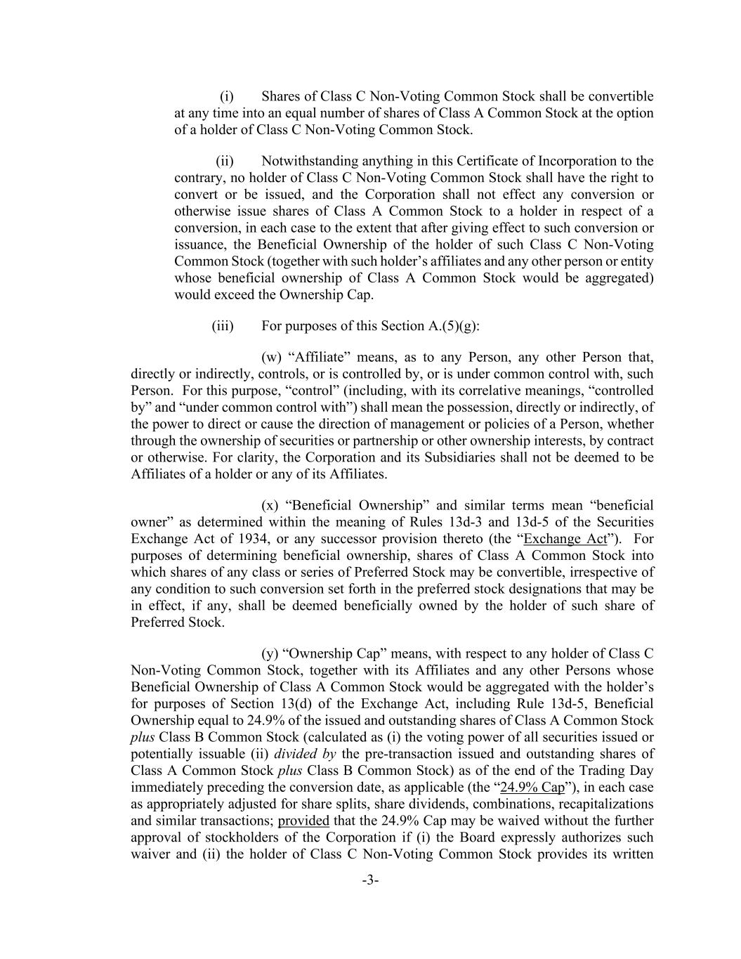 -3- (i) Shares of Class C Non-Voting Common Stock shall be convertible at any time into an equal number of shares of Class A Common Stock at the option of a holder of Class C Non-Voting Common Stock. (ii) Notwithstanding anything in this Certificate of Incorporation to the contrary, no holder of Class C Non-Voting Common Stock shall have the right to convert or be issued, and the Corporation shall not effect any conversion or otherwise issue shares of Class A Common Stock to a holder in respect of a conversion, in each case to the extent that after giving effect to such conversion or issuance, the Beneficial Ownership of the holder of such Class C Non-Voting Common Stock (together with such holder’s affiliates and any other person or entity whose beneficial ownership of Class A Common Stock would be aggregated) would exceed the Ownership Cap. (iii) For purposes of this Section A.(5)(g): (w) “Affiliate” means, as to any Person, any other Person that, directly or indirectly, controls, or is controlled by, or is under common control with, such Person. For this purpose, “control” (including, with its correlative meanings, “controlled by” and “under common control with”) shall mean the possession, directly or indirectly, of the power to direct or cause the direction of management or policies of a Person, whether through the ownership of securities or partnership or other ownership interests, by contract or otherwise. For clarity, the Corporation and its Subsidiaries shall not be deemed to be Affiliates of a holder or any of its Affiliates. (x) “Beneficial Ownership” and similar terms mean “beneficial owner” as determined within the meaning of Rules 13d-3 and 13d-5 of the Securities Exchange Act of 1934, or any successor provision thereto (the “Exchange Act”). For purposes of determining beneficial ownership, shares of Class A Common Stock into which shares of any class or series of Preferred Stock may be convertible, irrespective of any condition to such conversion set forth in the preferred stock designations that may be in effect, if any, shall be deemed beneficially owned by the holder of such share of Preferred Stock. (y) “Ownership Cap” means, with respect to any holder of Class C Non-Voting Common Stock, together with its Affiliates and any other Persons whose Beneficial Ownership of Class A Common Stock would be aggregated with the holder’s for purposes of Section 13(d) of the Exchange Act, including Rule 13d-5, Beneficial Ownership equal to 24.9% of the issued and outstanding shares of Class A Common Stock plus Class B Common Stock (calculated as (i) the voting power of all securities issued or potentially issuable (ii) divided by the pre-transaction issued and outstanding shares of Class A Common Stock plus Class B Common Stock) as of the end of the Trading Day immediately preceding the conversion date, as applicable (the “24.9% Cap”), in each case as appropriately adjusted for share splits, share dividends, combinations, recapitalizations and similar transactions; provided that the 24.9% Cap may be waived without the further approval of stockholders of the Corporation if (i) the Board expressly authorizes such waiver and (ii) the holder of Class C Non-Voting Common Stock provides its written