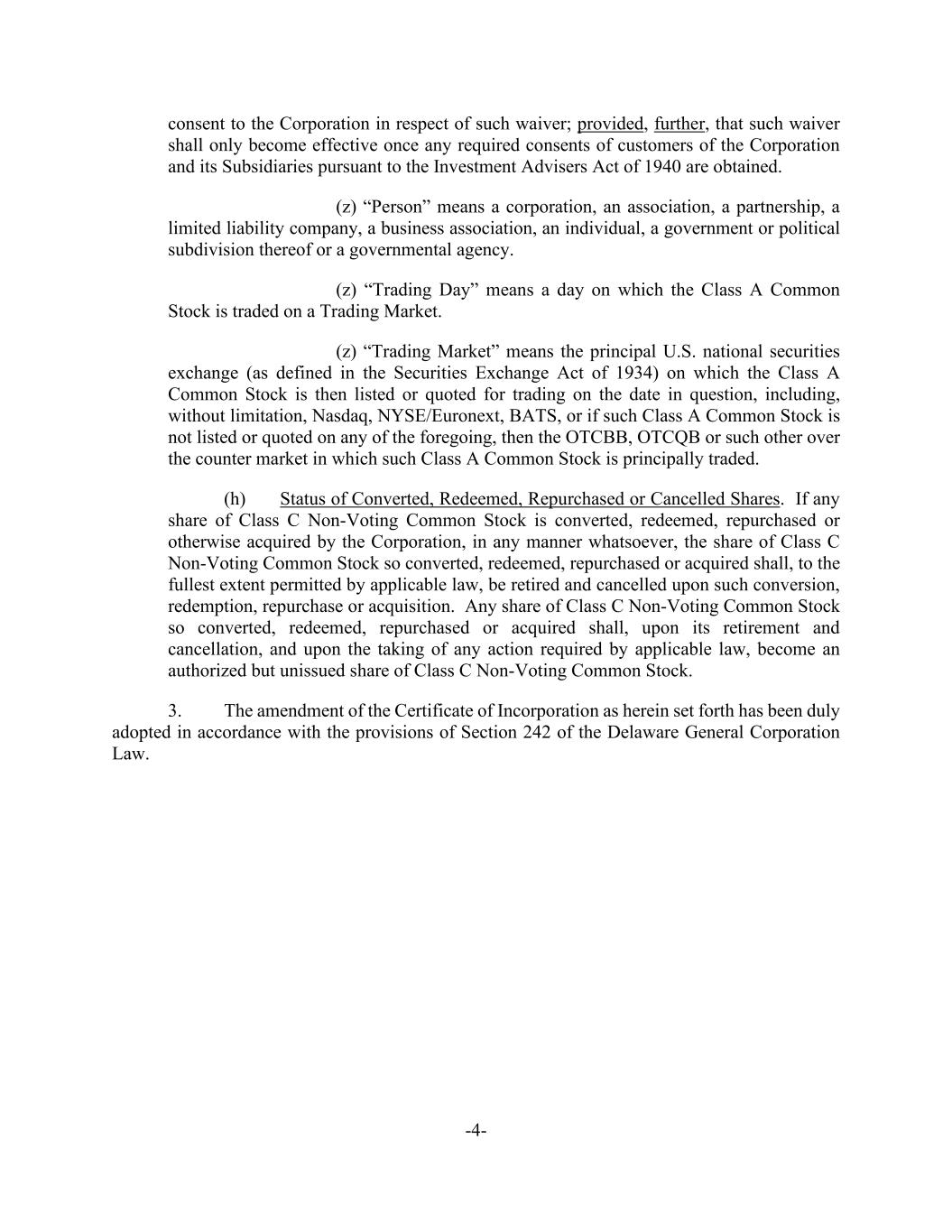 -4- consent to the Corporation in respect of such waiver; provided, further, that such waiver shall only become effective once any required consents of customers of the Corporation and its Subsidiaries pursuant to the Investment Advisers Act of 1940 are obtained. (z) “Person” means a corporation, an association, a partnership, a limited liability company, a business association, an individual, a government or political subdivision thereof or a governmental agency. (z) “Trading Day” means a day on which the Class A Common Stock is traded on a Trading Market. (z) “Trading Market” means the principal U.S. national securities exchange (as defined in the Securities Exchange Act of 1934) on which the Class A Common Stock is then listed or quoted for trading on the date in question, including, without limitation, Nasdaq, NYSE/Euronext, BATS, or if such Class A Common Stock is not listed or quoted on any of the foregoing, then the OTCBB, OTCQB or such other over the counter market in which such Class A Common Stock is principally traded. (h) Status of Converted, Redeemed, Repurchased or Cancelled Shares. If any share of Class C Non-Voting Common Stock is converted, redeemed, repurchased or otherwise acquired by the Corporation, in any manner whatsoever, the share of Class C Non-Voting Common Stock so converted, redeemed, repurchased or acquired shall, to the fullest extent permitted by applicable law, be retired and cancelled upon such conversion, redemption, repurchase or acquisition. Any share of Class C Non-Voting Common Stock so converted, redeemed, repurchased or acquired shall, upon its retirement and cancellation, and upon the taking of any action required by applicable law, become an authorized but unissued share of Class C Non-Voting Common Stock. 3. The amendment of the Certificate of Incorporation as herein set forth has been duly adopted in accordance with the provisions of Section 242 of the Delaware General Corporation Law.