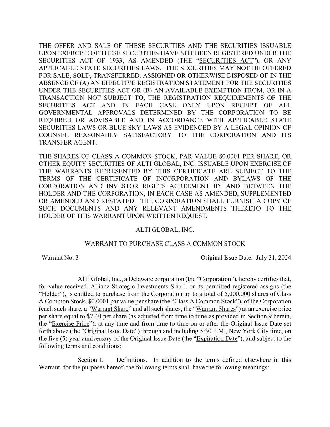 THE OFFER AND SALE OF THESE SECURITIES AND THE SECURITIES ISSUABLE UPON EXERCISE OF THESE SECURITIES HAVE NOT BEEN REGISTERED UNDER THE SECURITIES ACT OF 1933, AS AMENDED (THE “SECURITIES ACT”), OR ANY APPLICABLE STATE SECURITIES LAWS. THE SECURITIES MAY NOT BE OFFERED FOR SALE, SOLD, TRANSFERRED, ASSIGNED OR OTHERWISE DISPOSED OF IN THE ABSENCE OF (A) AN EFFECTIVE REGISTRATION STATEMENT FOR THE SECURITIES UNDER THE SECURITIES ACT OR (B) AN AVAILABLE EXEMPTION FROM, OR IN A TRANSACTION NOT SUBJECT TO, THE REGISTRATION REQUIREMENTS OF THE SECURITIES ACT AND IN EACH CASE ONLY UPON RECEIPT OF ALL GOVERNMENTAL APPROVALS DETERMINED BY THE CORPORATION TO BE REQUIRED OR ADVISABLE AND IN ACCORDANCE WITH APPLICABLE STATE SECURITIES LAWS OR BLUE SKY LAWS AS EVIDENCED BY A LEGAL OPINION OF COUNSEL REASONABLY SATISFACTORY TO THE CORPORATION AND ITS TRANSFER AGENT. THE SHARES OF CLASS A COMMON STOCK, PAR VALUE $0.0001 PER SHARE, OR OTHER EQUITY SECURITIES OF ALTI GLOBAL, INC. ISSUABLE UPON EXERCISE OF THE WARRANTS REPRESENTED BY THIS CERTIFICATE ARE SUBJECT TO THE TERMS OF THE CERTIFICATE OF INCORPORATION AND BYLAWS OF THE CORPORATION AND INVESTOR RIGHTS AGREEMENT BY AND BETWEEN THE HOLDER AND THE CORPORATION, IN EACH CASE AS AMENDED, SUPPLEMENTED OR AMENDED AND RESTATED. THE CORPORATION SHALL FURNISH A COPY OF SUCH DOCUMENTS AND ANY RELEVANT AMENDMENTS THERETO TO THE HOLDER OF THIS WARRANT UPON WRITTEN REQUEST. ALTI GLOBAL, INC. WARRANT TO PURCHASE CLASS A COMMON STOCK Warrant No. 3 Original Issue Date: July 31, 2024 AlTi Global, Inc., a Delaware corporation (the “Corporation”), hereby certifies that, for value received, Allianz Strategic Investments S.à.r.l. or its permitted registered assigns (the “Holder”), is entitled to purchase from the Corporation up to a total of 5,000,000 shares of Class A Common Stock, $0.0001 par value per share (the “Class A Common Stock”), of the Corporation (each such share, a “Warrant Share” and all such shares, the “Warrant Shares”) at an exercise price per share equal to $7.40 per share (as adjusted from time to time as provided in Section 9 herein, the “Exercise Price”), at any time and from time to time on or after the Original Issue Date set forth above (the “Original Issue Date”) through and including 5:30 P.M., New York City time, on the five (5) year anniversary of the Original Issue Date (the “Expiration Date”), and subject to the following terms and conditions: Section 1. Definitions. In addition to the terms defined elsewhere in this Warrant, for the purposes hereof, the following terms shall have the following meanings: