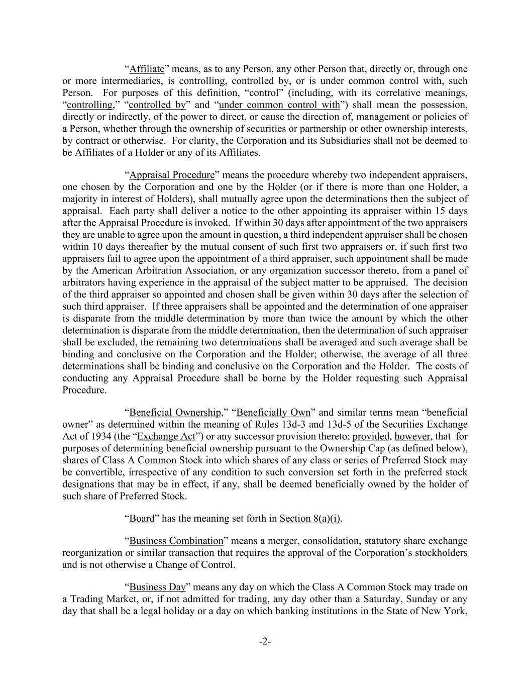 -2- “Affiliate” means, as to any Person, any other Person that, directly or, through one or more intermediaries, is controlling, controlled by, or is under common control with, such Person. For purposes of this definition, “control” (including, with its correlative meanings, “controlling,” “controlled by” and “under common control with”) shall mean the possession, directly or indirectly, of the power to direct, or cause the direction of, management or policies of a Person, whether through the ownership of securities or partnership or other ownership interests, by contract or otherwise. For clarity, the Corporation and its Subsidiaries shall not be deemed to be Affiliates of a Holder or any of its Affiliates. “Appraisal Procedure” means the procedure whereby two independent appraisers, one chosen by the Corporation and one by the Holder (or if there is more than one Holder, a majority in interest of Holders), shall mutually agree upon the determinations then the subject of appraisal. Each party shall deliver a notice to the other appointing its appraiser within 15 days after the Appraisal Procedure is invoked. If within 30 days after appointment of the two appraisers they are unable to agree upon the amount in question, a third independent appraiser shall be chosen within 10 days thereafter by the mutual consent of such first two appraisers or, if such first two appraisers fail to agree upon the appointment of a third appraiser, such appointment shall be made by the American Arbitration Association, or any organization successor thereto, from a panel of arbitrators having experience in the appraisal of the subject matter to be appraised. The decision of the third appraiser so appointed and chosen shall be given within 30 days after the selection of such third appraiser. If three appraisers shall be appointed and the determination of one appraiser is disparate from the middle determination by more than twice the amount by which the other determination is disparate from the middle determination, then the determination of such appraiser shall be excluded, the remaining two determinations shall be averaged and such average shall be binding and conclusive on the Corporation and the Holder; otherwise, the average of all three determinations shall be binding and conclusive on the Corporation and the Holder. The costs of conducting any Appraisal Procedure shall be borne by the Holder requesting such Appraisal Procedure. “Beneficial Ownership,” “Beneficially Own” and similar terms mean “beneficial owner” as determined within the meaning of Rules 13d-3 and 13d-5 of the Securities Exchange Act of 1934 (the “Exchange Act”) or any successor provision thereto; provided, however, that for purposes of determining beneficial ownership pursuant to the Ownership Cap (as defined below), shares of Class A Common Stock into which shares of any class or series of Preferred Stock may be convertible, irrespective of any condition to such conversion set forth in the preferred stock designations that may be in effect, if any, shall be deemed beneficially owned by the holder of such share of Preferred Stock. “Board” has the meaning set forth in Section 8(a)(i). “Business Combination” means a merger, consolidation, statutory share exchange reorganization or similar transaction that requires the approval of the Corporation’s stockholders and is not otherwise a Change of Control. “Business Day” means any day on which the Class A Common Stock may trade on a Trading Market, or, if not admitted for trading, any day other than a Saturday, Sunday or any day that shall be a legal holiday or a day on which banking institutions in the State of New York,