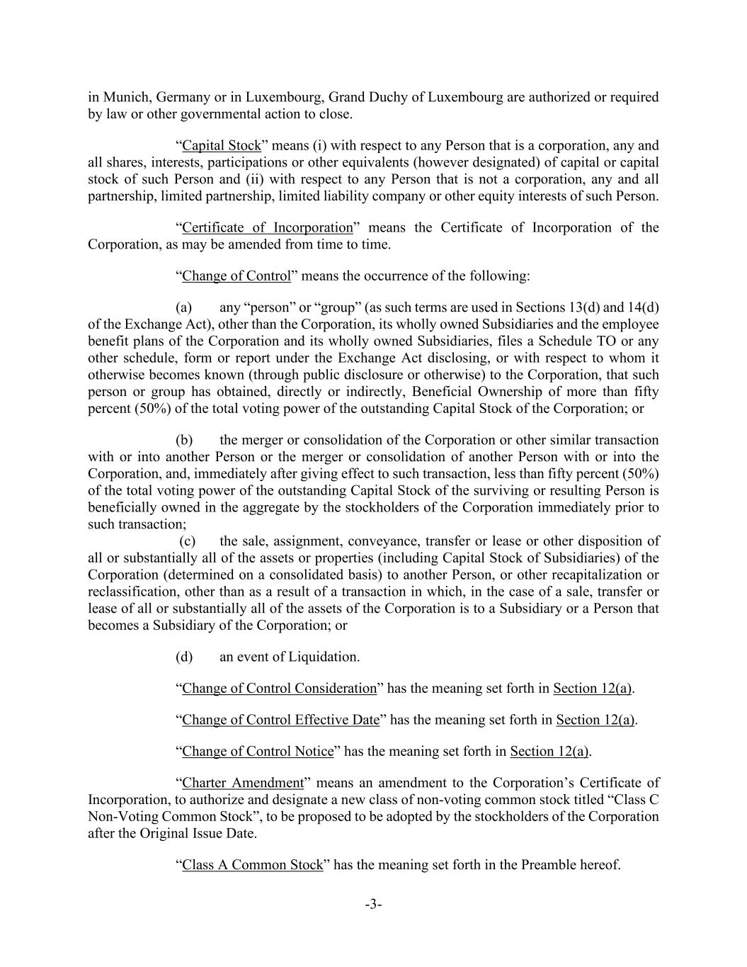 -3- in Munich, Germany or in Luxembourg, Grand Duchy of Luxembourg are authorized or required by law or other governmental action to close. “Capital Stock” means (i) with respect to any Person that is a corporation, any and all shares, interests, participations or other equivalents (however designated) of capital or capital stock of such Person and (ii) with respect to any Person that is not a corporation, any and all partnership, limited partnership, limited liability company or other equity interests of such Person. “Certificate of Incorporation” means the Certificate of Incorporation of the Corporation, as may be amended from time to time. “Change of Control” means the occurrence of the following: (a) any “person” or “group” (as such terms are used in Sections 13(d) and 14(d) of the Exchange Act), other than the Corporation, its wholly owned Subsidiaries and the employee benefit plans of the Corporation and its wholly owned Subsidiaries, files a Schedule TO or any other schedule, form or report under the Exchange Act disclosing, or with respect to whom it otherwise becomes known (through public disclosure or otherwise) to the Corporation, that such person or group has obtained, directly or indirectly, Beneficial Ownership of more than fifty percent (50%) of the total voting power of the outstanding Capital Stock of the Corporation; or (b) the merger or consolidation of the Corporation or other similar transaction with or into another Person or the merger or consolidation of another Person with or into the Corporation, and, immediately after giving effect to such transaction, less than fifty percent (50%) of the total voting power of the outstanding Capital Stock of the surviving or resulting Person is beneficially owned in the aggregate by the stockholders of the Corporation immediately prior to such transaction; (c) the sale, assignment, conveyance, transfer or lease or other disposition of all or substantially all of the assets or properties (including Capital Stock of Subsidiaries) of the Corporation (determined on a consolidated basis) to another Person, or other recapitalization or reclassification, other than as a result of a transaction in which, in the case of a sale, transfer or lease of all or substantially all of the assets of the Corporation is to a Subsidiary or a Person that becomes a Subsidiary of the Corporation; or (d) an event of Liquidation. “Change of Control Consideration” has the meaning set forth in Section 12(a). “Change of Control Effective Date” has the meaning set forth in Section 12(a). “Change of Control Notice” has the meaning set forth in Section 12(a). “Charter Amendment” means an amendment to the Corporation’s Certificate of Incorporation, to authorize and designate a new class of non-voting common stock titled “Class C Non-Voting Common Stock”, to be proposed to be adopted by the stockholders of the Corporation after the Original Issue Date. “Class A Common Stock” has the meaning set forth in the Preamble hereof.