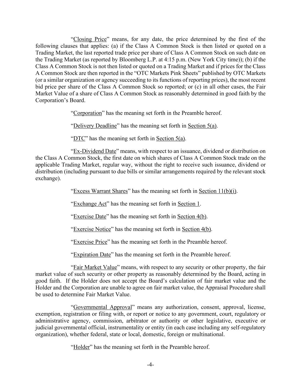 -4- “Closing Price” means, for any date, the price determined by the first of the following clauses that applies: (a) if the Class A Common Stock is then listed or quoted on a Trading Market, the last reported trade price per share of Class A Common Stock on such date on the Trading Market (as reported by Bloomberg L.P. at 4:15 p.m. (New York City time)); (b) if the Class A Common Stock is not then listed or quoted on a Trading Market and if prices for the Class A Common Stock are then reported in the “OTC Markets Pink Sheets” published by OTC Markets (or a similar organization or agency succeeding to its functions of reporting prices), the most recent bid price per share of the Class A Common Stock so reported; or (c) in all other cases, the Fair Market Value of a share of Class A Common Stock as reasonably determined in good faith by the Corporation’s Board. “Corporation” has the meaning set forth in the Preamble hereof. “Delivery Deadline” has the meaning set forth in Section 5(a). “DTC” has the meaning set forth in Section 5(a). “Ex-Dividend Date” means, with respect to an issuance, dividend or distribution on the Class A Common Stock, the first date on which shares of Class A Common Stock trade on the applicable Trading Market, regular way, without the right to receive such issuance, dividend or distribution (including pursuant to due bills or similar arrangements required by the relevant stock exchange). “Excess Warrant Shares” has the meaning set forth in Section 11(b)(i). “Exchange Act” has the meaning set forth in Section 1. “Exercise Date” has the meaning set forth in Section 4(b). “Exercise Notice” has the meaning set forth in Section 4(b). “Exercise Price” has the meaning set forth in the Preamble hereof. “Expiration Date” has the meaning set forth in the Preamble hereof. “Fair Market Value” means, with respect to any security or other property, the fair market value of such security or other property as reasonably determined by the Board, acting in good faith. If the Holder does not accept the Board’s calculation of fair market value and the Holder and the Corporation are unable to agree on fair market value, the Appraisal Procedure shall be used to determine Fair Market Value. “Governmental Approval” means any authorization, consent, approval, license, exemption, registration or filing with, or report or notice to any government, court, regulatory or administrative agency, commission, arbitrator or authority or other legislative, executive or judicial governmental official, instrumentality or entity (in each case including any self-regulatory organization), whether federal, state or local, domestic, foreign or multinational. “Holder” has the meaning set forth in the Preamble hereof.