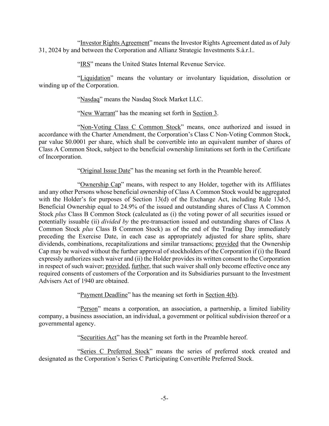 -5- “Investor Rights Agreement” means the Investor Rights Agreement dated as of July 31, 2024 by and between the Corporation and Allianz Strategic Investments S.à.r.l.. “IRS” means the United States Internal Revenue Service. “Liquidation” means the voluntary or involuntary liquidation, dissolution or winding up of the Corporation. “Nasdaq” means the Nasdaq Stock Market LLC. “New Warrant” has the meaning set forth in Section 3. “Non-Voting Class C Common Stock” means, once authorized and issued in accordance with the Charter Amendment, the Corporation’s Class C Non-Voting Common Stock, par value $0.0001 per share, which shall be convertible into an equivalent number of shares of Class A Common Stock, subject to the beneficial ownership limitations set forth in the Certificate of Incorporation. “Original Issue Date” has the meaning set forth in the Preamble hereof. “Ownership Cap” means, with respect to any Holder, together with its Affiliates and any other Persons whose beneficial ownership of Class A Common Stock would be aggregated with the Holder’s for purposes of Section 13(d) of the Exchange Act, including Rule 13d-5, Beneficial Ownership equal to 24.9% of the issued and outstanding shares of Class A Common Stock plus Class B Common Stock (calculated as (i) the voting power of all securities issued or potentially issuable (ii) divided by the pre-transaction issued and outstanding shares of Class A Common Stock plus Class B Common Stock) as of the end of the Trading Day immediately preceding the Exercise Date, in each case as appropriately adjusted for share splits, share dividends, combinations, recapitalizations and similar transactions; provided that the Ownership Cap may be waived without the further approval of stockholders of the Corporation if (i) the Board expressly authorizes such waiver and (ii) the Holder provides its written consent to the Corporation in respect of such waiver; provided, further, that such waiver shall only become effective once any required consents of customers of the Corporation and its Subsidiaries pursuant to the Investment Advisers Act of 1940 are obtained. “Payment Deadline” has the meaning set forth in Section 4(b). “Person” means a corporation, an association, a partnership, a limited liability company, a business association, an individual, a government or political subdivision thereof or a governmental agency. “Securities Act” has the meaning set forth in the Preamble hereof. “Series C Preferred Stock” means the series of preferred stock created and designated as the Corporation’s Series C Participating Convertible Preferred Stock.