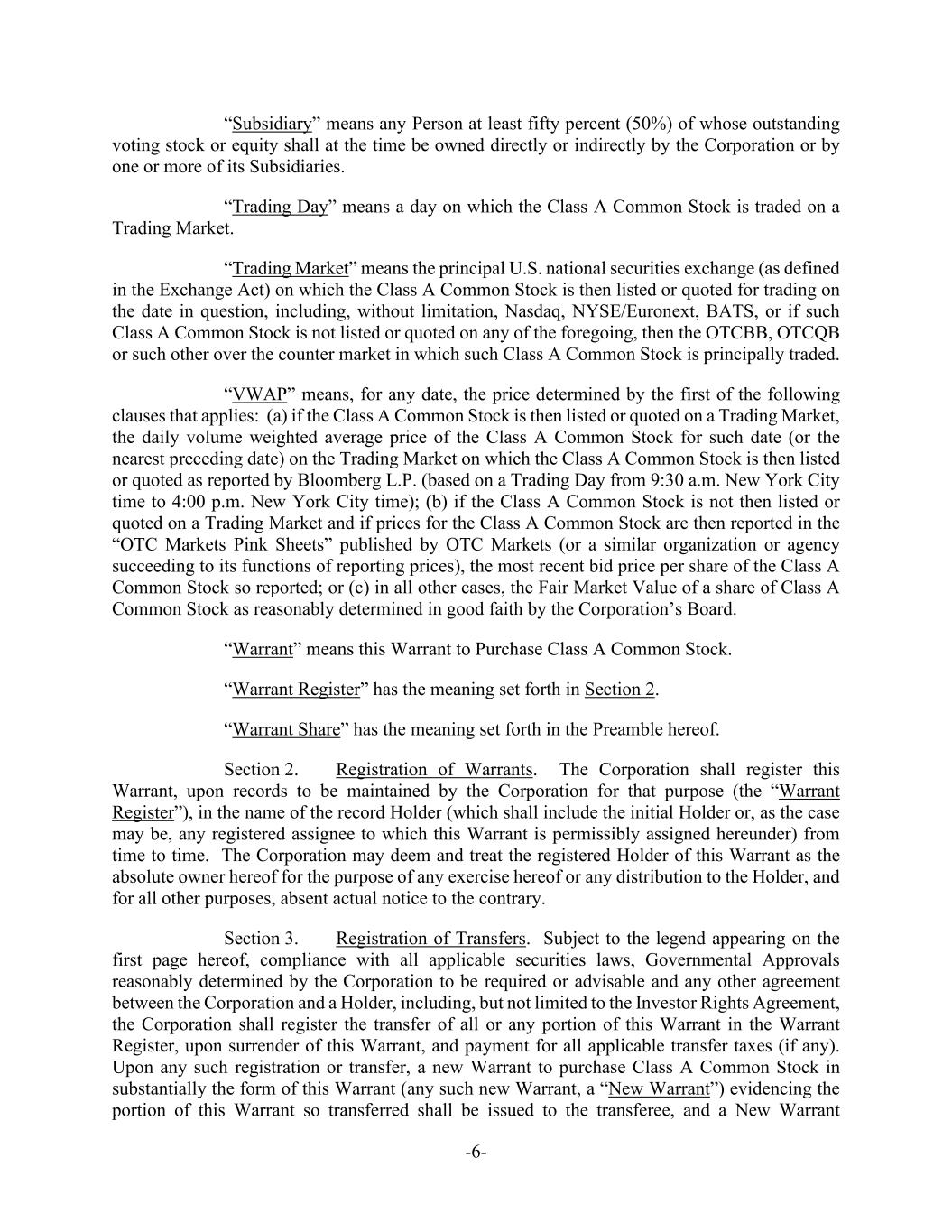 -6- “Subsidiary” means any Person at least fifty percent (50%) of whose outstanding voting stock or equity shall at the time be owned directly or indirectly by the Corporation or by one or more of its Subsidiaries. “Trading Day” means a day on which the Class A Common Stock is traded on a Trading Market. “Trading Market” means the principal U.S. national securities exchange (as defined in the Exchange Act) on which the Class A Common Stock is then listed or quoted for trading on the date in question, including, without limitation, Nasdaq, NYSE/Euronext, BATS, or if such Class A Common Stock is not listed or quoted on any of the foregoing, then the OTCBB, OTCQB or such other over the counter market in which such Class A Common Stock is principally traded. “VWAP” means, for any date, the price determined by the first of the following clauses that applies: (a) if the Class A Common Stock is then listed or quoted on a Trading Market, the daily volume weighted average price of the Class A Common Stock for such date (or the nearest preceding date) on the Trading Market on which the Class A Common Stock is then listed or quoted as reported by Bloomberg L.P. (based on a Trading Day from 9:30 a.m. New York City time to 4:00 p.m. New York City time); (b) if the Class A Common Stock is not then listed or quoted on a Trading Market and if prices for the Class A Common Stock are then reported in the “OTC Markets Pink Sheets” published by OTC Markets (or a similar organization or agency succeeding to its functions of reporting prices), the most recent bid price per share of the Class A Common Stock so reported; or (c) in all other cases, the Fair Market Value of a share of Class A Common Stock as reasonably determined in good faith by the Corporation’s Board. “Warrant” means this Warrant to Purchase Class A Common Stock. “Warrant Register” has the meaning set forth in Section 2. “Warrant Share” has the meaning set forth in the Preamble hereof. Section 2. Registration of Warrants. The Corporation shall register this Warrant, upon records to be maintained by the Corporation for that purpose (the “Warrant Register”), in the name of the record Holder (which shall include the initial Holder or, as the case may be, any registered assignee to which this Warrant is permissibly assigned hereunder) from time to time. The Corporation may deem and treat the registered Holder of this Warrant as the absolute owner hereof for the purpose of any exercise hereof or any distribution to the Holder, and for all other purposes, absent actual notice to the contrary. Section 3. Registration of Transfers. Subject to the legend appearing on the first page hereof, compliance with all applicable securities laws, Governmental Approvals reasonably determined by the Corporation to be required or advisable and any other agreement between the Corporation and a Holder, including, but not limited to the Investor Rights Agreement, the Corporation shall register the transfer of all or any portion of this Warrant in the Warrant Register, upon surrender of this Warrant, and payment for all applicable transfer taxes (if any). Upon any such registration or transfer, a new Warrant to purchase Class A Common Stock in substantially the form of this Warrant (any such new Warrant, a “New Warrant”) evidencing the portion of this Warrant so transferred shall be issued to the transferee, and a New Warrant